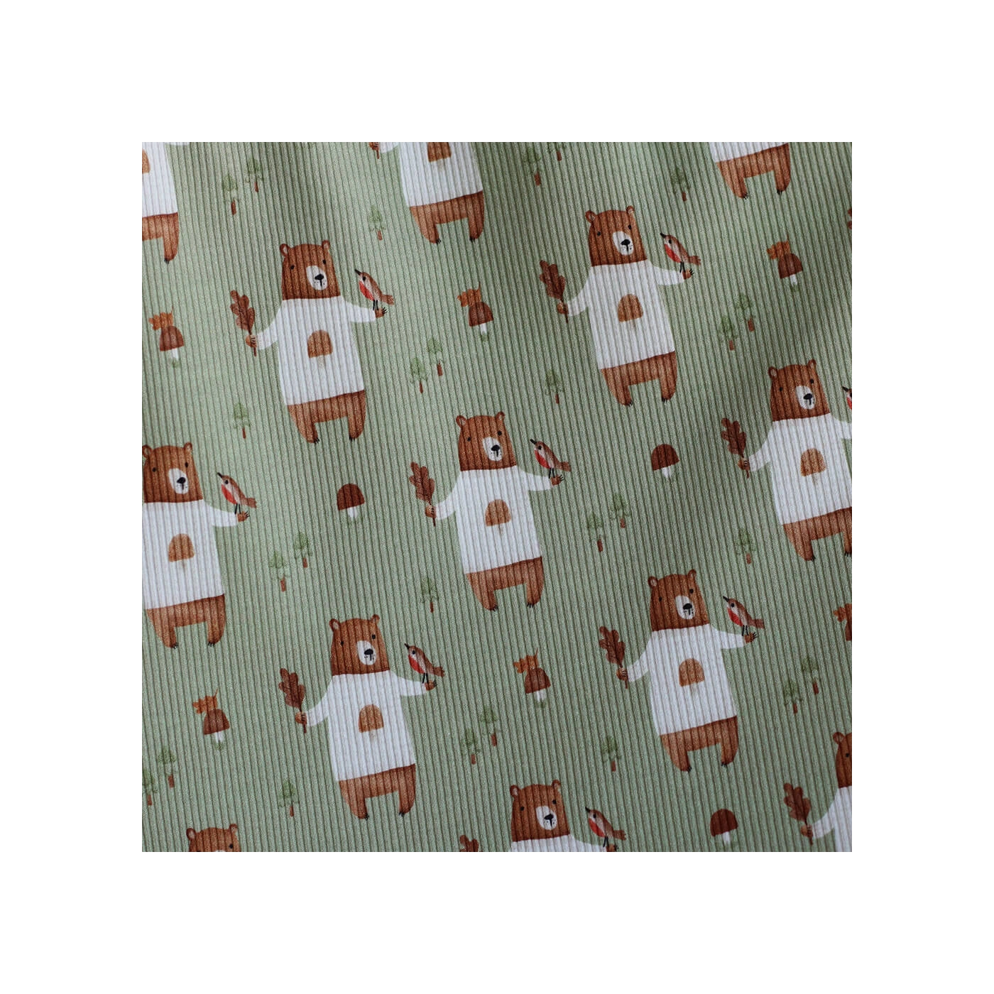 Ce jersey coton à fines côtes séduit par son motif plein de douceur et son joli fond vert sauge, à la fois naturel, apaisant et facile à associer. On y retrouve de petits ours brun noisette vêtus d’un pull écru, accompagnés de petits oiseaux rouge brique, de feuillages et de quelques détails inspirés de la forêt. Les fines côtes apportent un léger relief vertical qui enrichit visuellement le tissu tout en conservant une belle souplesse. Avec ses 230 g/m2, cette maille offre un excellent équilibre entre confort, tenue et élasticité.