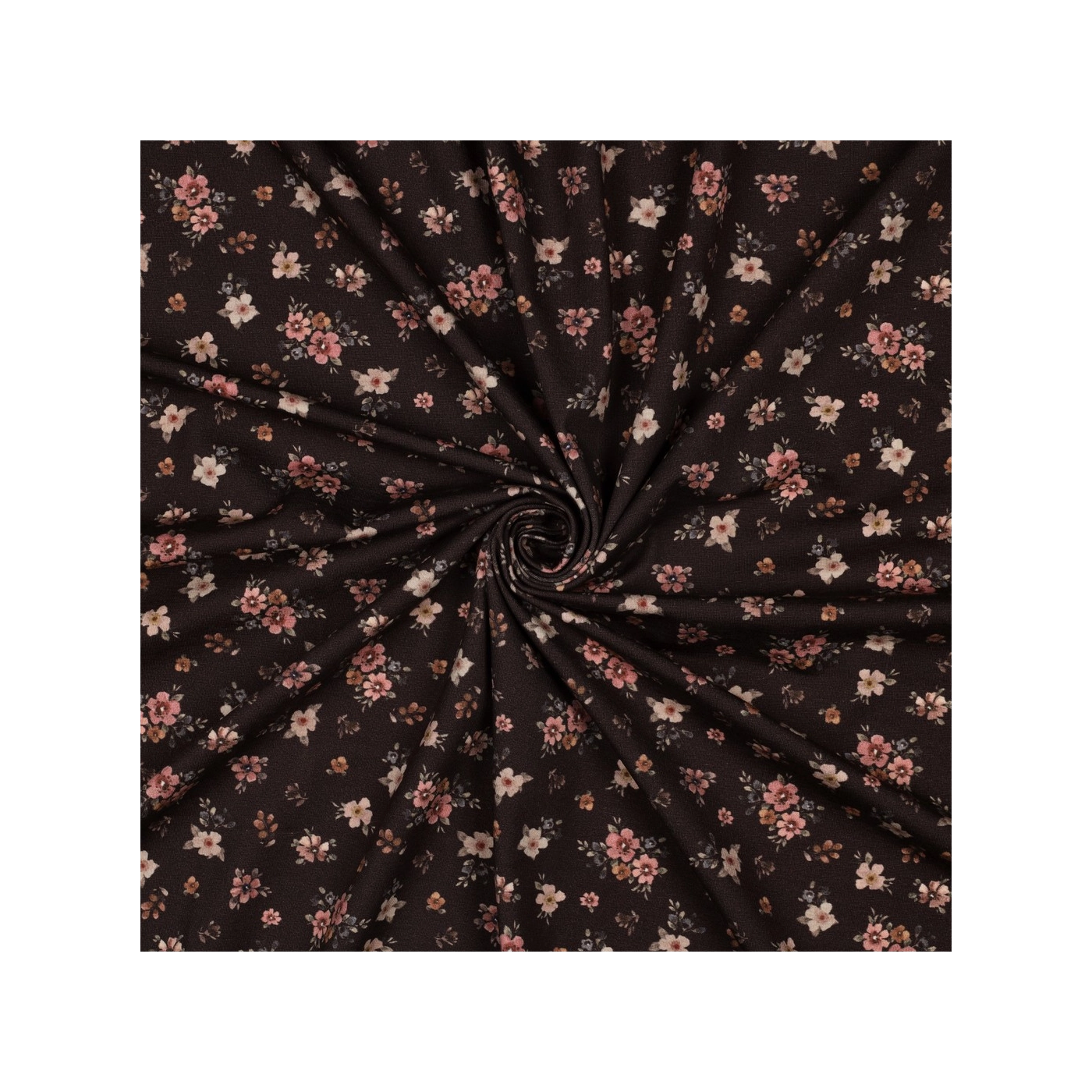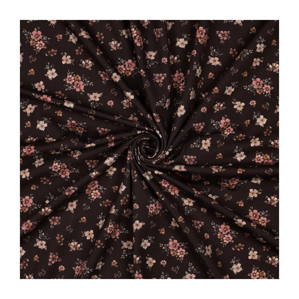 Ce jersey de coton, variante plus aérée de la version dense, présente un motif de petits bouquets fleuris délicats et espacés sur un fond brun foncé. Chaque bouquet associe quelques fleurs stylisées dans des tons vieux rose, rose poudré, crème et ocre doré, ponctués de petites feuilles vert sauge. Le fond brun domine davantage et donne un rendu plus graphique et vintage. Avec sa largeur de 148 cm et son grammage de 200 g/m², c'est un jersey polyvalent pour toute la garde-robe.