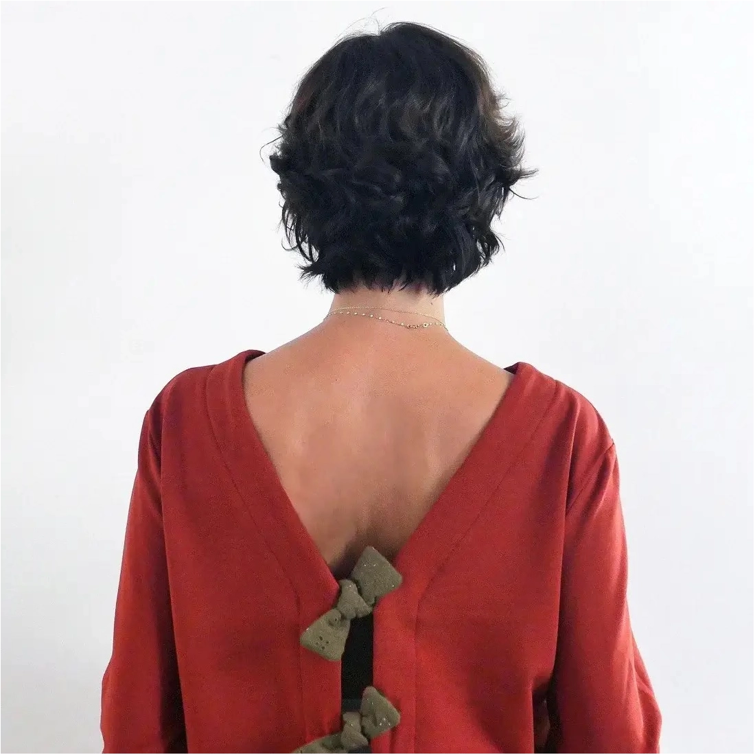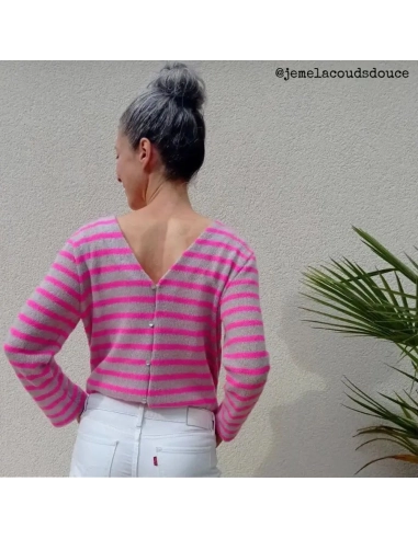 Gilet qui se porte indifféremment avec ouverture devant ou dos. 2 options : ouverture en V devant ou au dos. 1 longueur : mi-hanches (le gilet peut être raccourci jusqu'aux hanches... recommandé pour la version avec noeuds dans le dos). Ouverture devant ou dos par nœuds, boutons et brides ou fermeture à glissière. La coupe permet un enfilage sans ouvrir le gilet. Enforme ouverture et encolure. Bas de manches et corps avec ourlet. Sans poches.