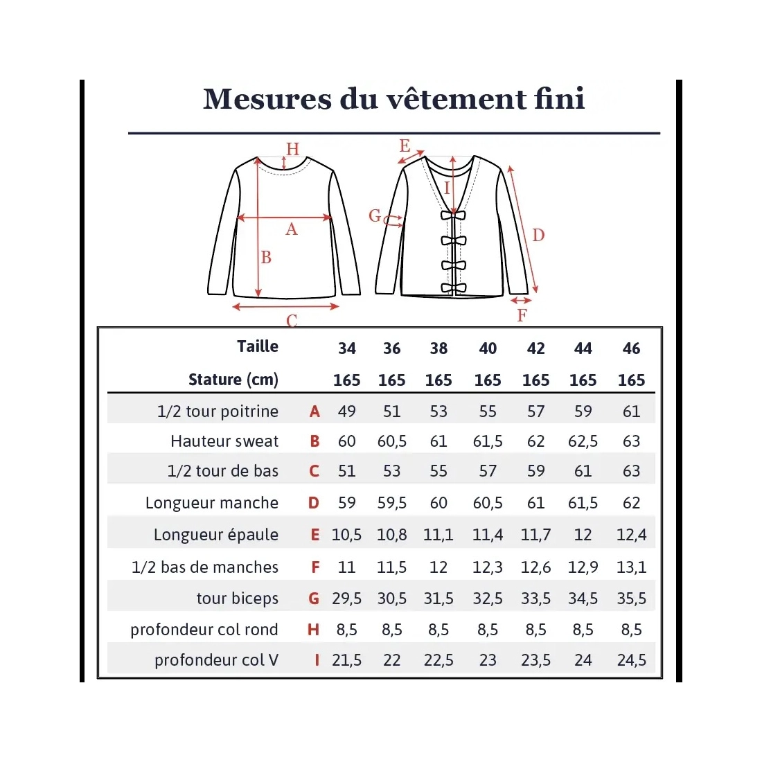 Gamme de tailles : 34, 36, 38, 40, 42, 44, 46