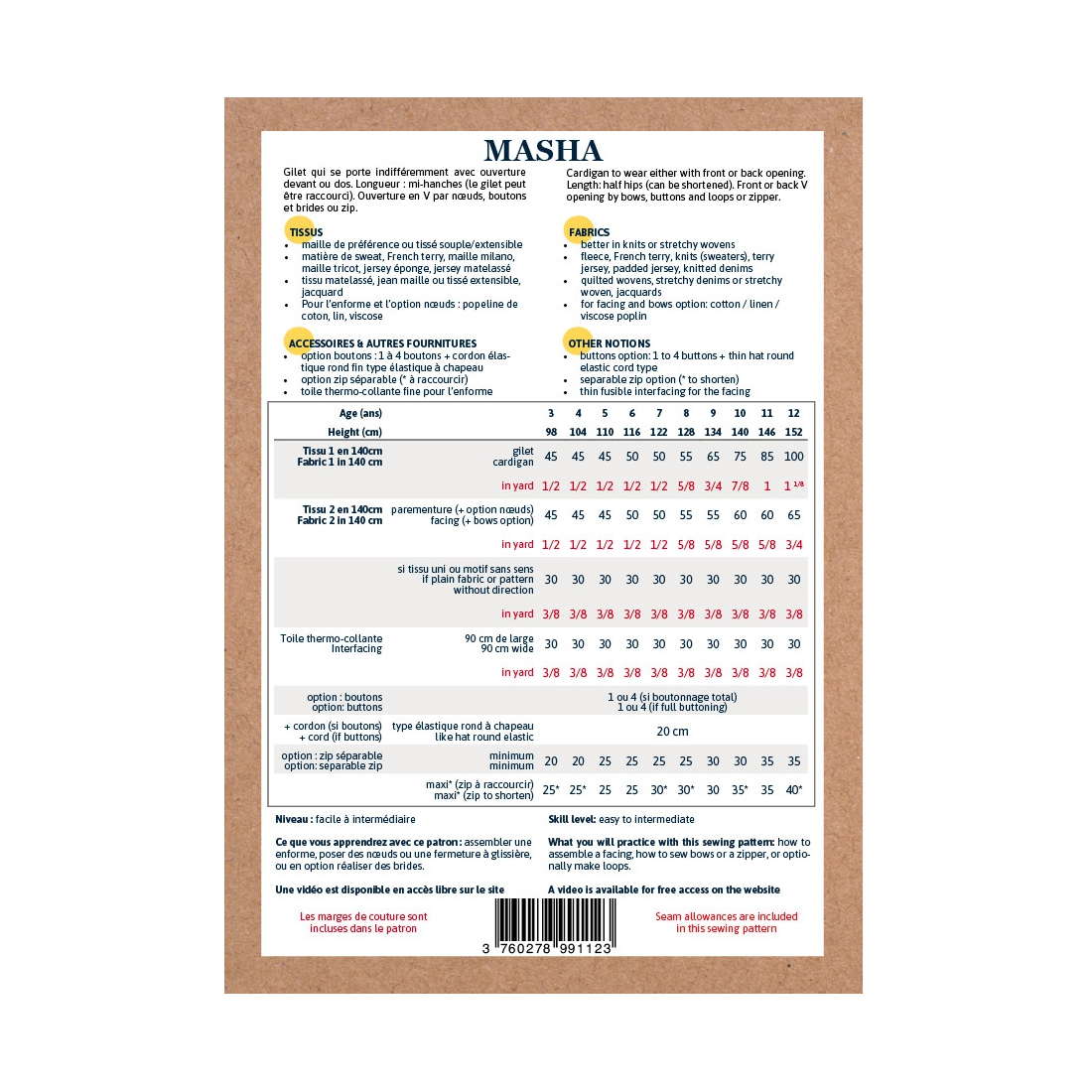 Pochette patron de Couture version papier Enfant Fille de 3 à 12 ans