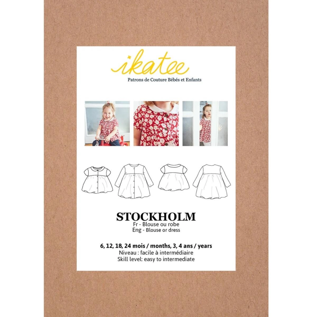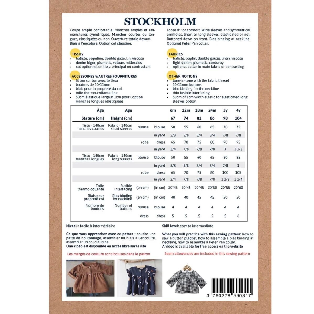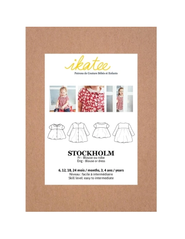 Stockholm est un patron de blouse et de robe pour bébé. La coupe ainsi que les manches sont amples afin d’apporter un maximum de confort. Le patron dispose d’une ouverture totale sur le devant et d’un biais à l’encolure. Les manches peuvent être longues ou courtes, élastiquées ou non. Enfin, il vous sera possible d’ajouter un col Claudine.