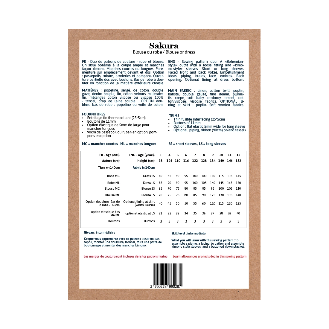 Deux longueurs sont proposées sur ce patron : blouse ou robe (au dessus du genou).
