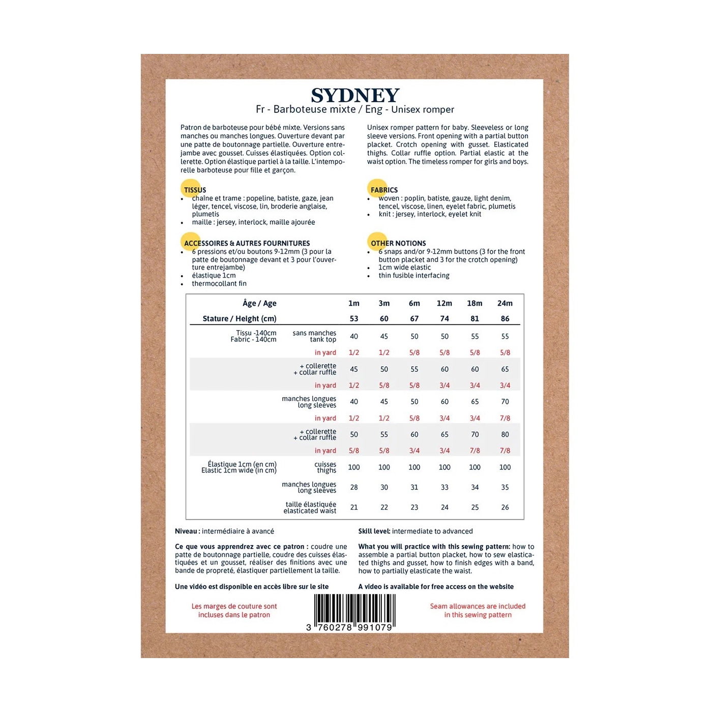 Ce patron est proposé avec une ouverture à l’entrejambe ainsi qu’une patte de boutonnage partielle devant.