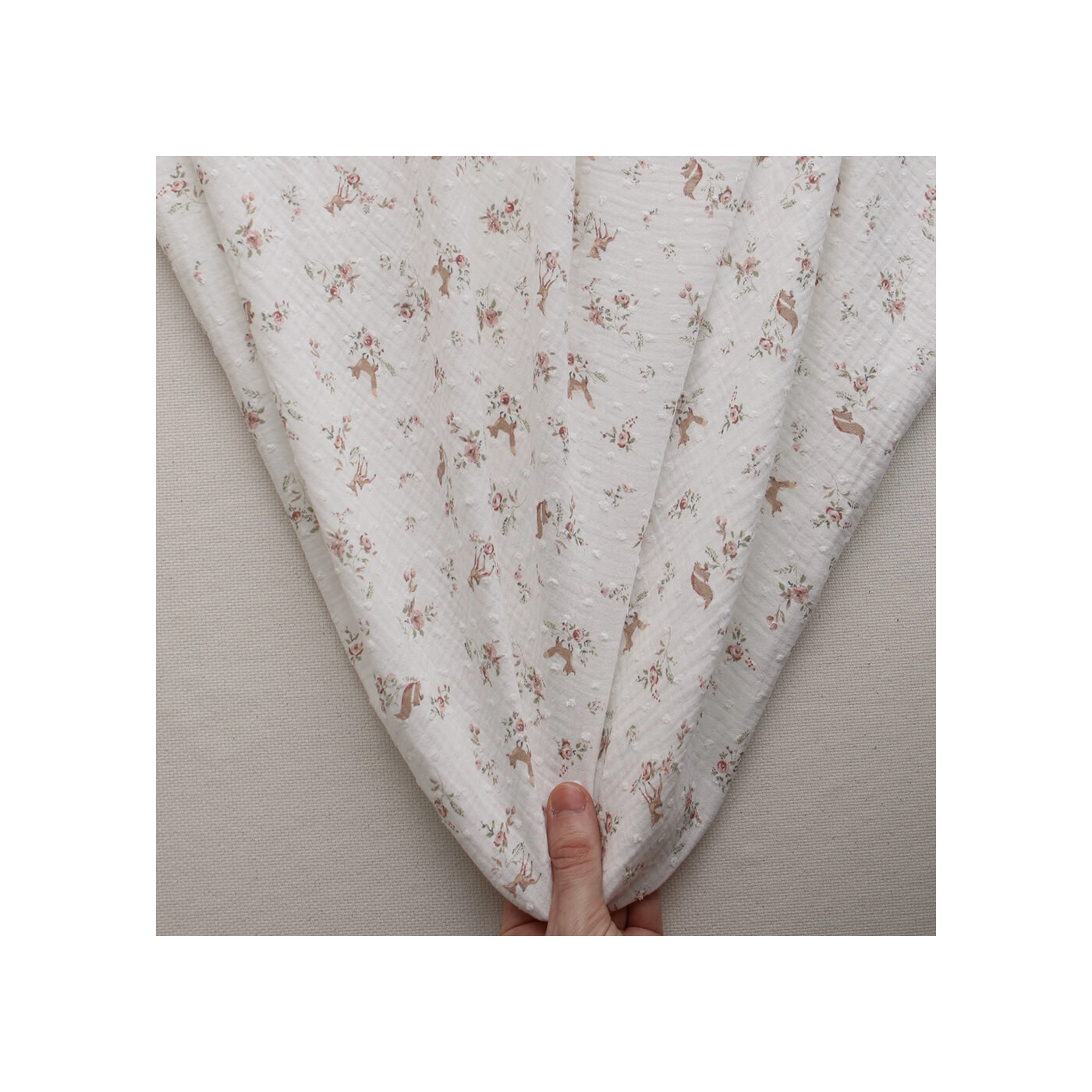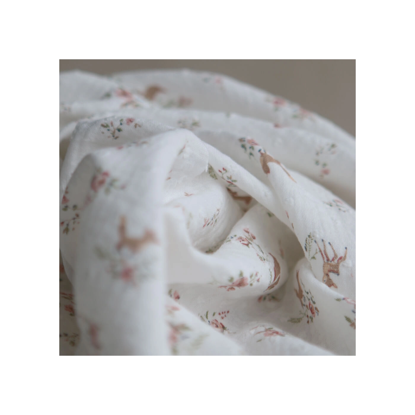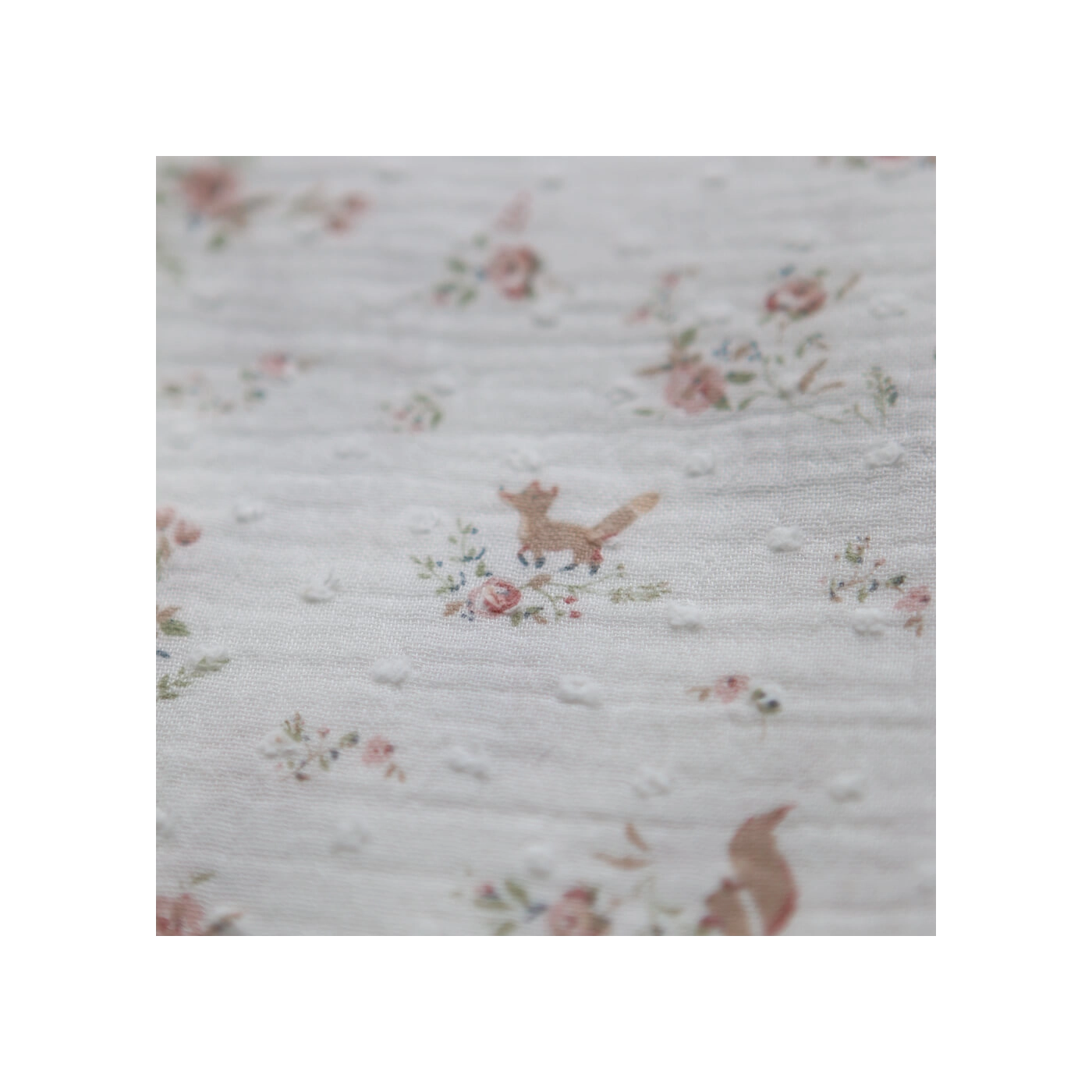 - Coloris fond blanc lait motif fleuri renard et écureuils, teintes de rose, vert et beige