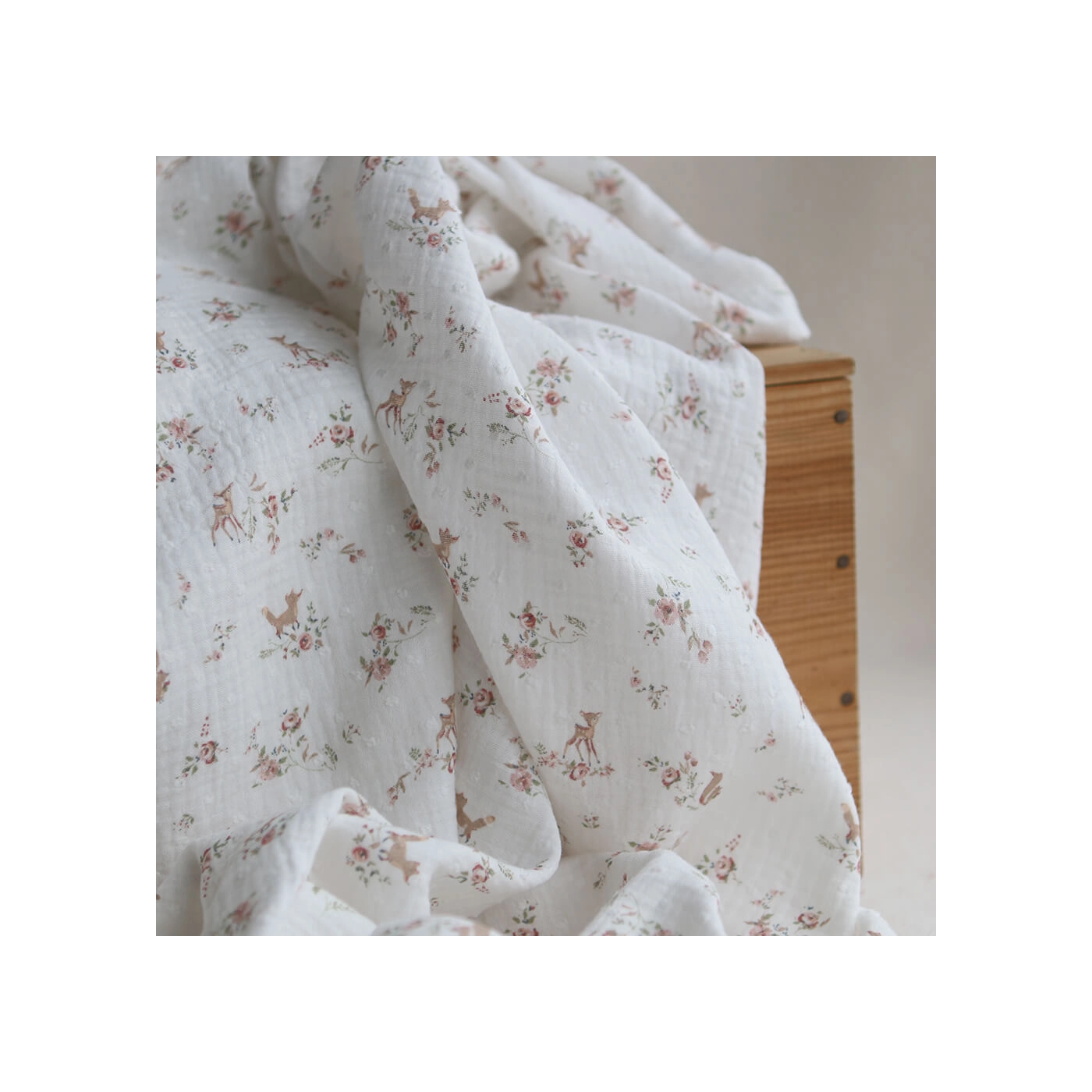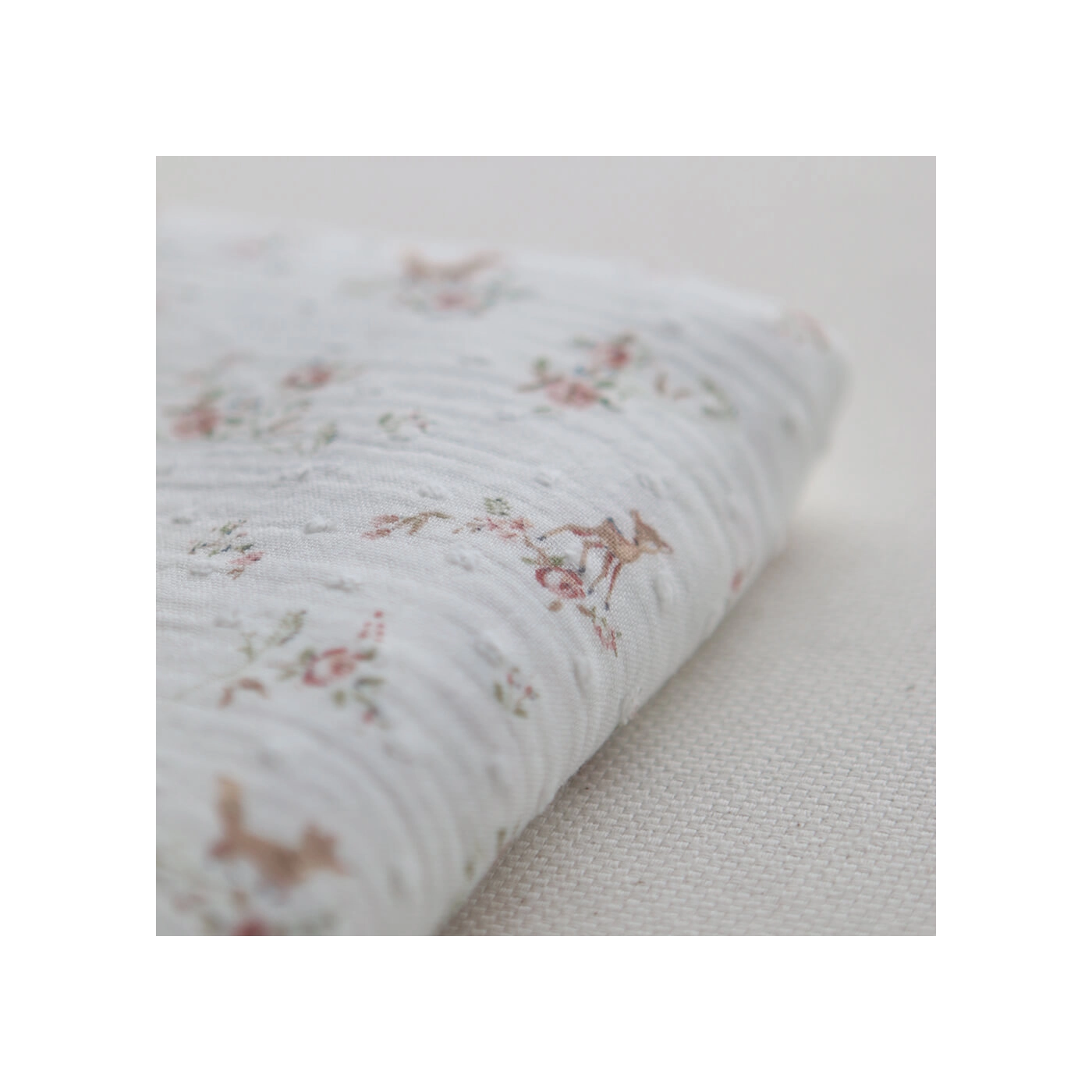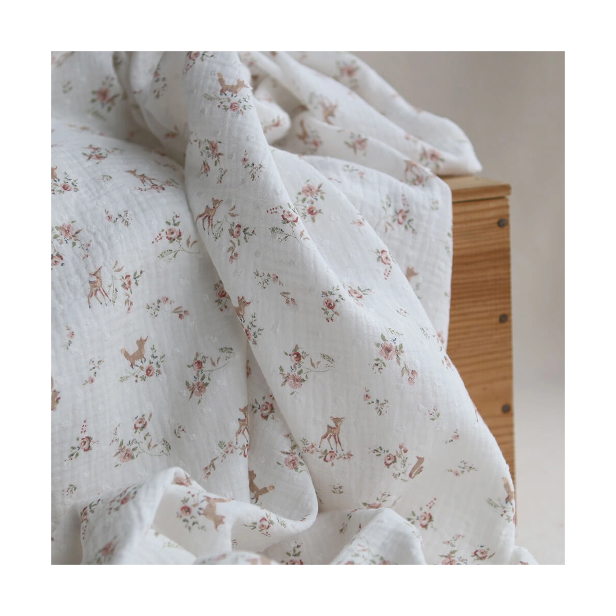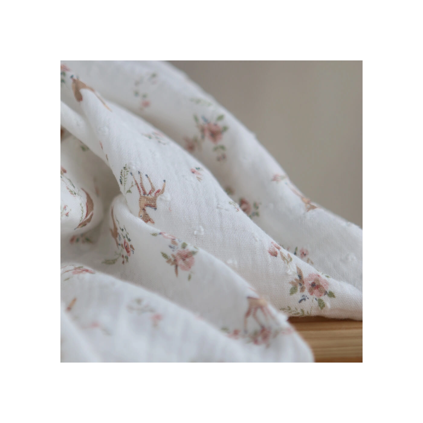 - Coloris fond blanc lait motif fleuri renard et écureuils, teintes de rose, vert et beige