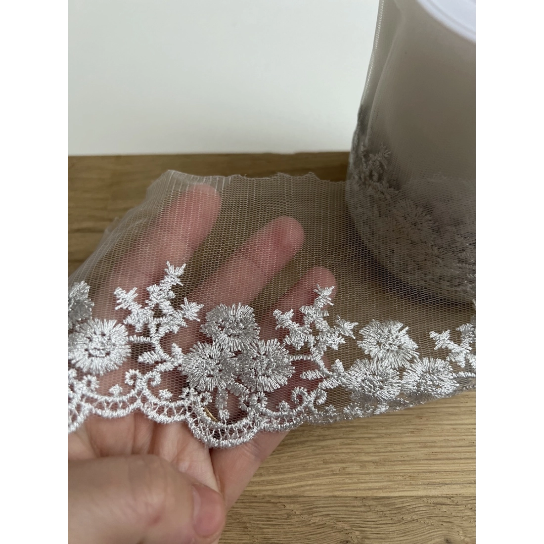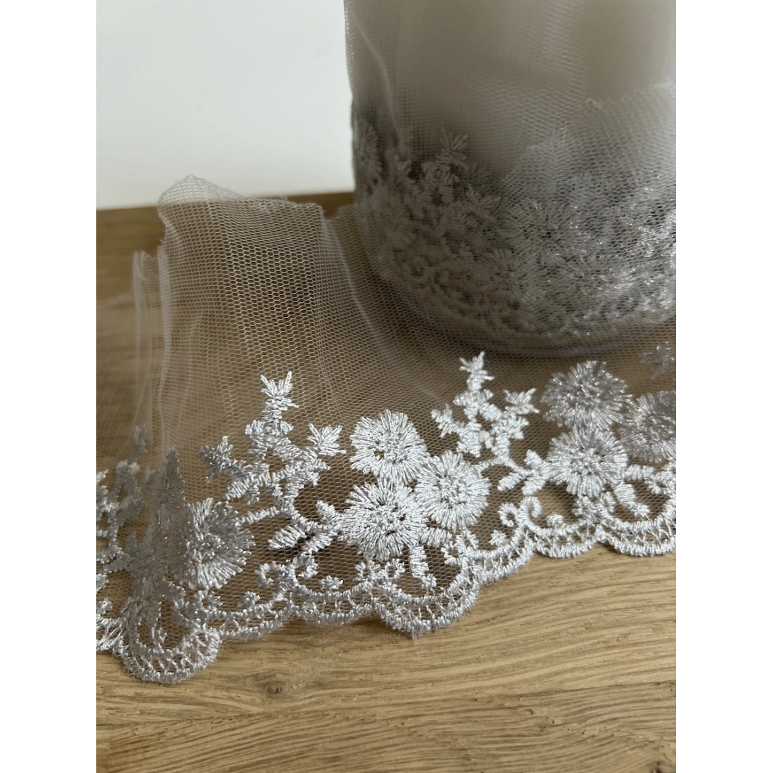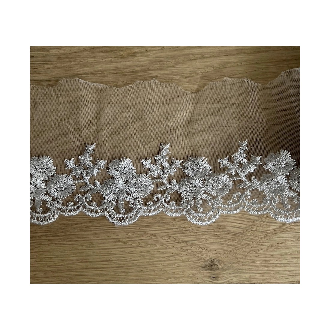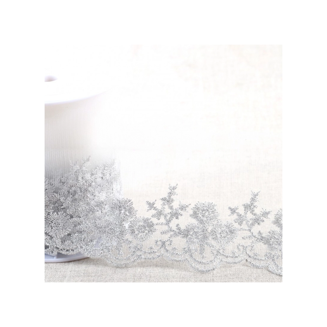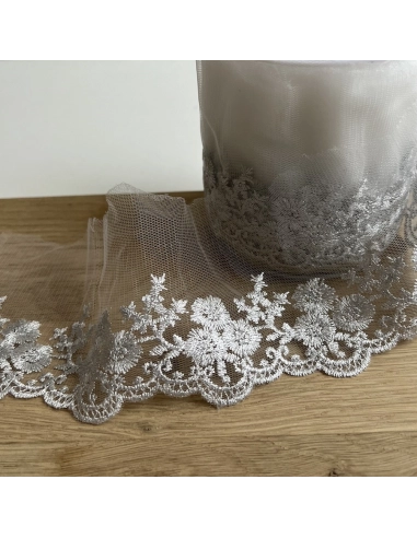 Ce galon brodé d'un éclat argenté sur une base délicate de tulle est l'ornement parfait pour vos confections haute couture.