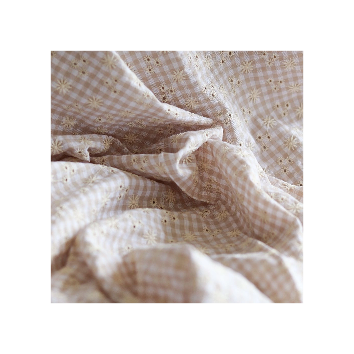 Seersucker / Coton gaufré vichy blanc et sable broderie