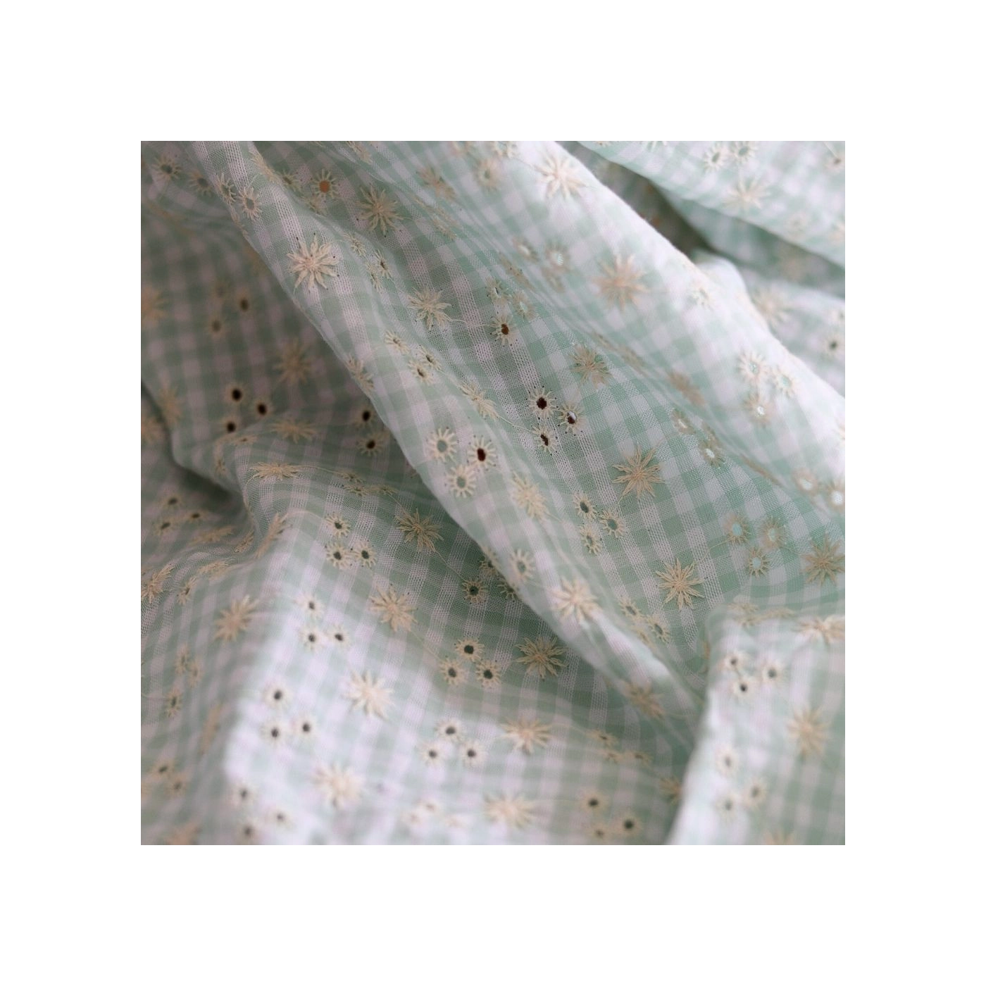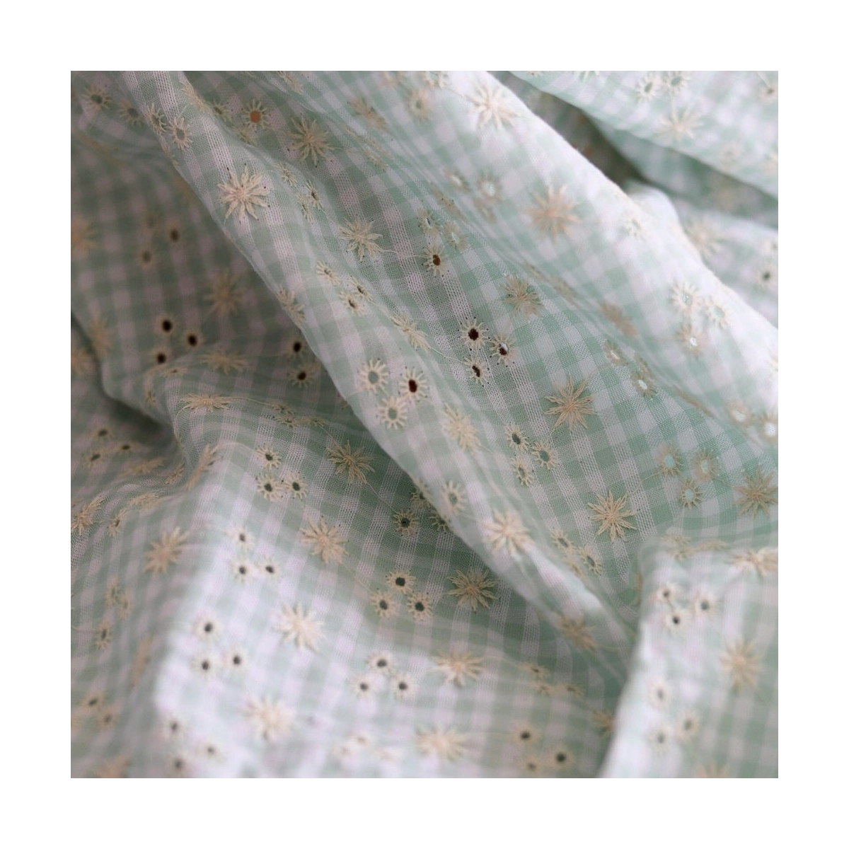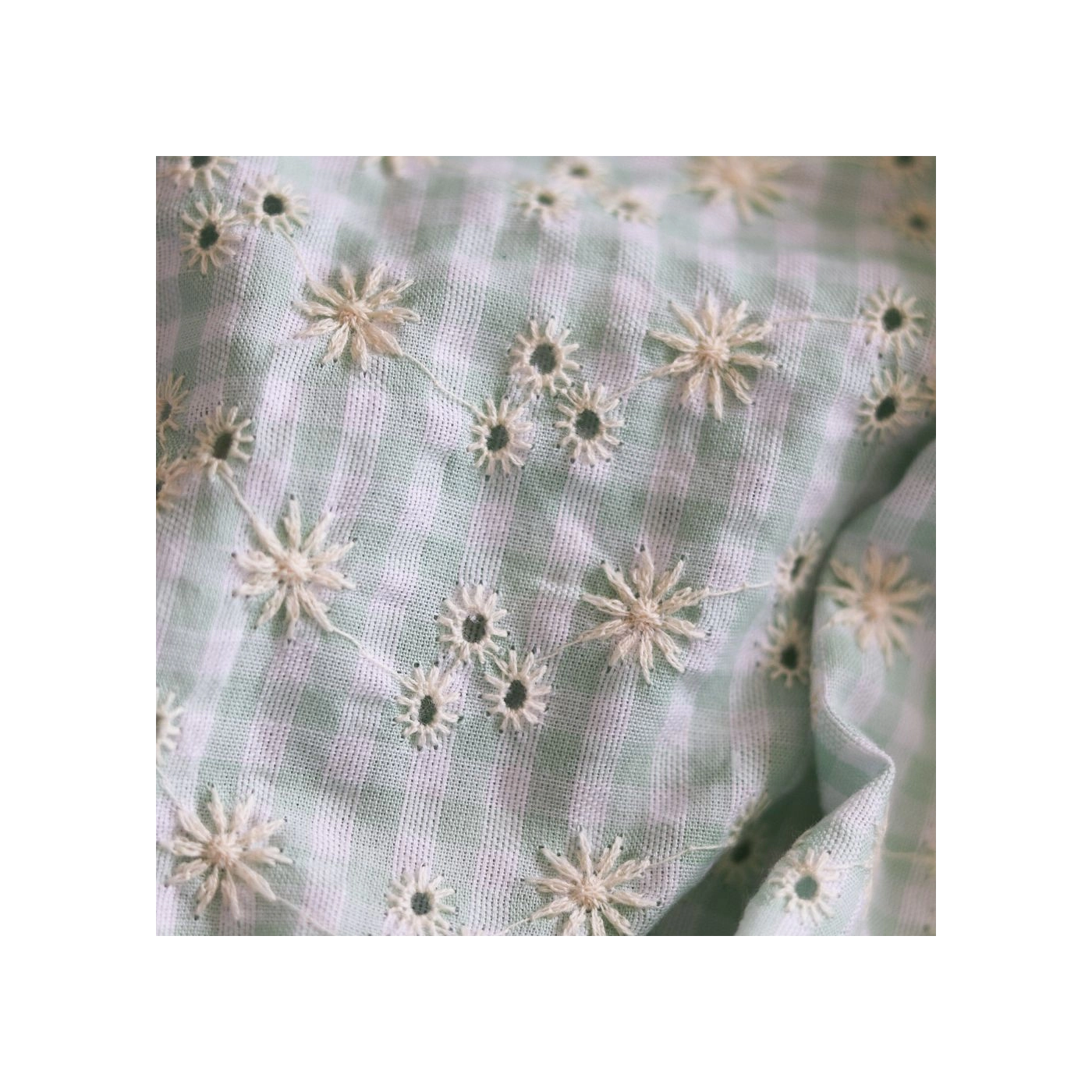 Seersucker / Coton gaufré vichy blanc et vert d'eau broderie