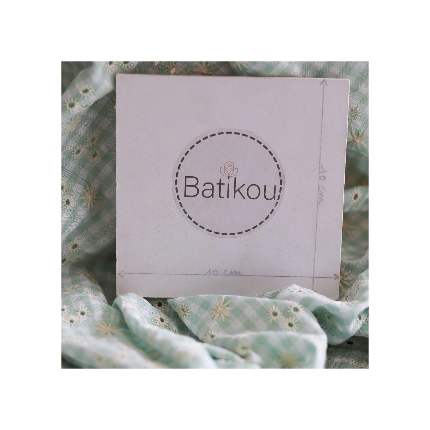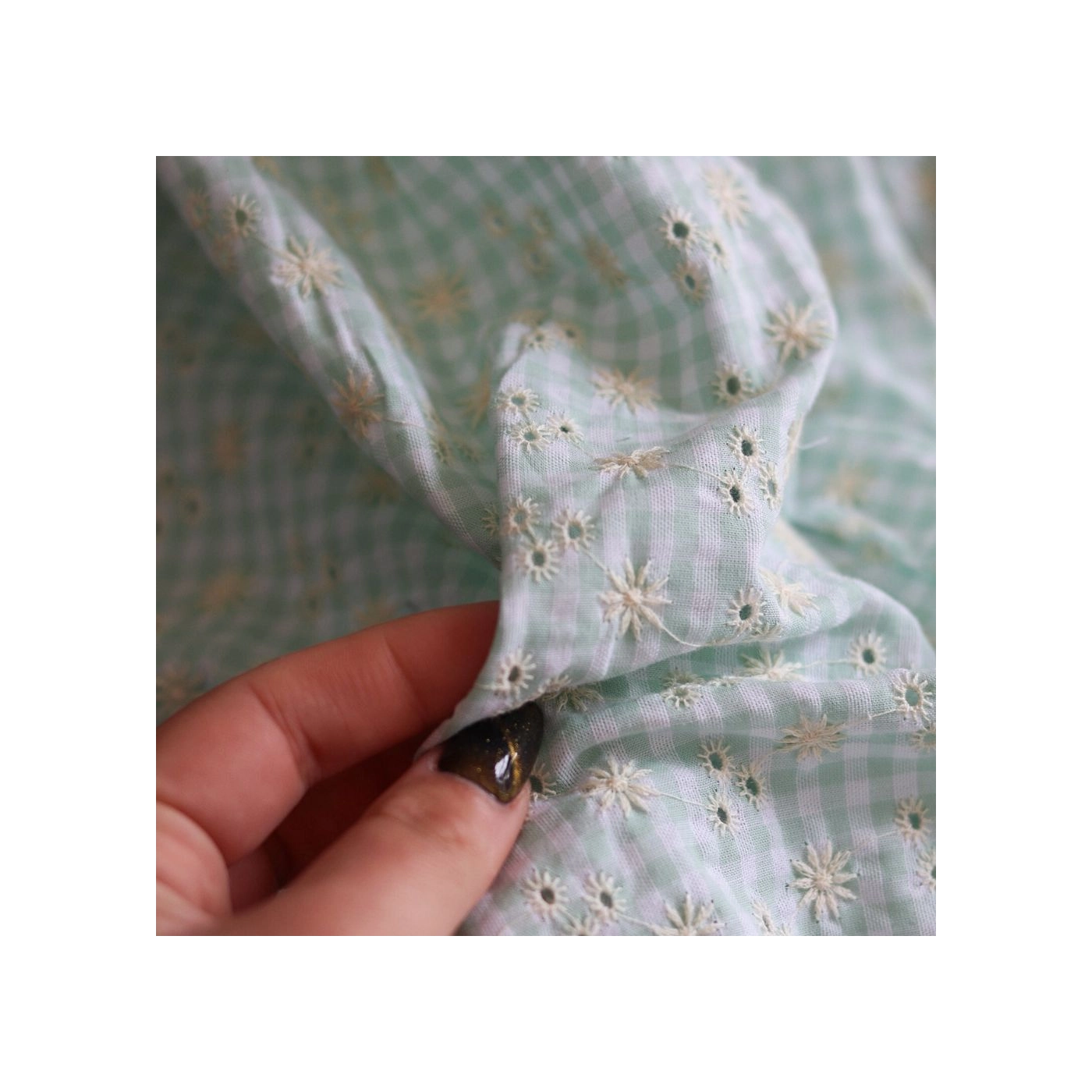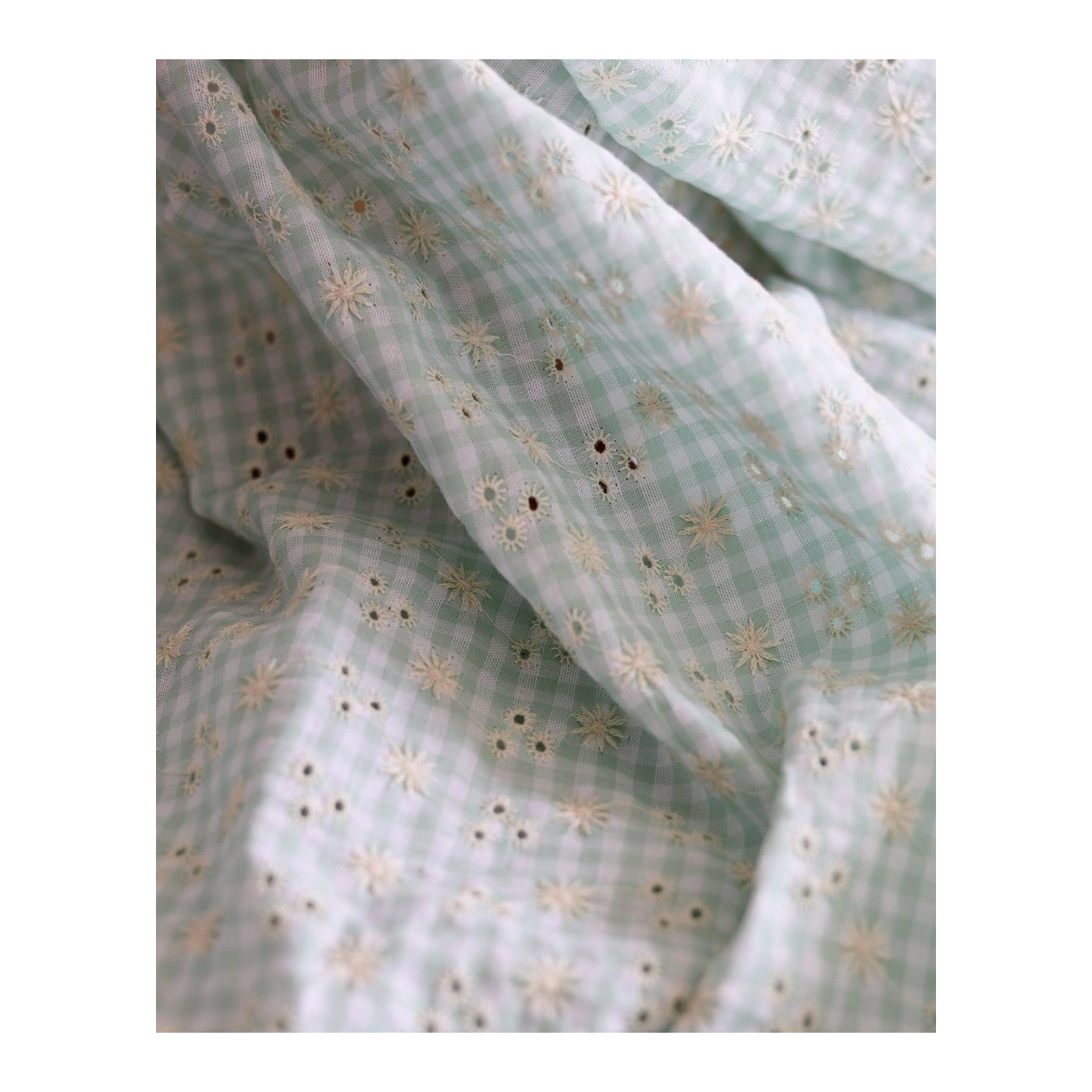 Seersucker / Coton gaufré vichy blanc et vert d'eau broderie