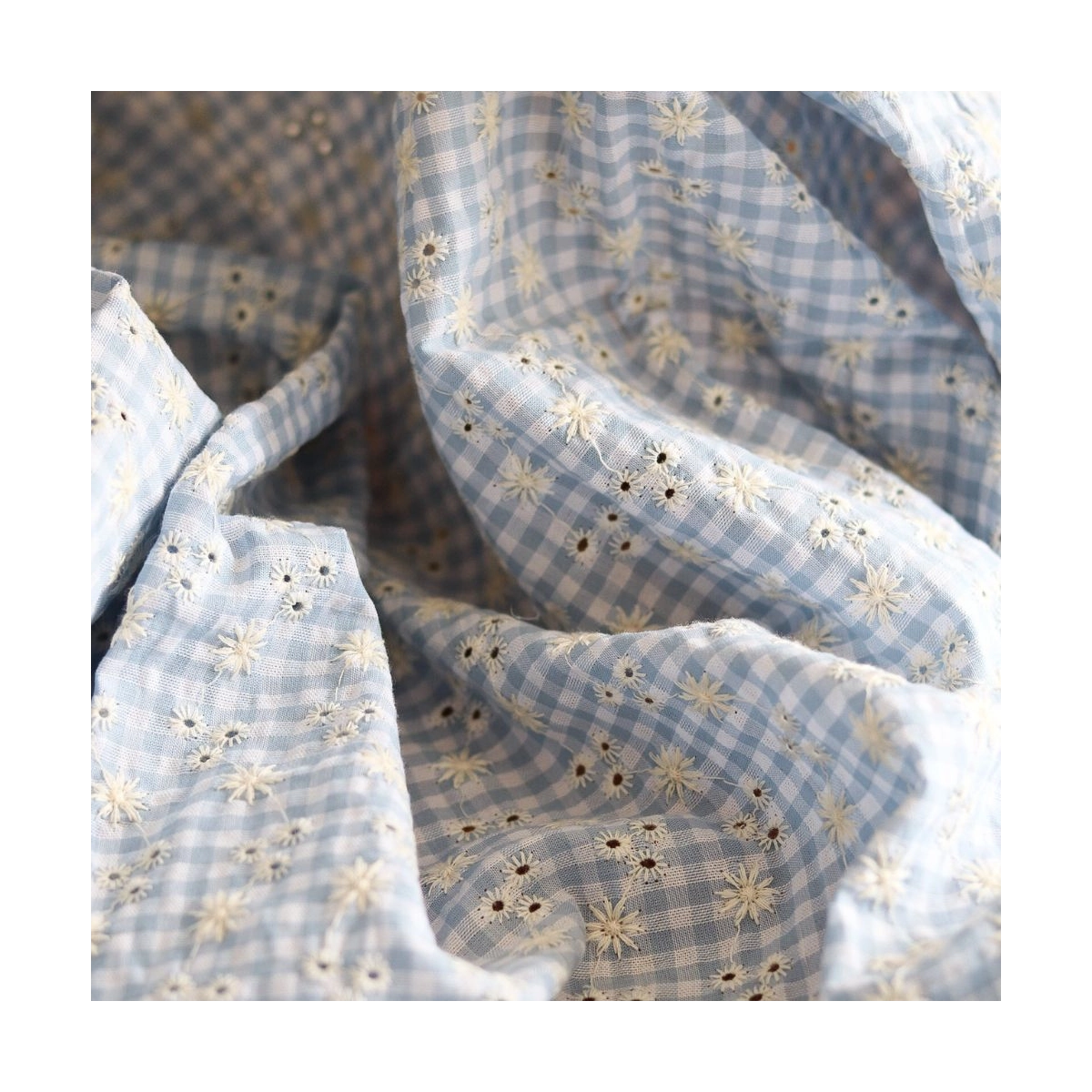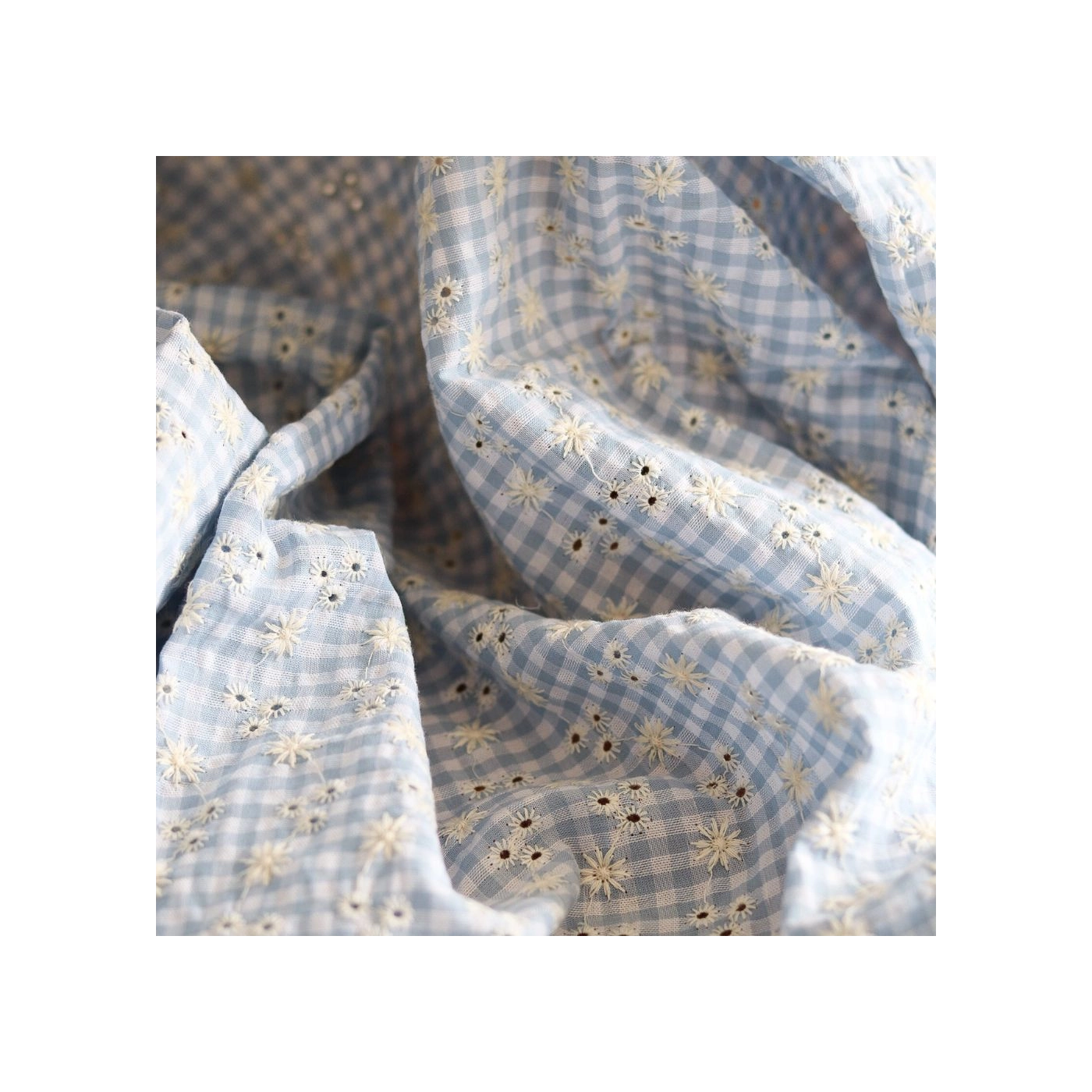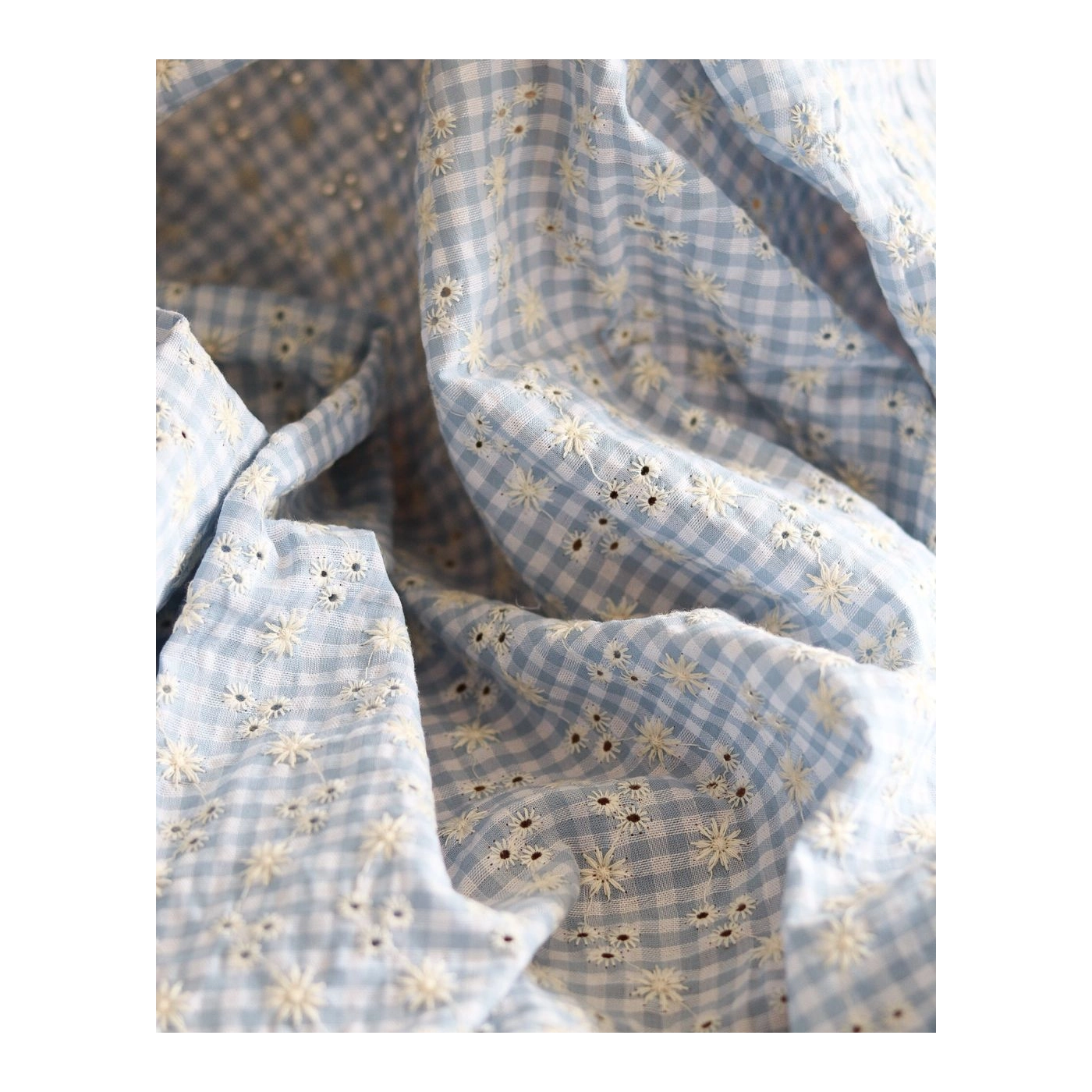 Seersucker / Coton gaufré vichy blanc et bleu ciel broderie