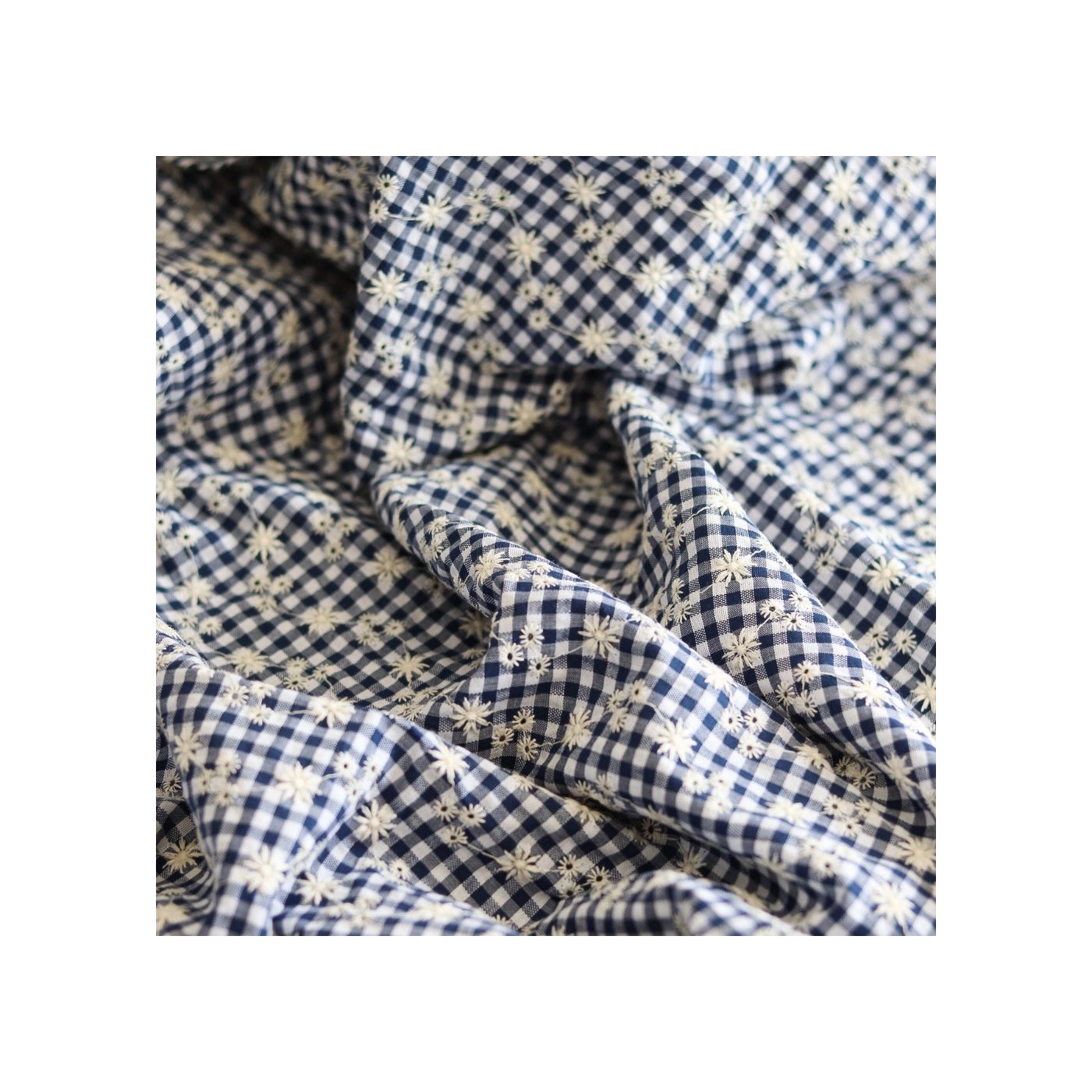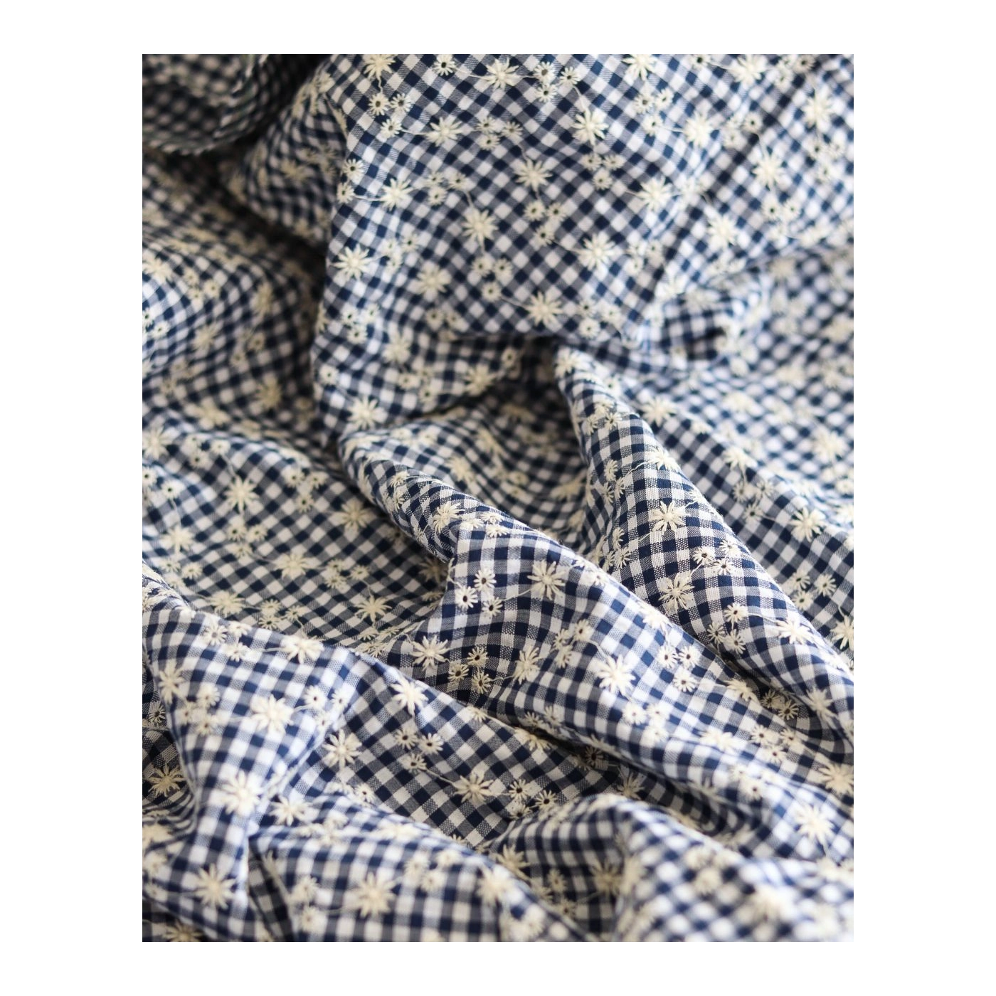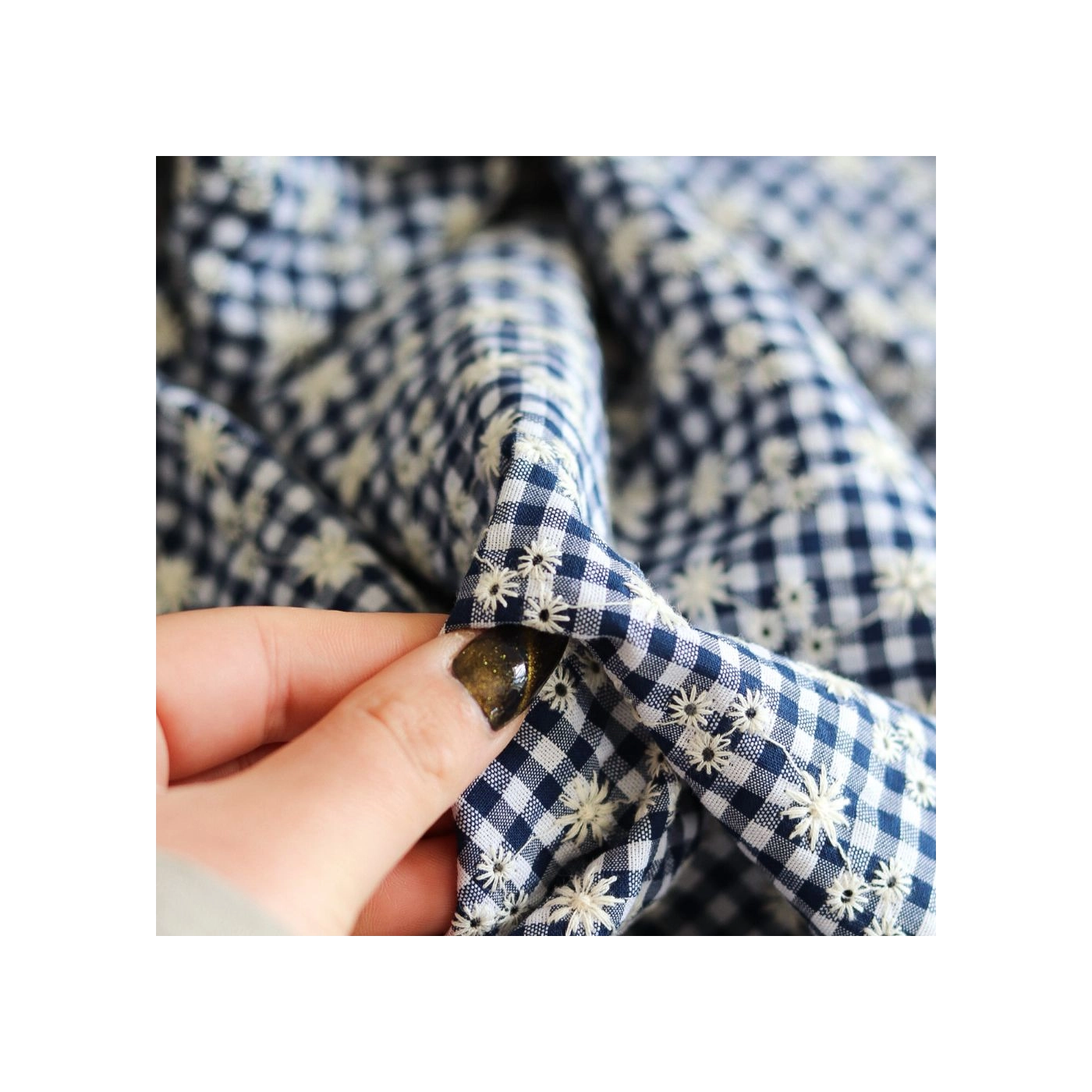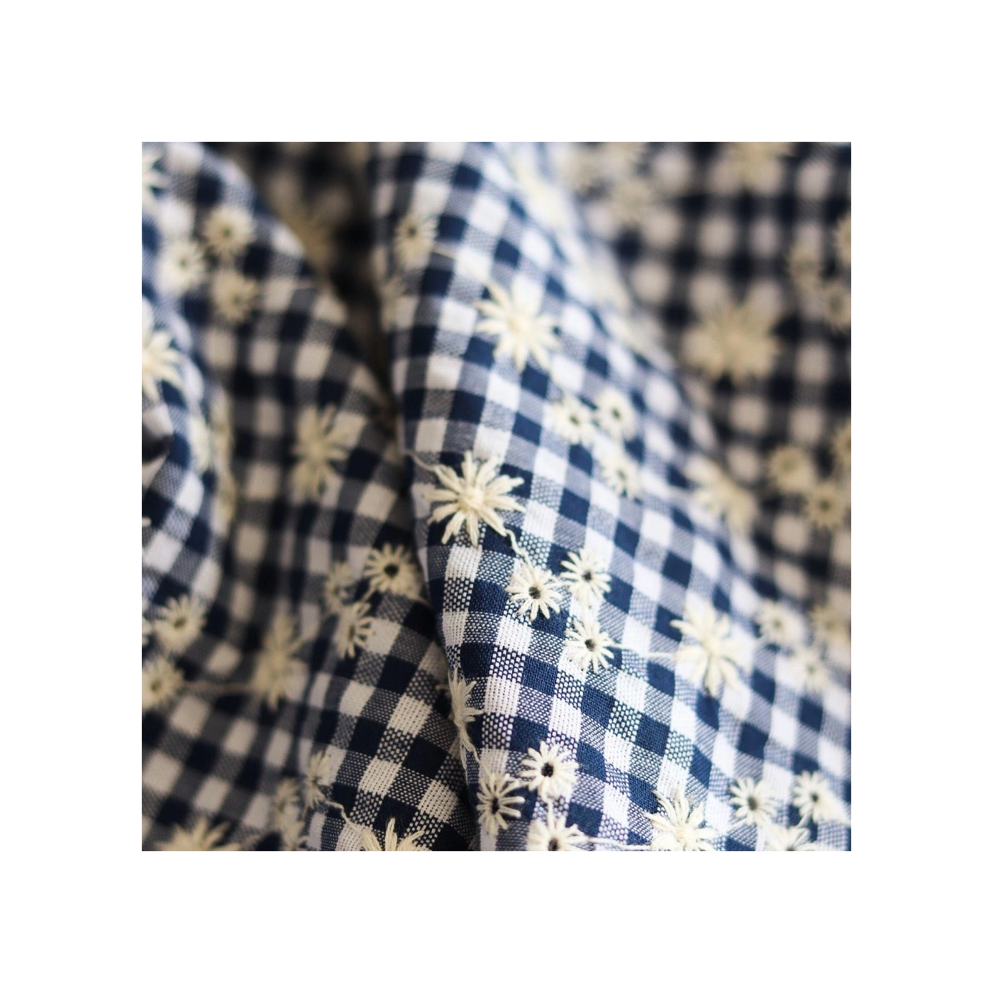 Seersucker / Coton gaufré vichy blanc et bleu marine broderie