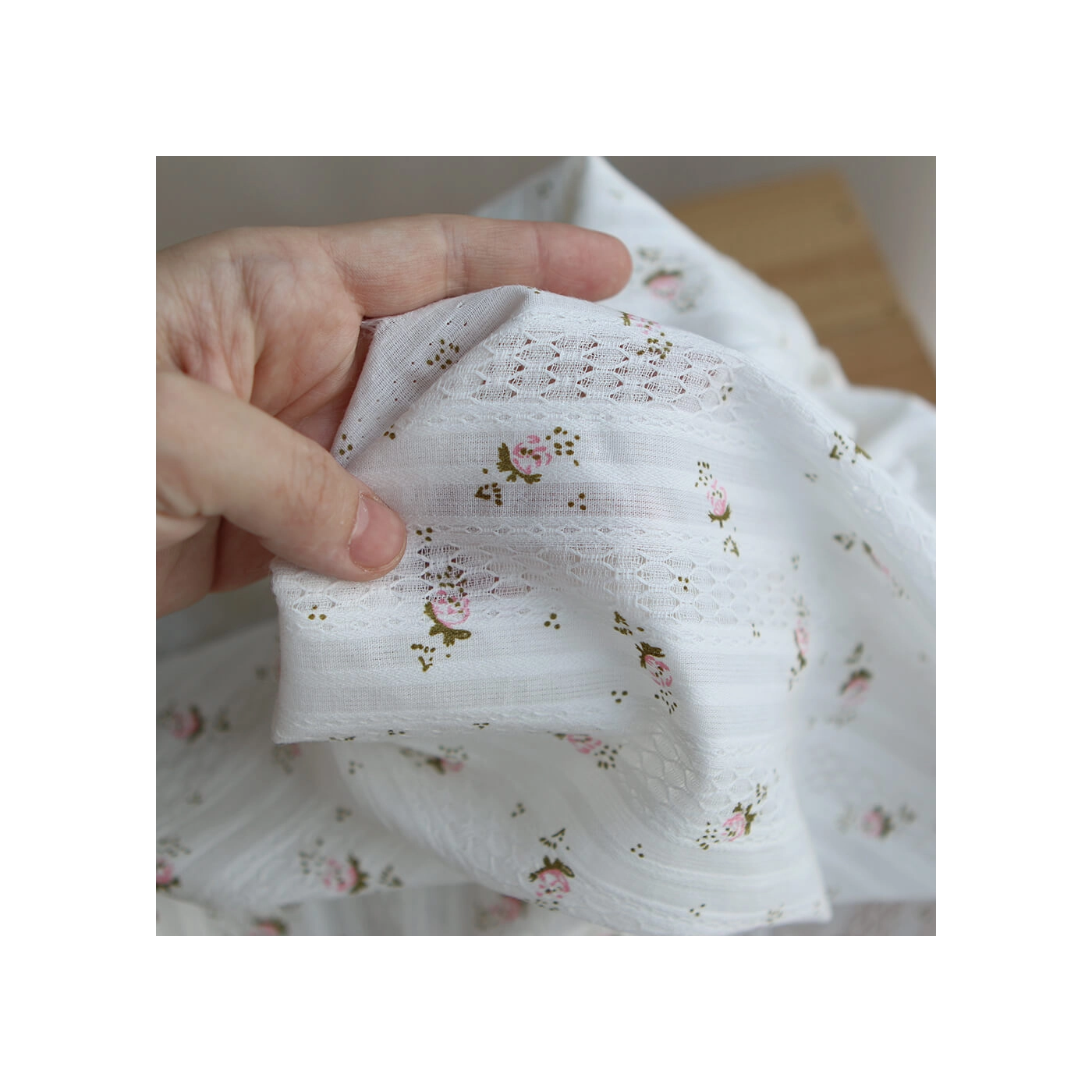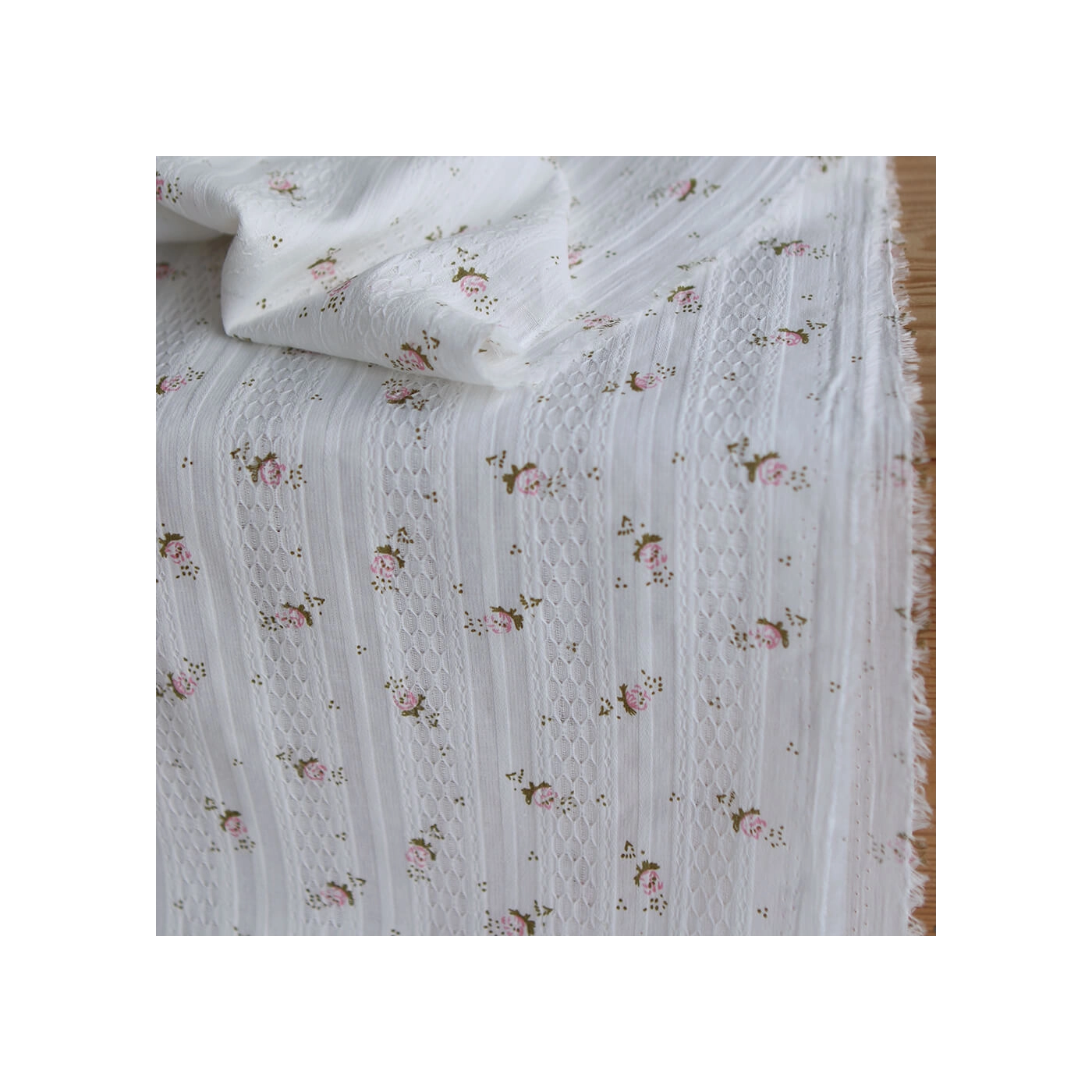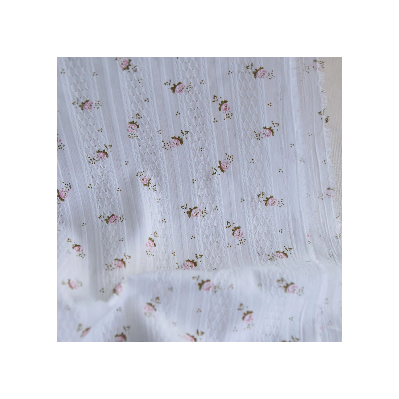 Ce tissu est un coton jacquard de 96 gr/m2. Son tissage lui apporte un relief subtil et une texture plus travaillée qu’un coton lisse classique, tout en conservant de la souplesse et un tombé agréable. On retrouve sur ce modèle un fond blanc lumineux, parcouru de petites fleurs dans des tons rose et de feuillages vert sauge. Avec sa largeur de 140 cm, il convient à de nombreux projets couture, aussi bien pour l’habillement que pour des accessoires délicats.