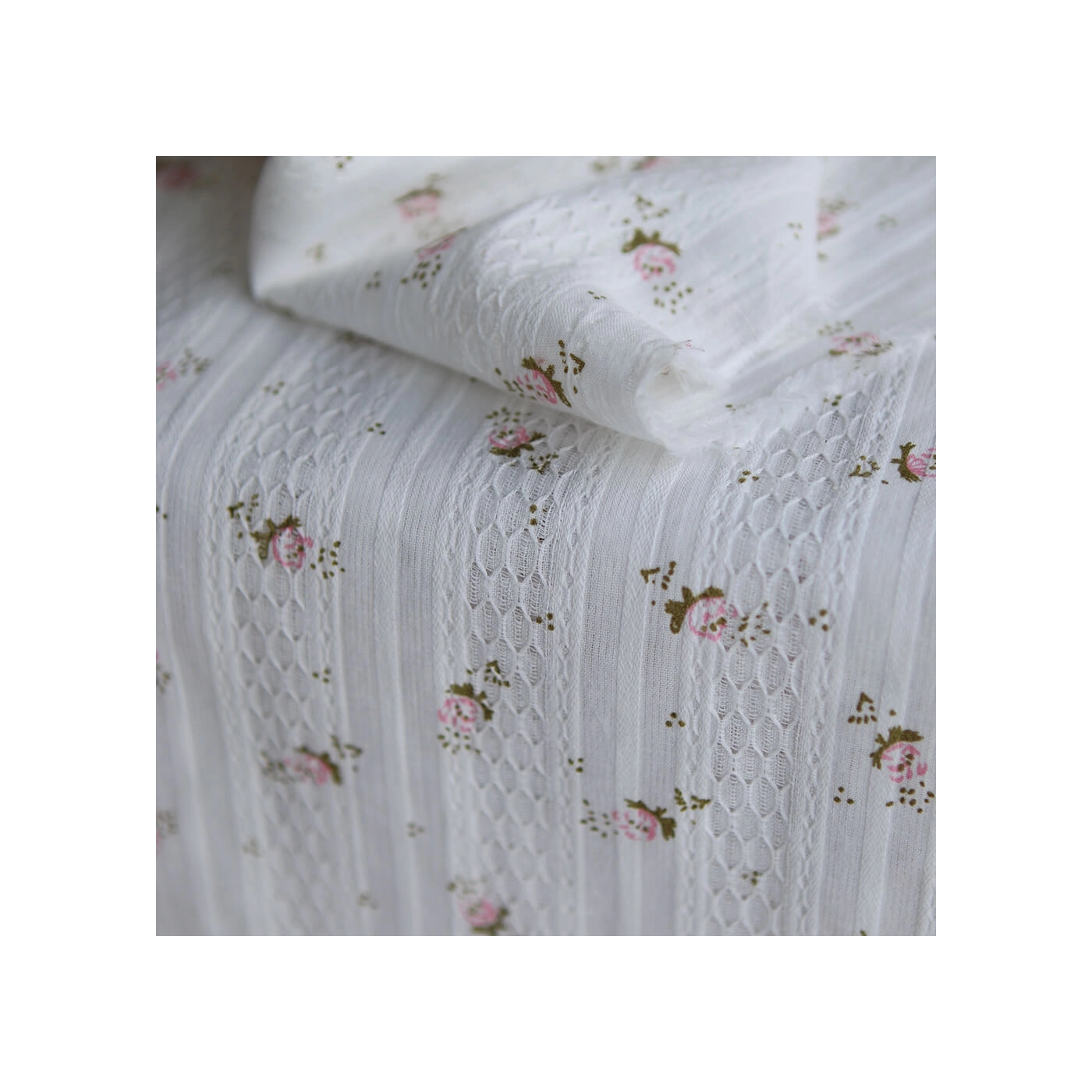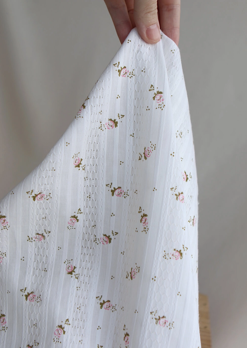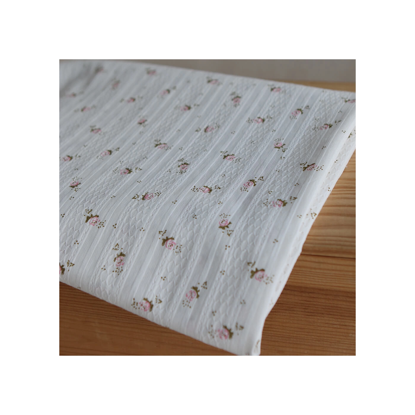 Ce tissu est un coton jacquard de 96 gr/m2. Son tissage lui apporte un relief subtil et une texture plus travaillée qu’un coton lisse classique, tout en conservant de la souplesse et un tombé agréable. On retrouve sur ce modèle un fond blanc lumineux, parcouru de petites fleurs dans des tons rose et de feuillages vert sauge. Avec sa largeur de 140 cm, il convient à de nombreux projets couture, aussi bien pour l’habillement que pour des accessoires délicats.