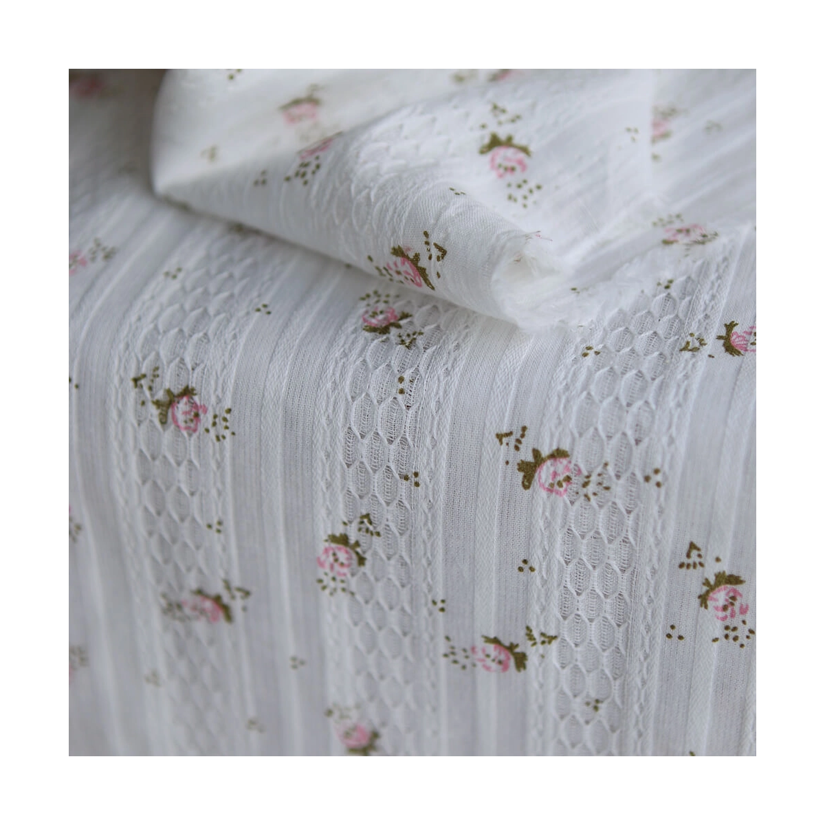 Avec son fond écru doux, ses petites fleurs jaune fané et vert sauge, et son relief discret en lignes ondulées, ce tissu est un très beau choix pour des créations élégantes, légères et pleines de finesse.