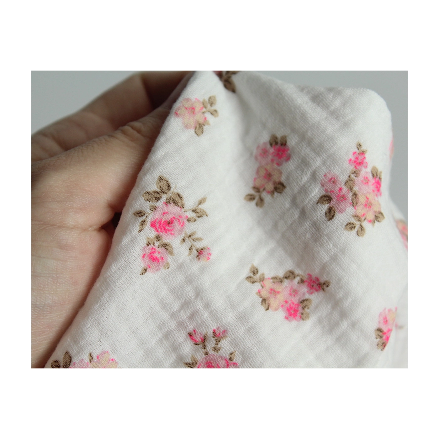 Sara - Double gaze de coton BIO blanc cassé motif exclusif bouquets fluo