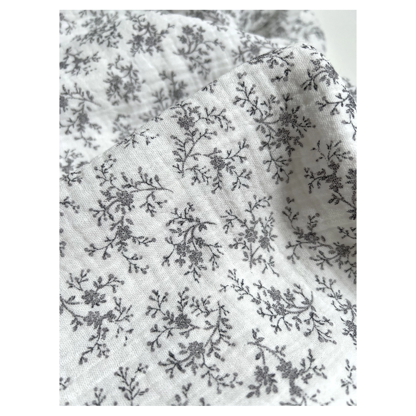 Meriem - Double gaze de coton BIO exclusif blanc à motifs fleuris gris
