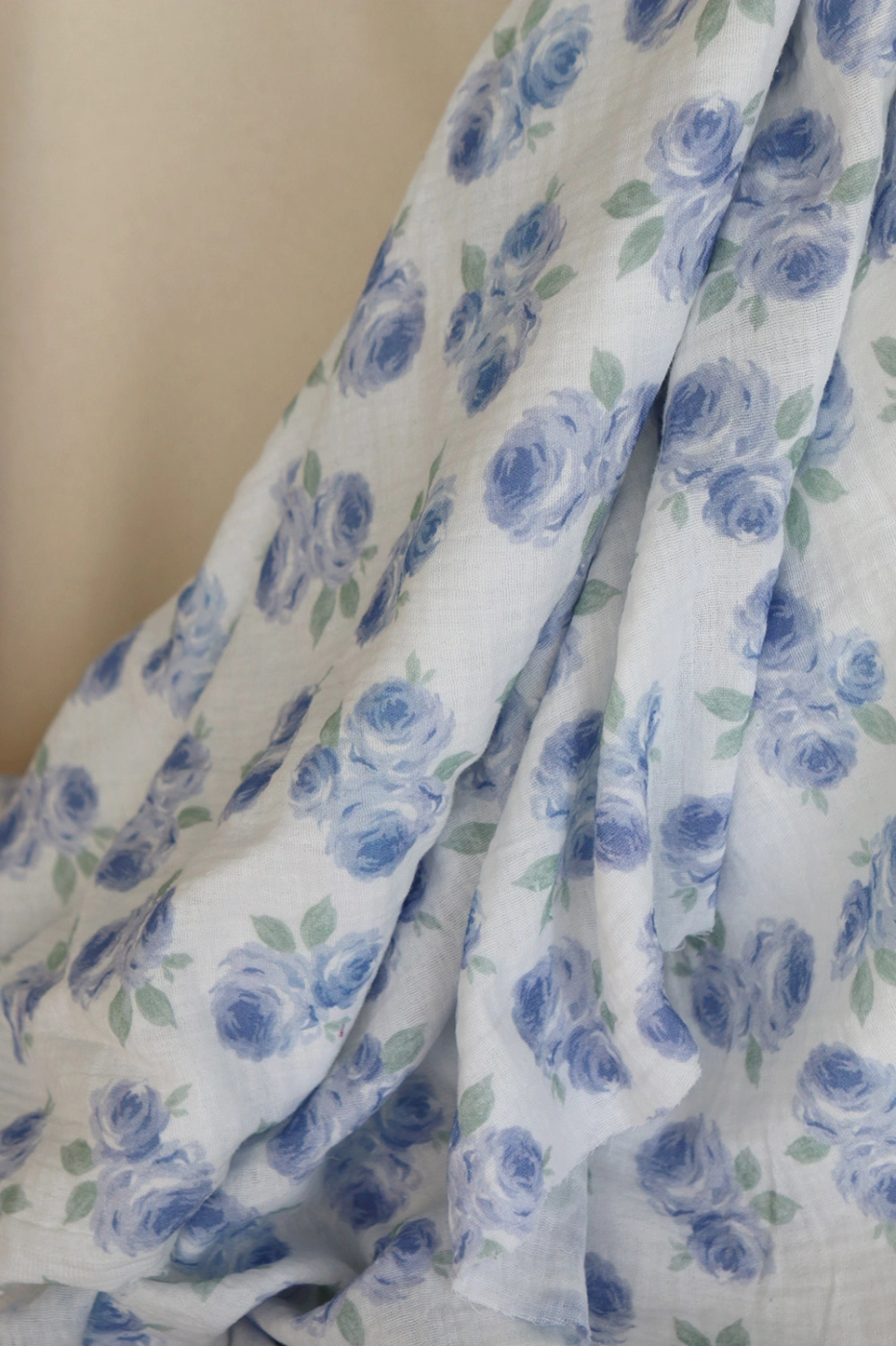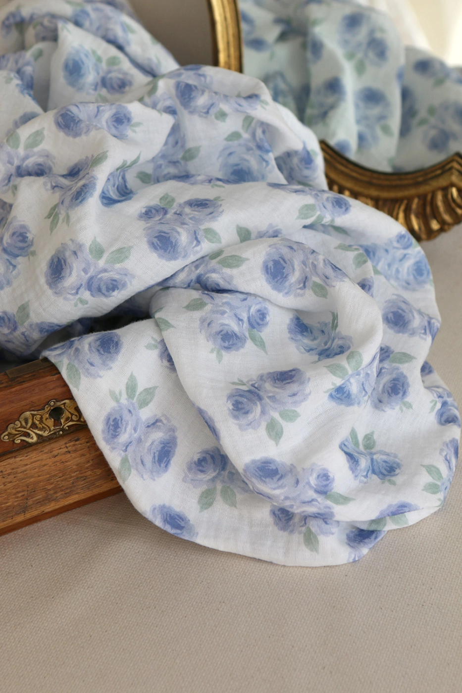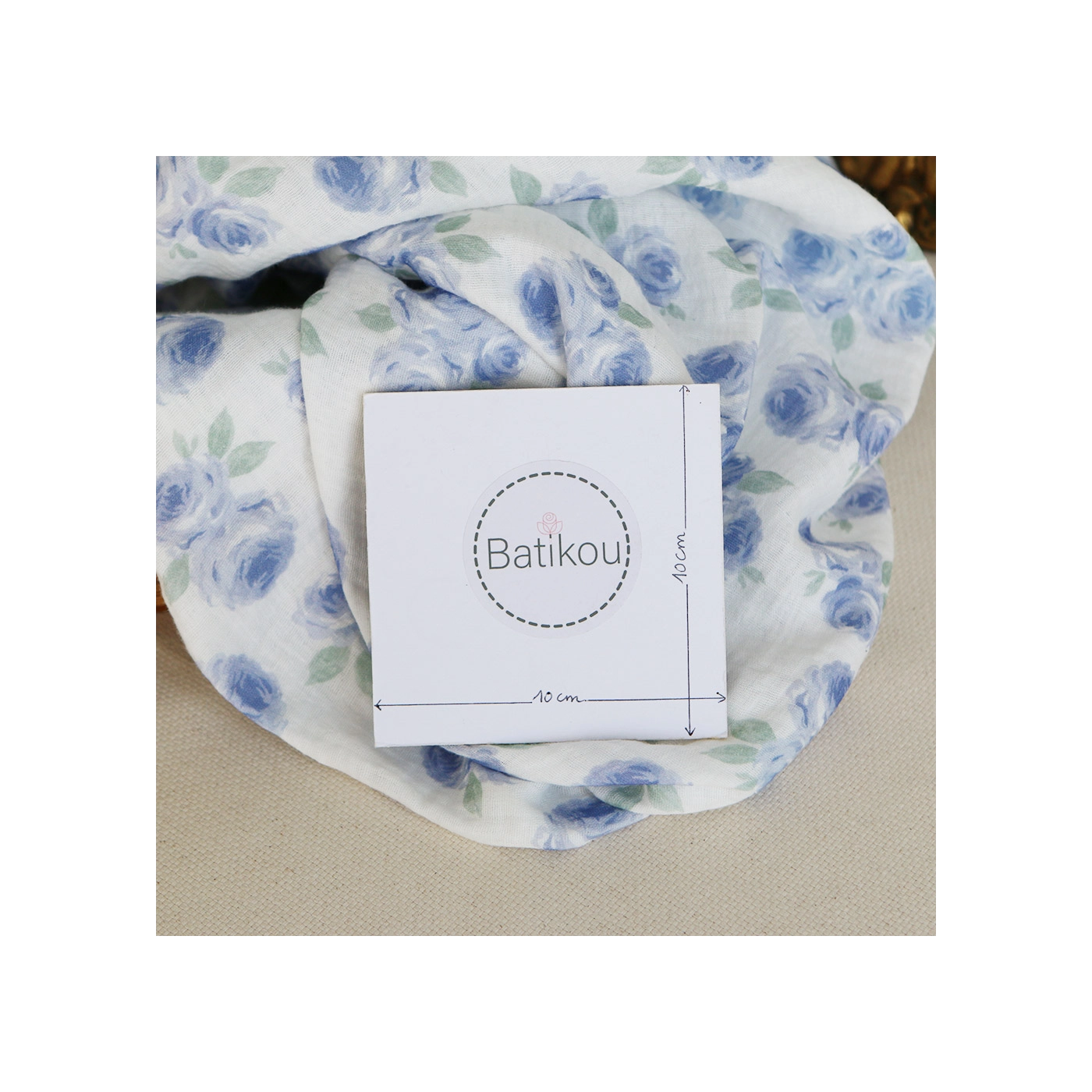 Assia - Double gaze de coton motif exclusif fond blanc cassé aquarelle bleu