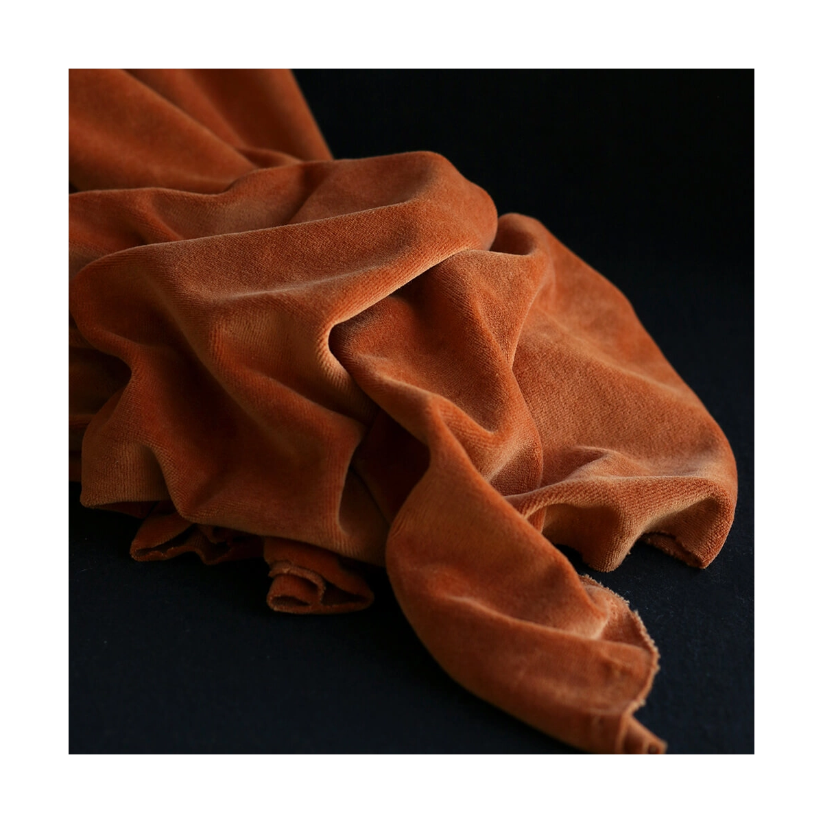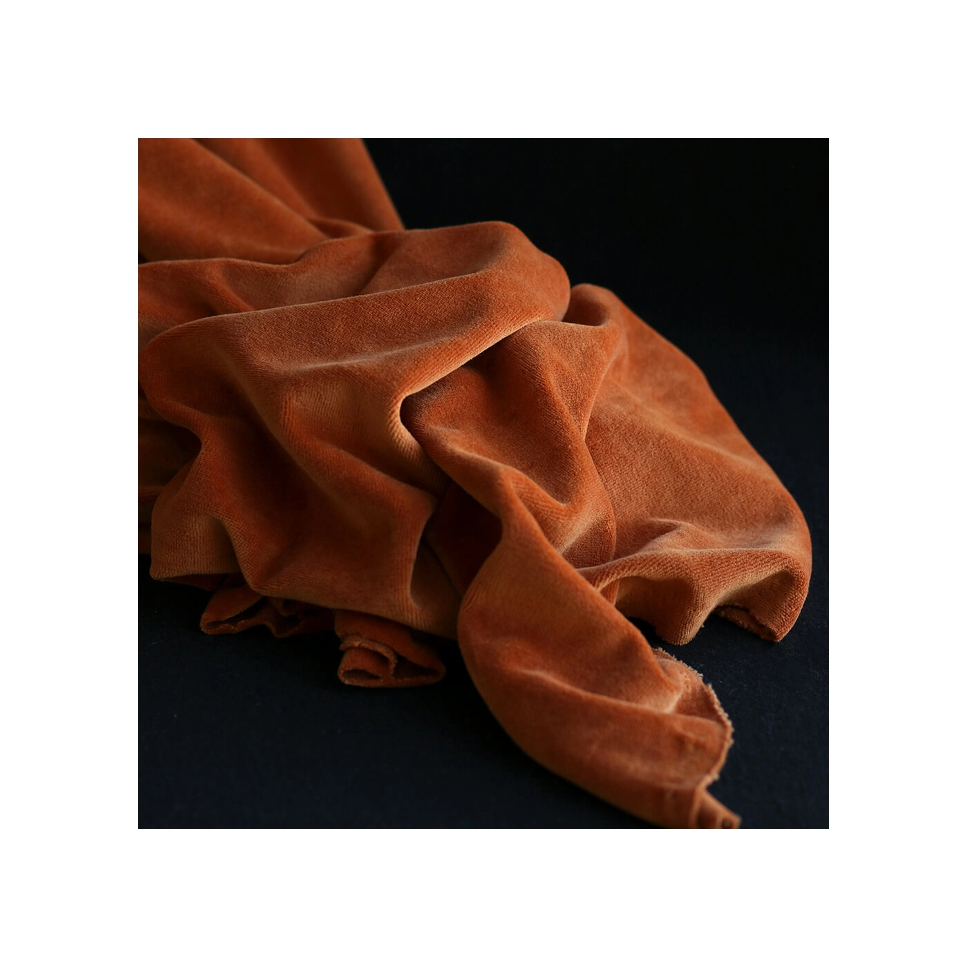 Ce velours nicky séduit par son toucher doux, son aspect moelleux et son très beau coloris rouille. La teinte évoque une terre cuite chaude, relevée de nuances cannelle et brique, ce qui en fait un uni chaleureux et facile à associer avec des imprimés d’automne, des tons crème, beige, sauge ou noisette. Avec ses 220 g/m2, cette maille offre un bon équilibre entre confort, souplesse et tenue, tout en gardant un tomber agréable pour des vêtements du quotidien.