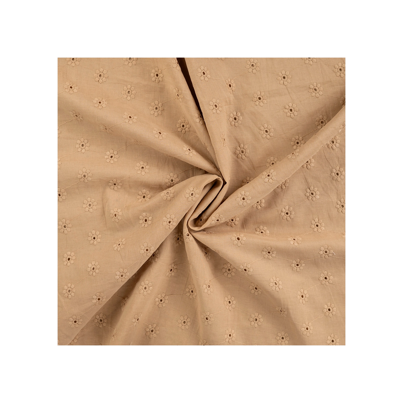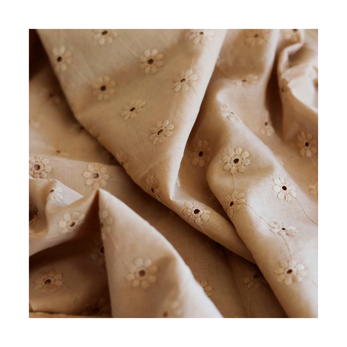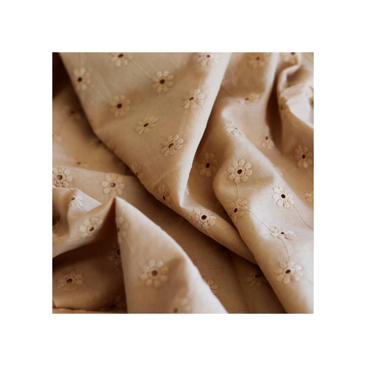 Voile de coton broderies fleuri ton sur ton camel clair