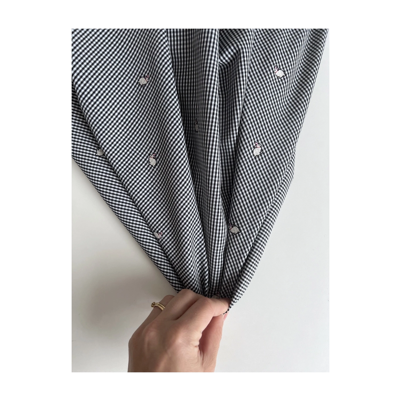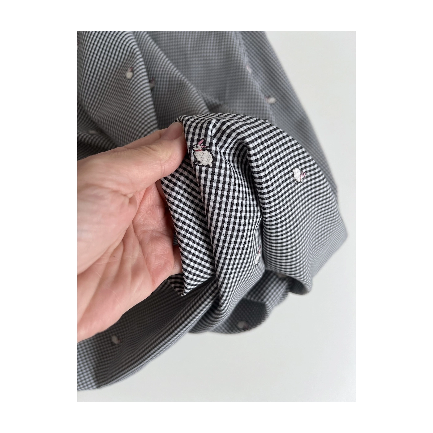 Popeline coton vichy 2mm noir et blanc broderies petits lapins environ 14mm
