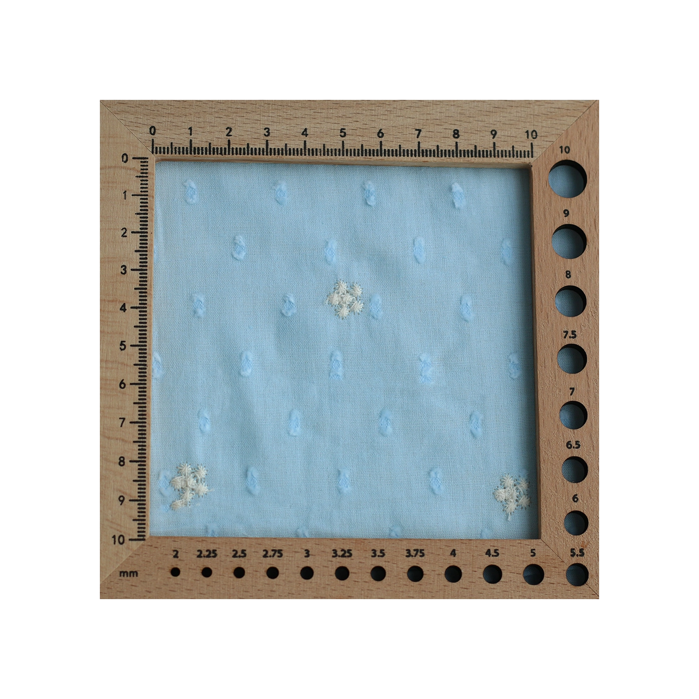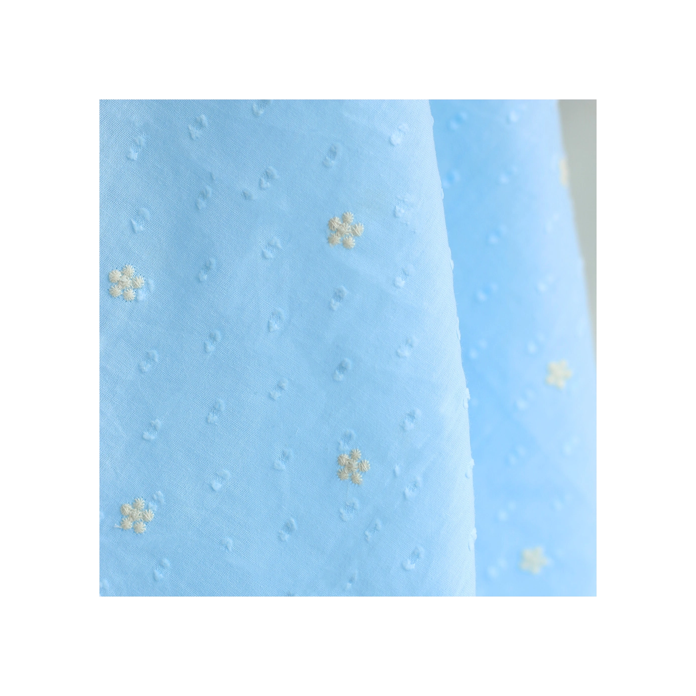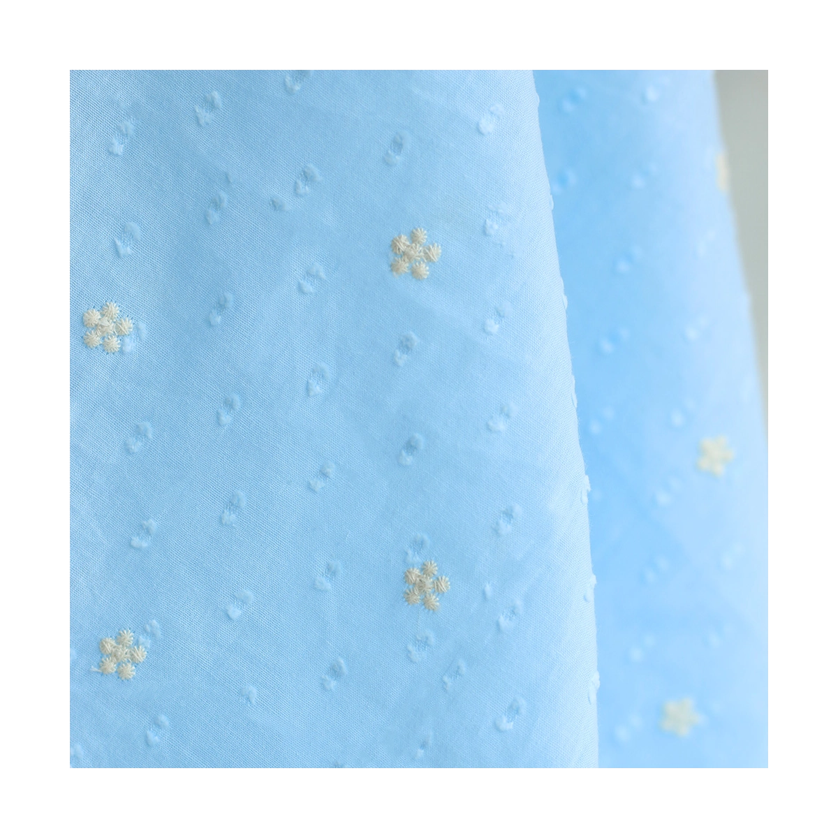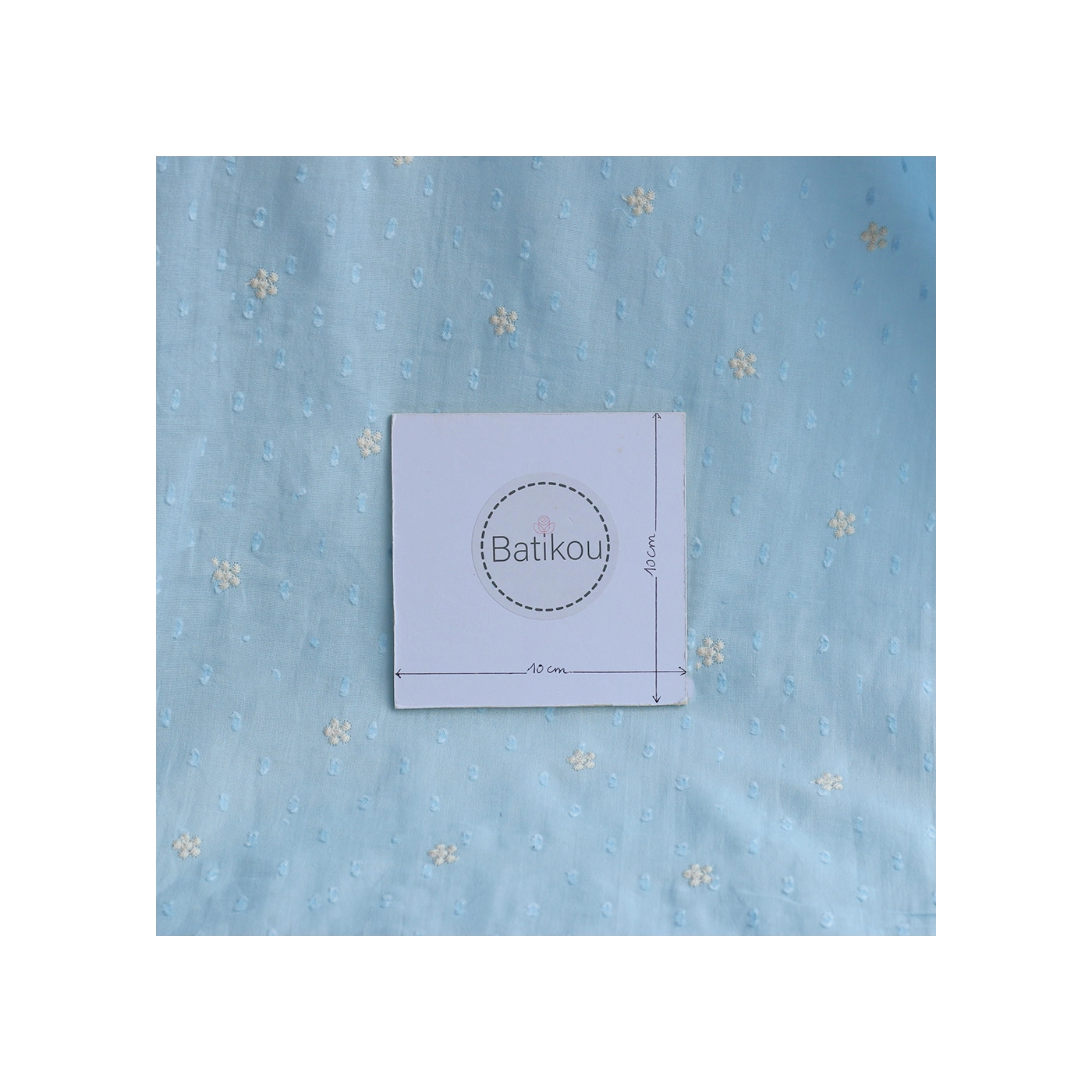 Voile plumetis de coton broderies motif crème coloris bleu ciel