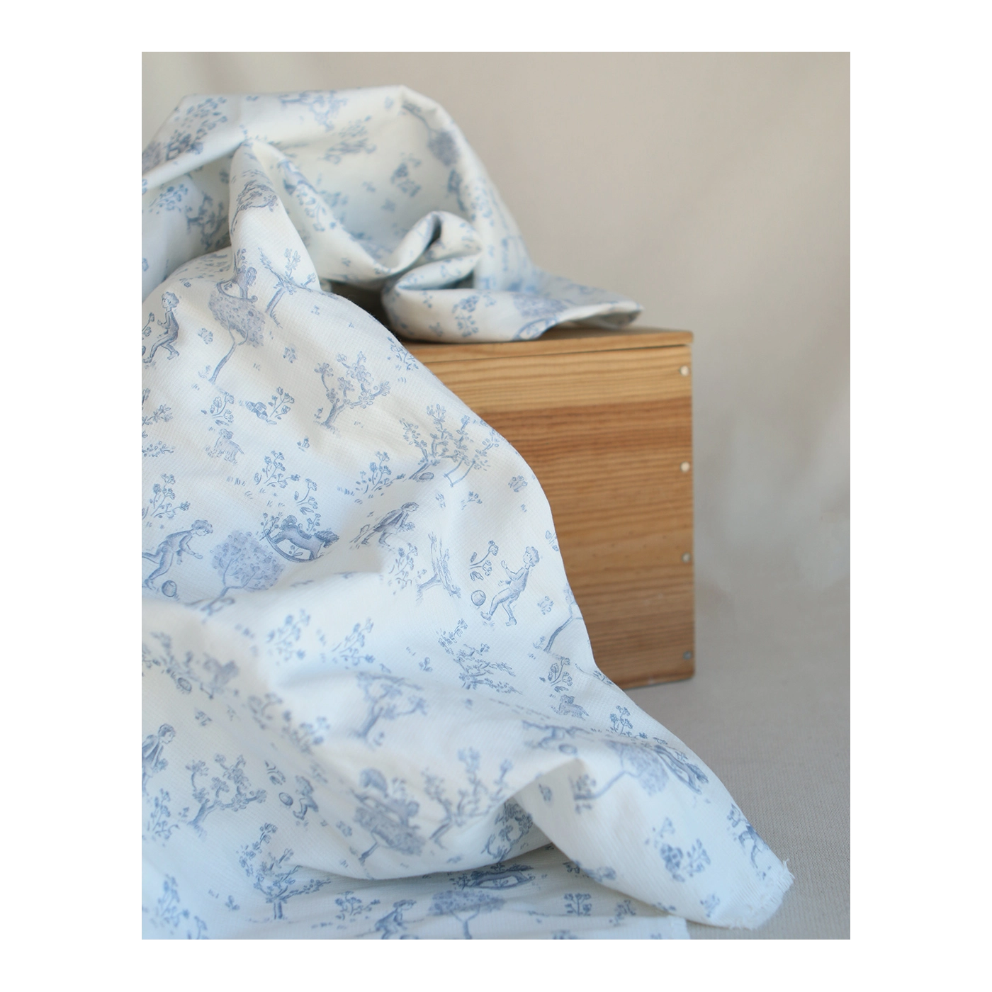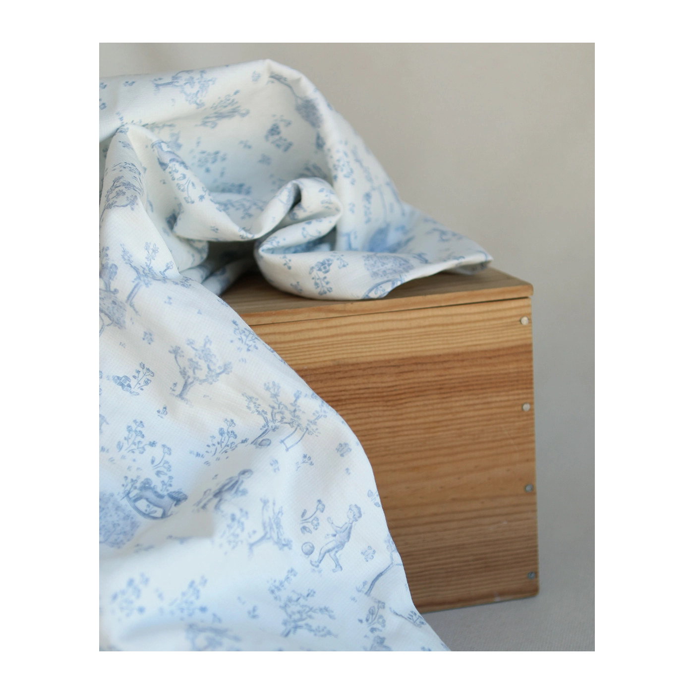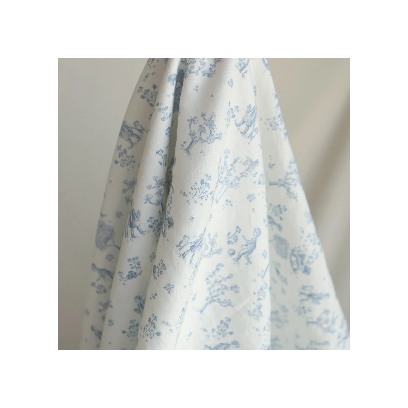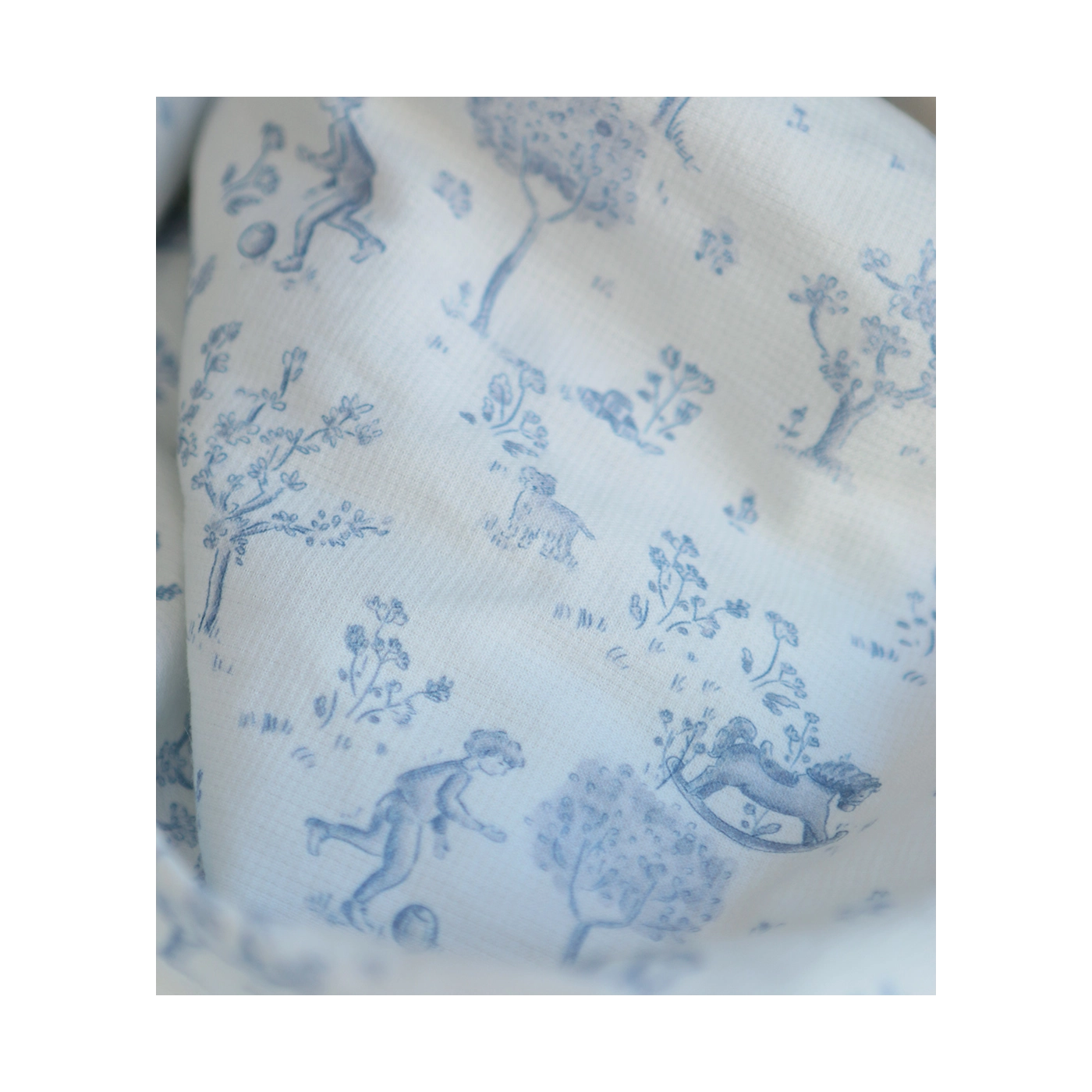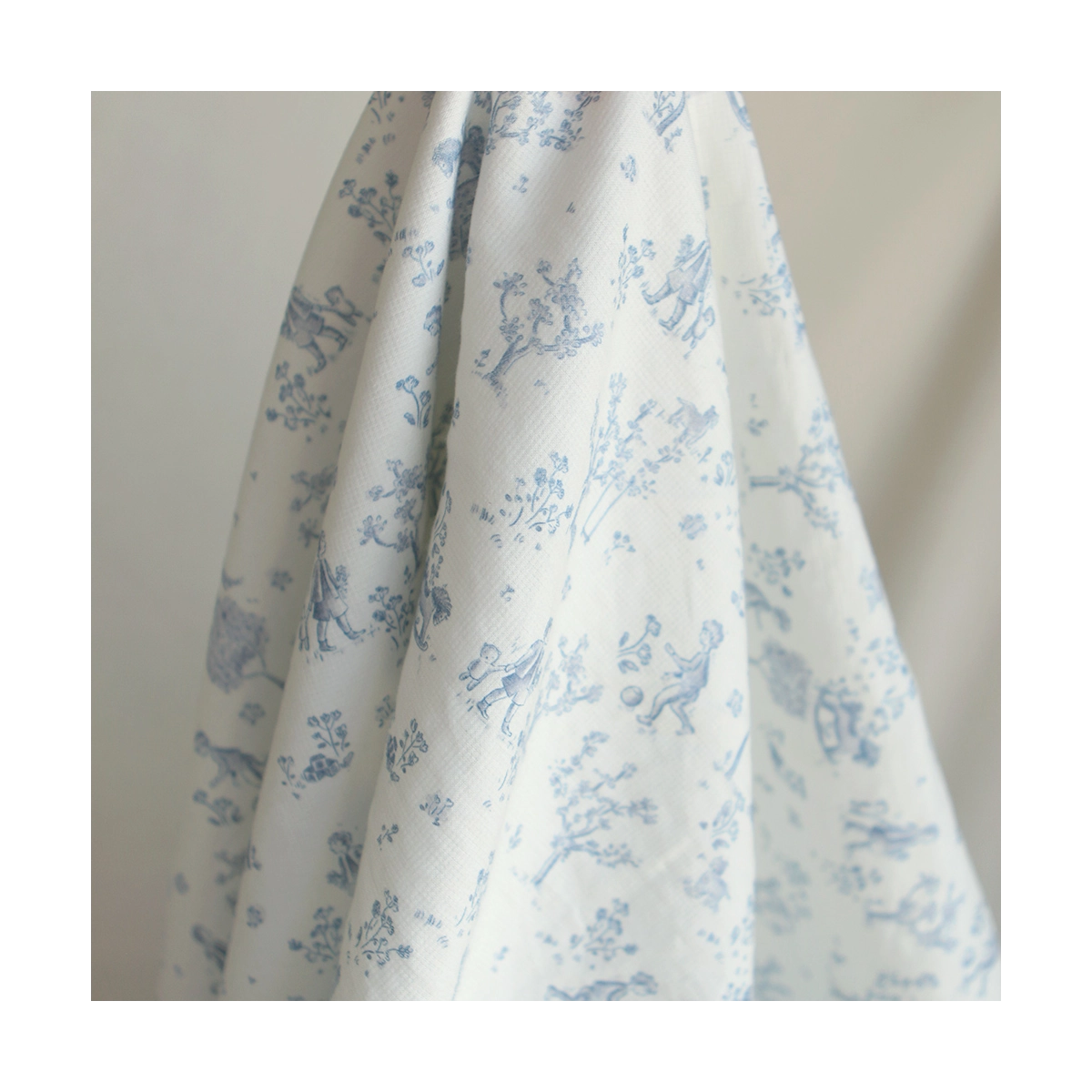 Coloris: fond blanc lait, motif toile de jouy enfantin ton bleu