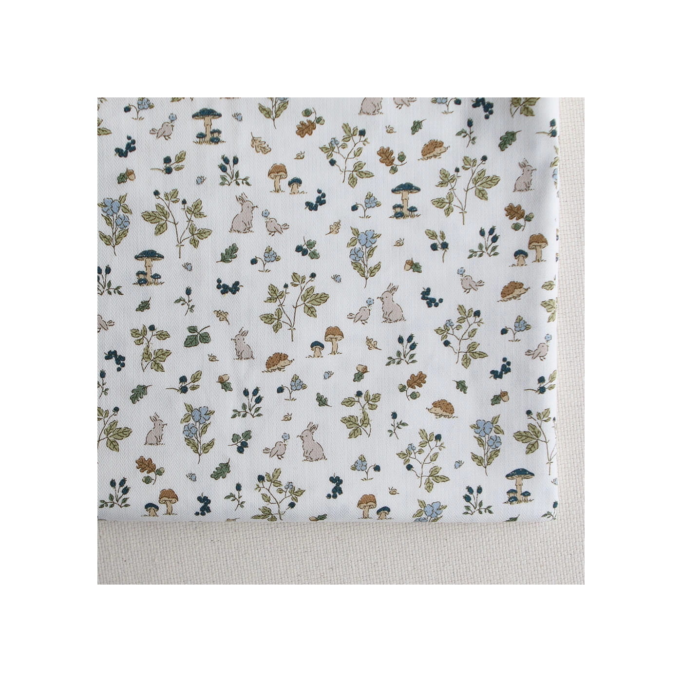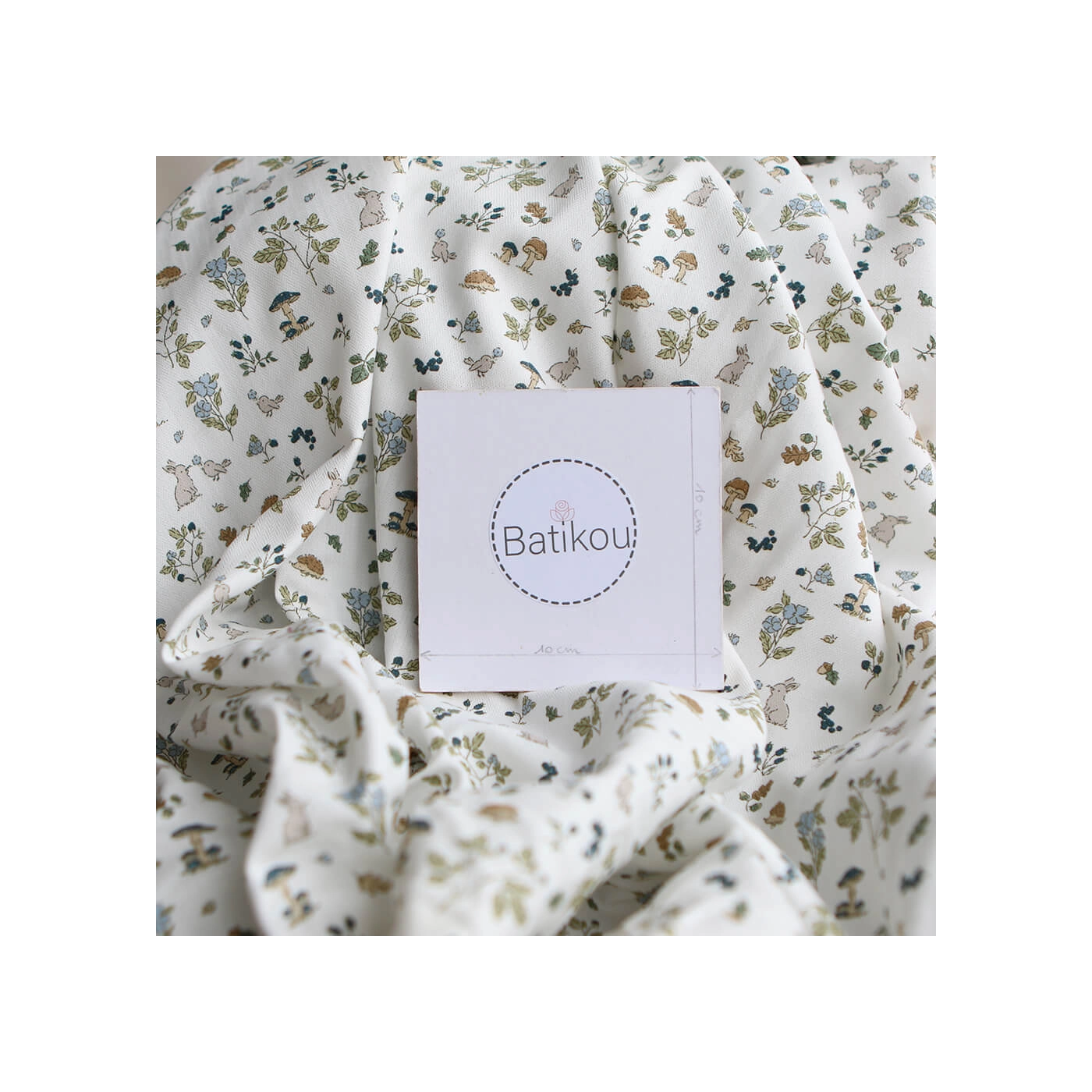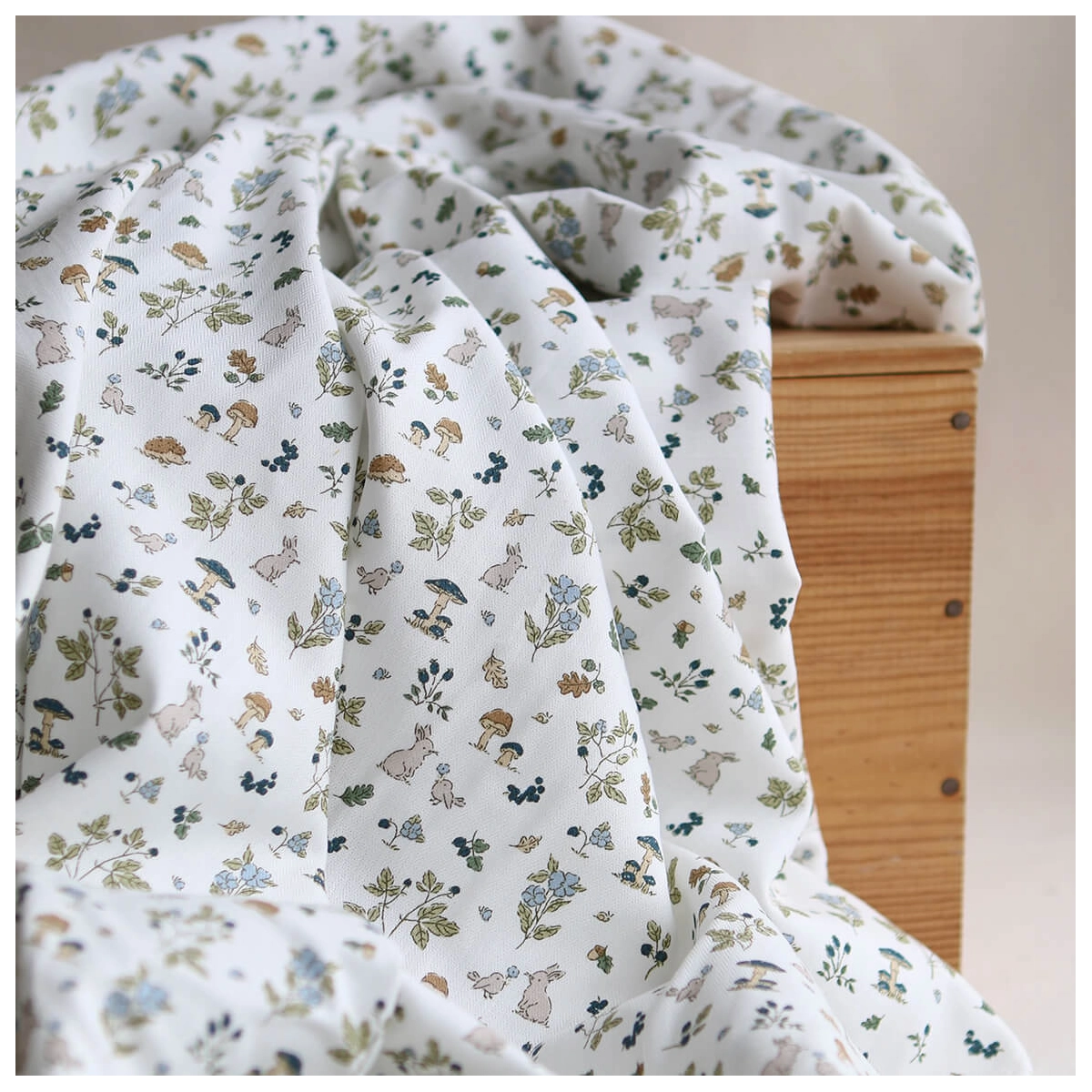 Coloris: fond blanc lait, motif animaux de la forêt teintes bleu marine, bleu, vert et camel