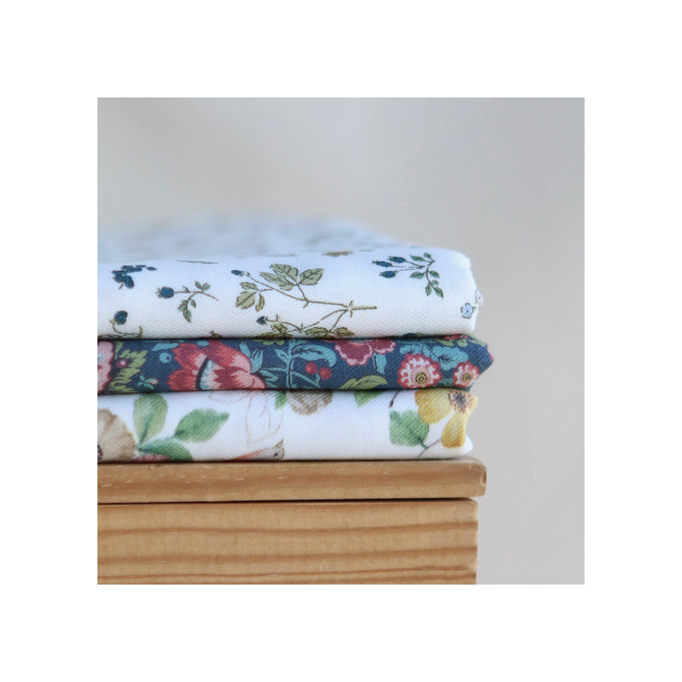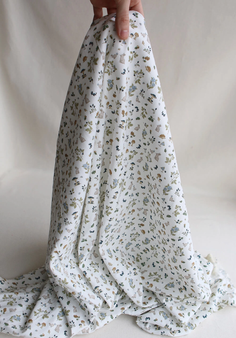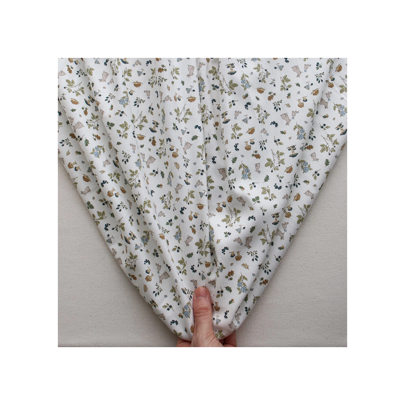Coloris: fond blanc lait, motif animaux de la forêt teintes bleu marine, bleu, vert et camel