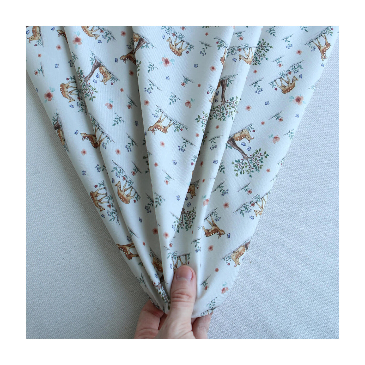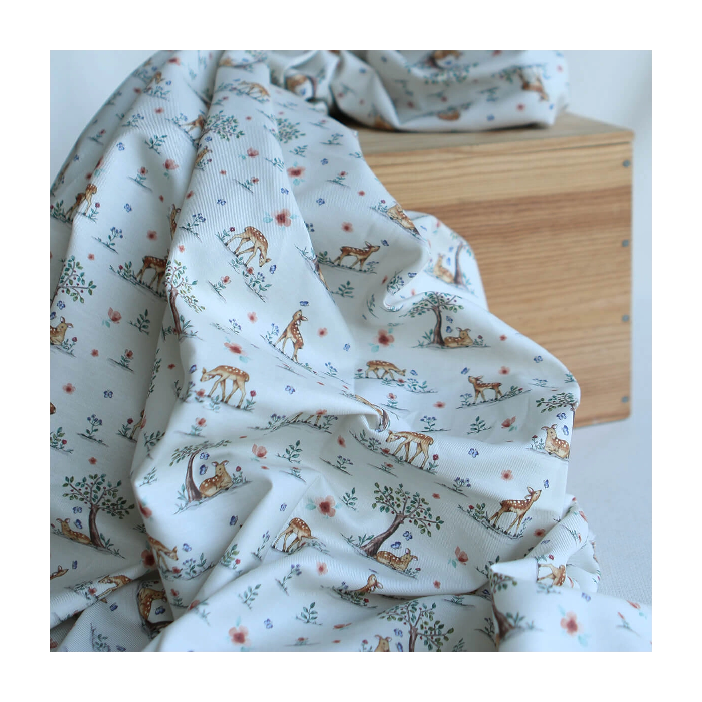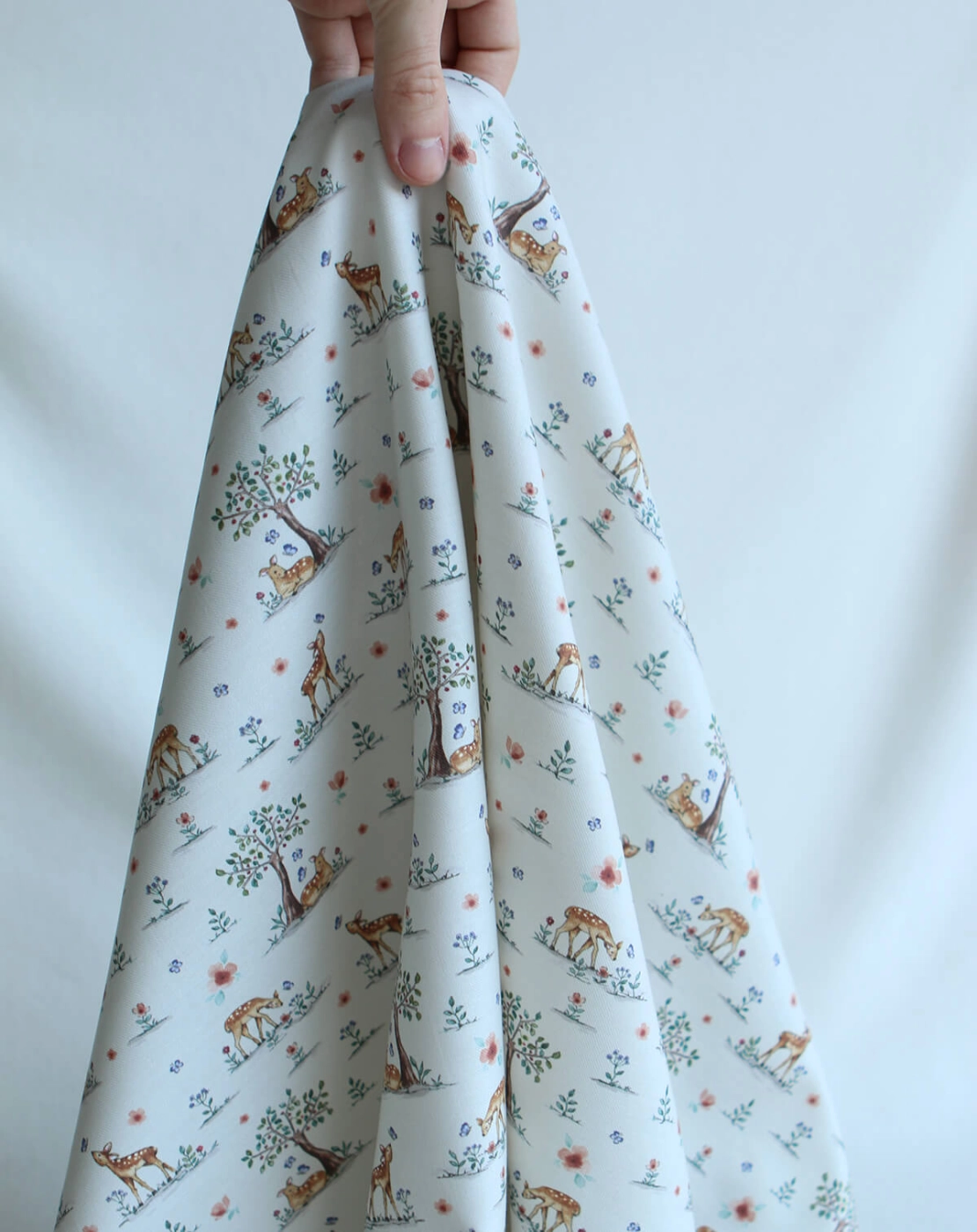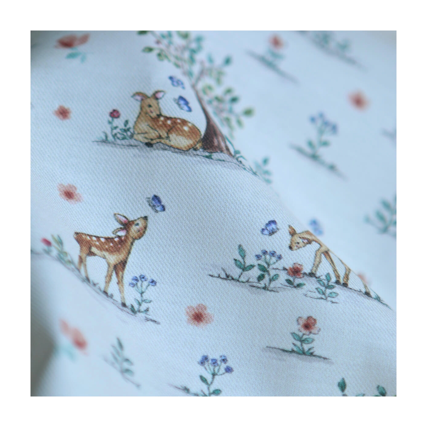 Ce tissu est un sergé / twill de coton organique de 120 g/m². Son tissage sergé lui apporte une belle tenue tout en conservant de la souplesse, ce qui le rend agréable à coudre et confortable au quotidien. Avec sa largeur de 150 cm, il convient à de nombreux projets couture, en habillement comme en accessoire. Son imprimé représente de petits faons dans un décor fleuri et végétal, dans un univers tendre et poétique, idéal pour des créations enfantines ou des cousettes délicates.