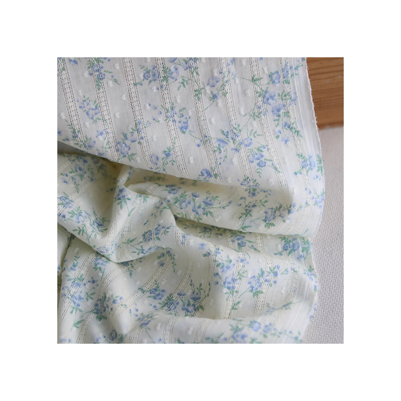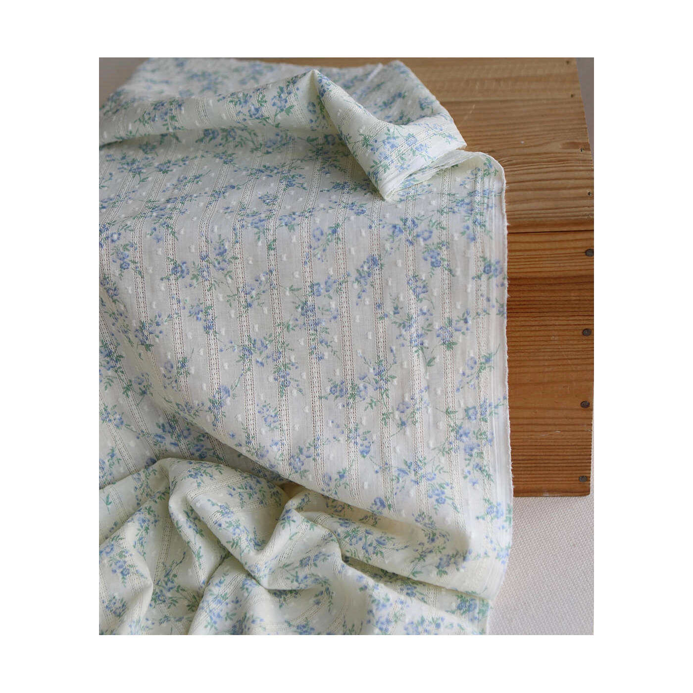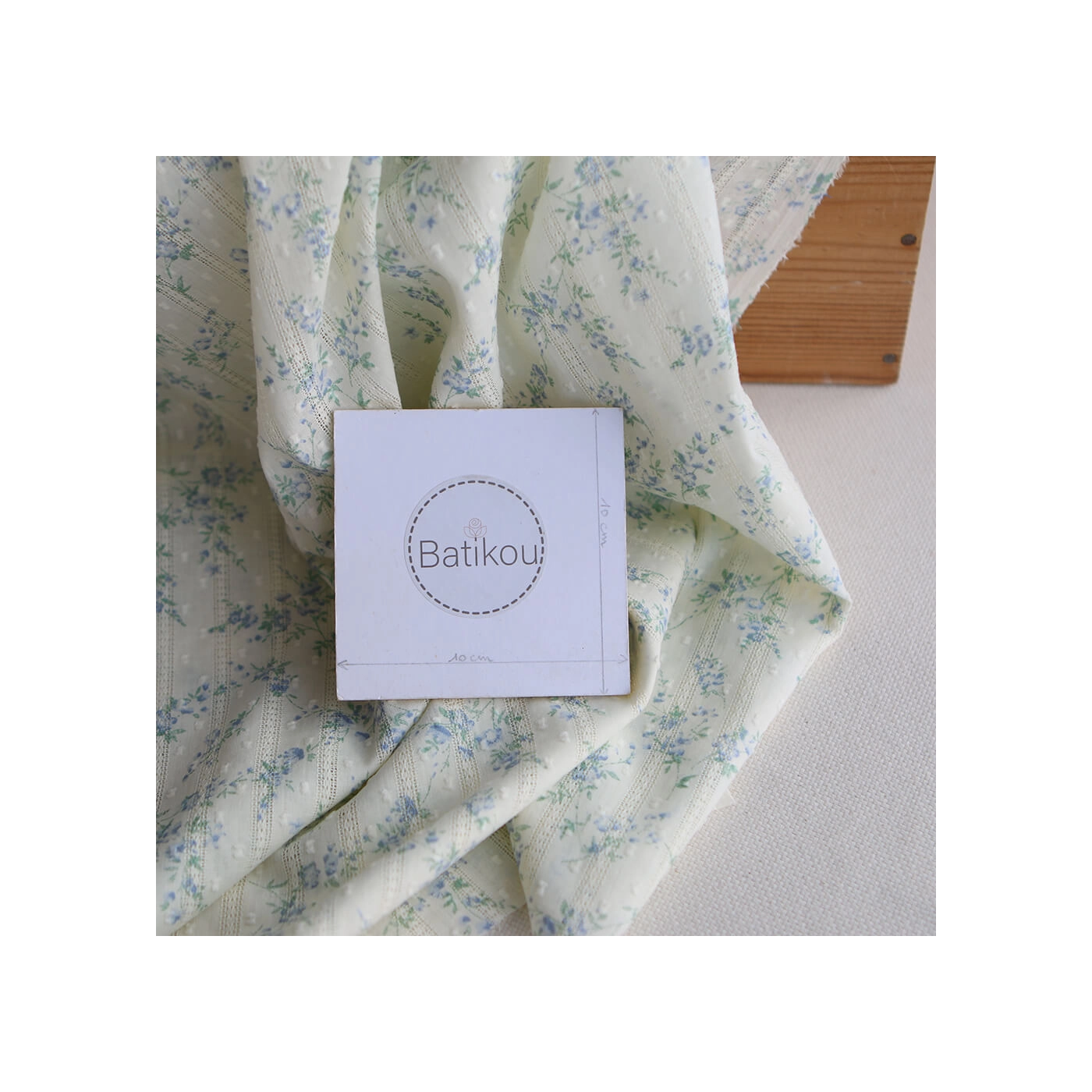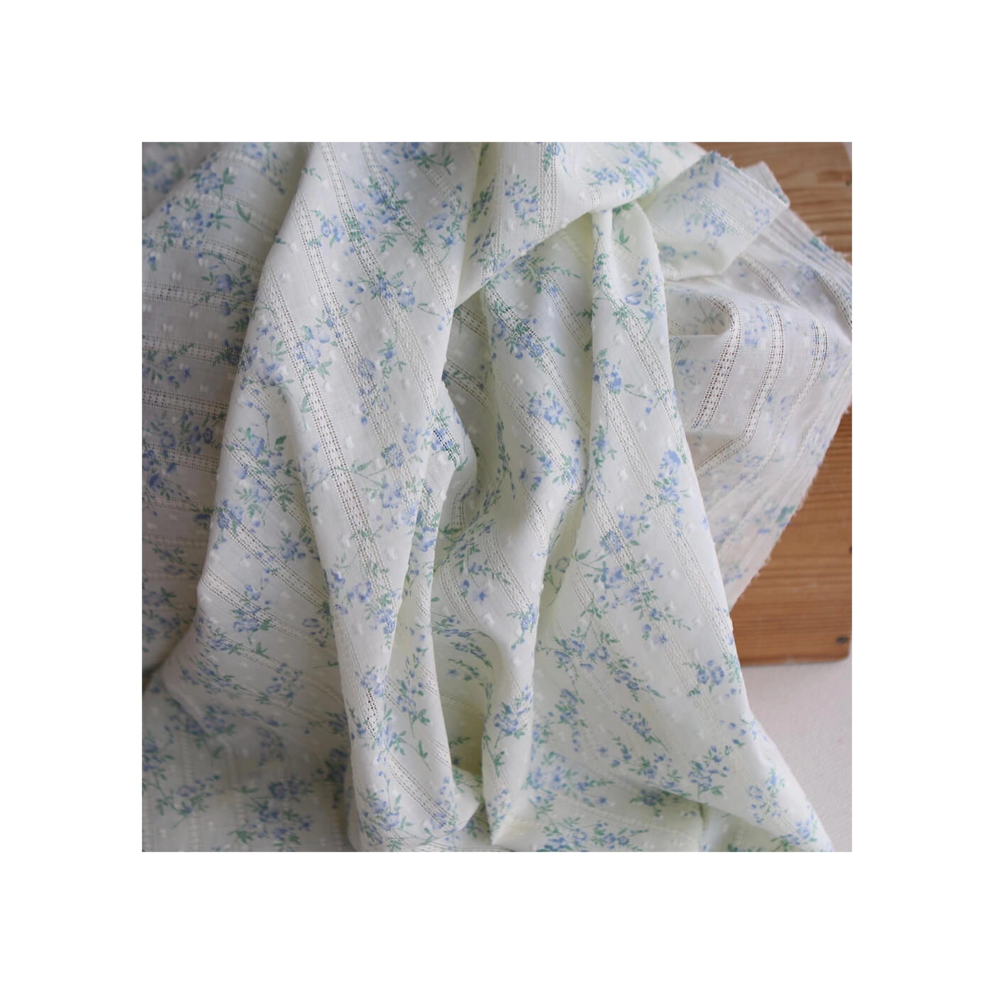 Ce tissu se distingue par son aspect travaillé et délicat, qui associe une base coton texturée, un effet plumetis en relief, de fines bandes ajourées verticales et un imprimé floral discret. L’ensemble crée une étoffe légère visuellement, raffinée et pleine de relief, tout en gardant une belle douceur. Le motif, composé de petites fleurs bleues et de feuillages fins sur fond clair, donne au tissu un style romantique, frais et intemporel.