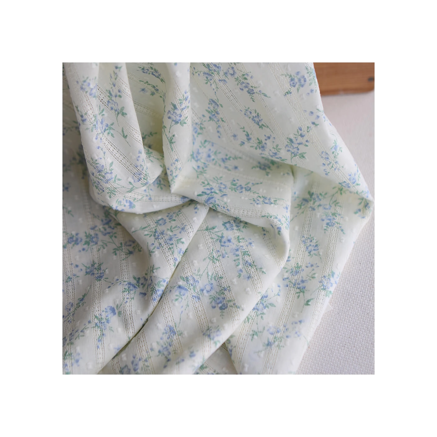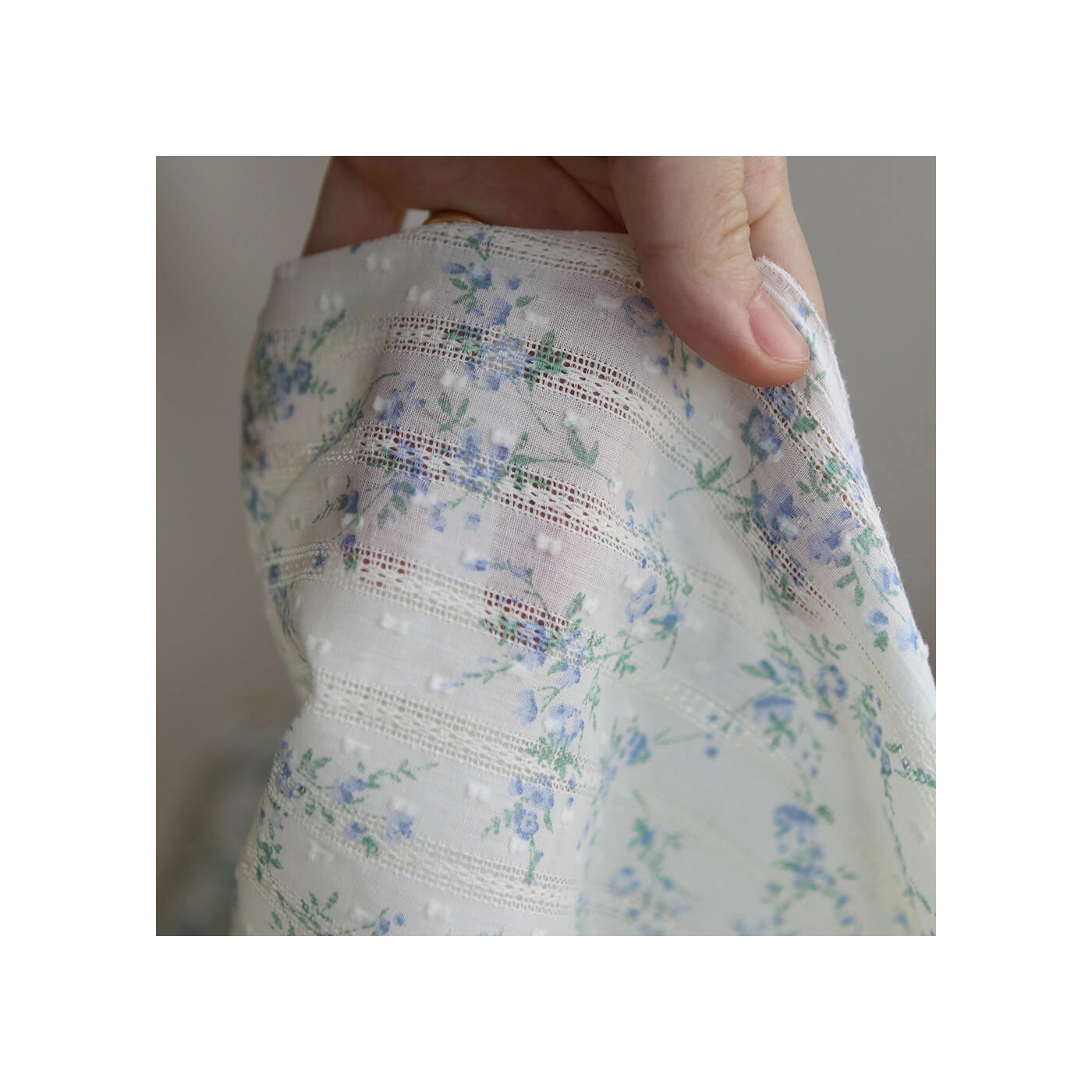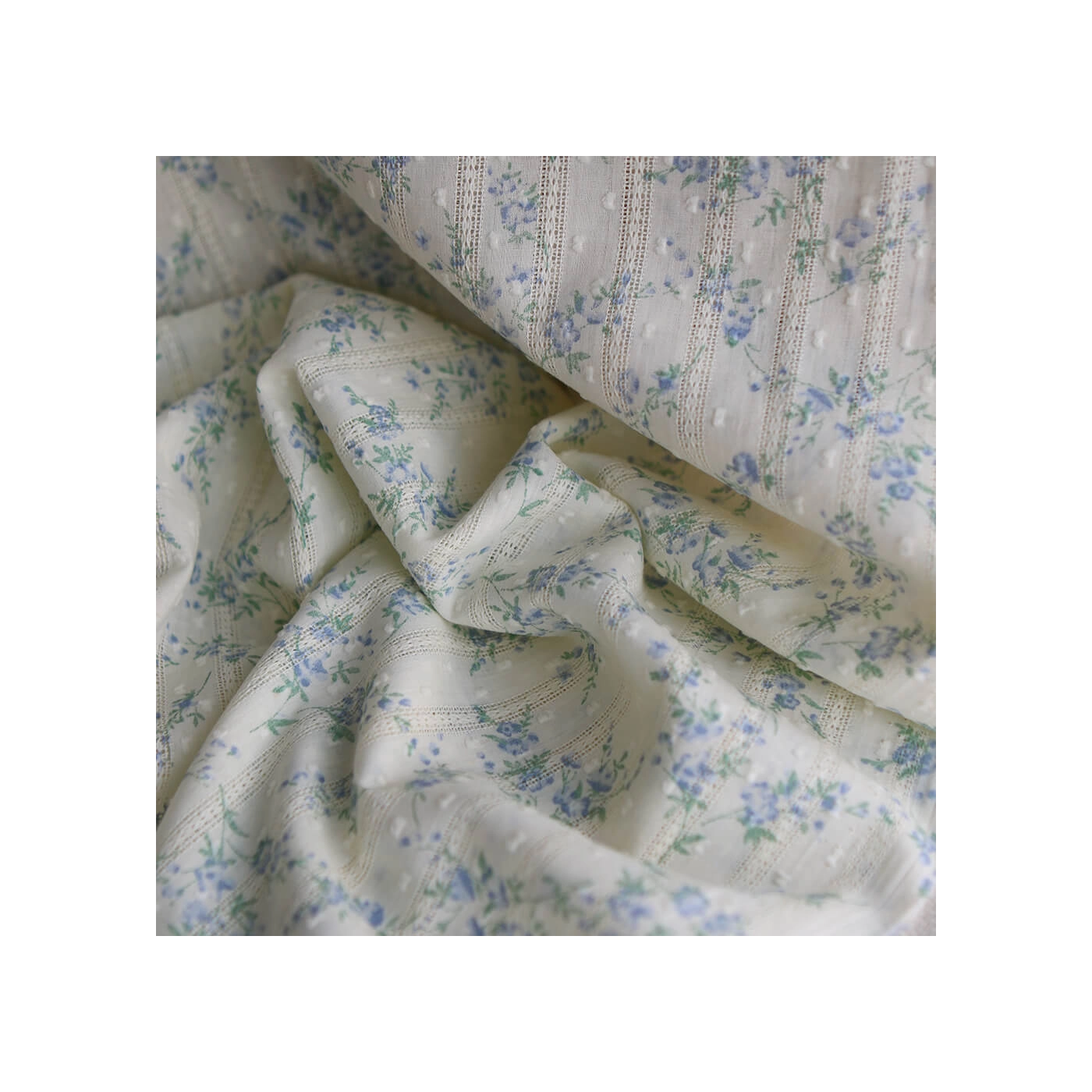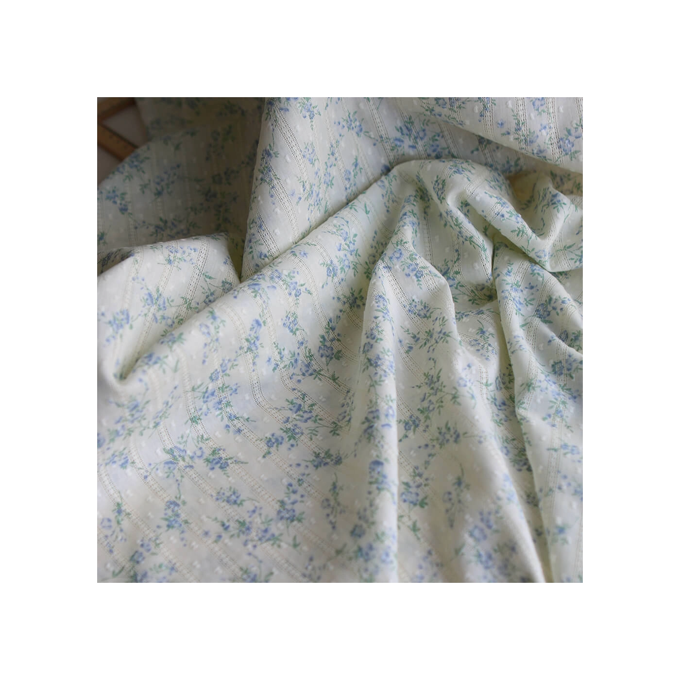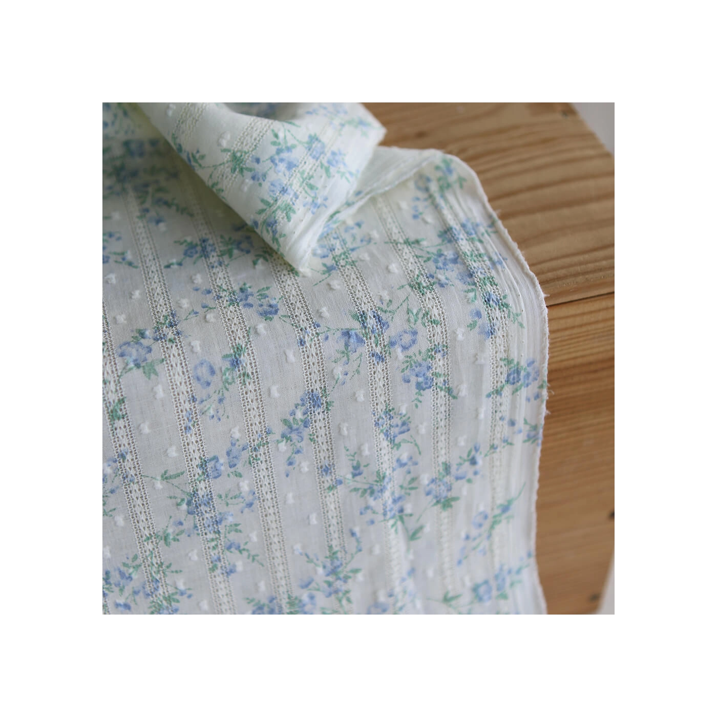 Ce tissu se distingue par son aspect travaillé et délicat, qui associe une base coton texturée, un effet plumetis en relief, de fines bandes ajourées verticales et un imprimé floral discret. L’ensemble crée une étoffe légère visuellement, raffinée et pleine de relief, tout en gardant une belle douceur. Le motif, composé de petites fleurs bleues et de feuillages fins sur fond clair, donne au tissu un style romantique, frais et intemporel.