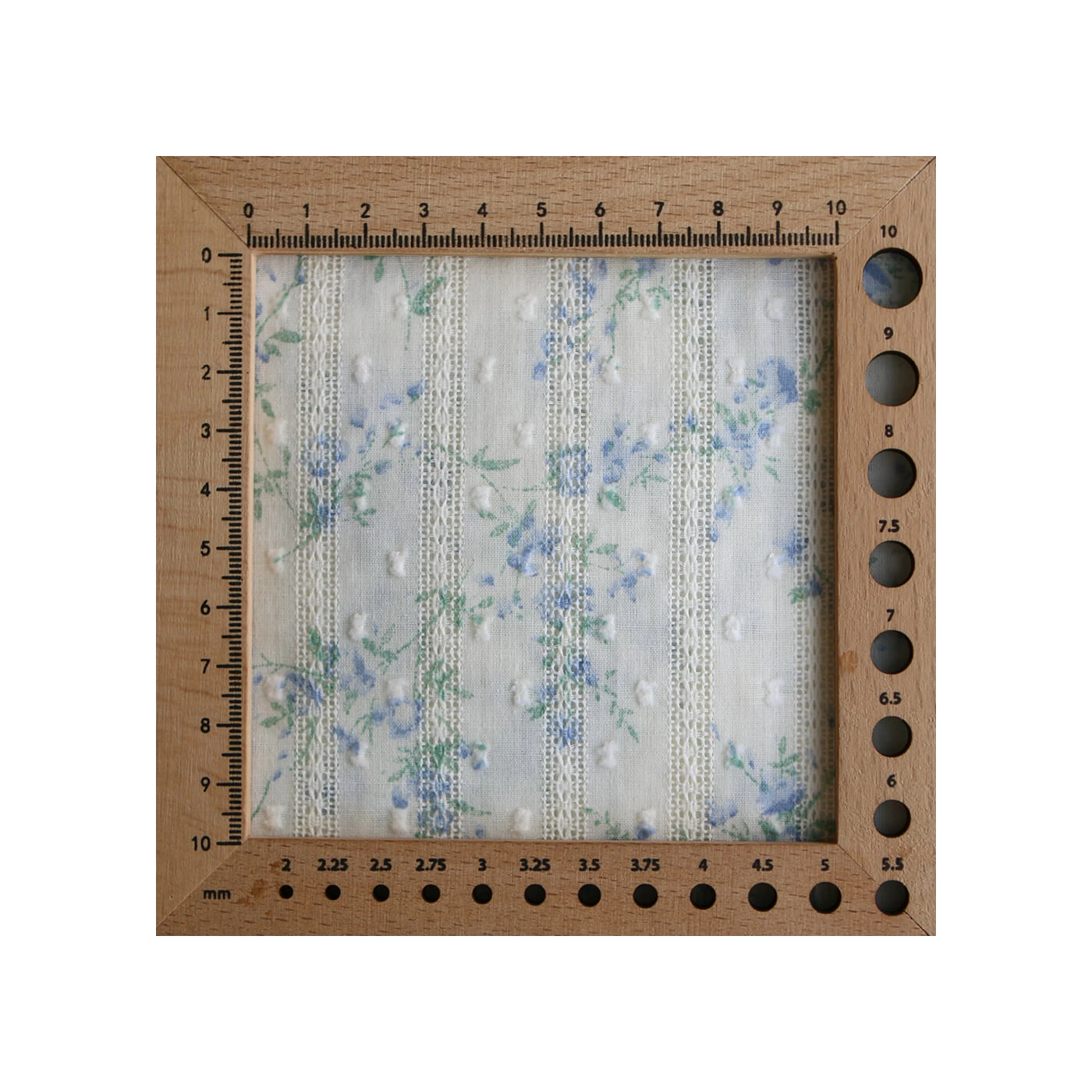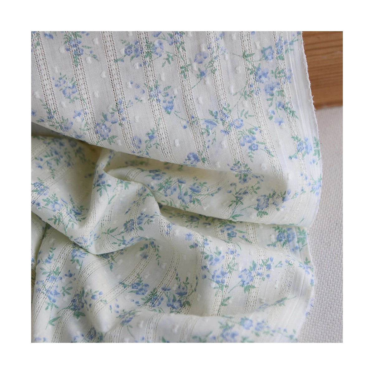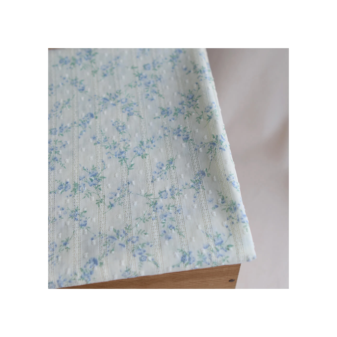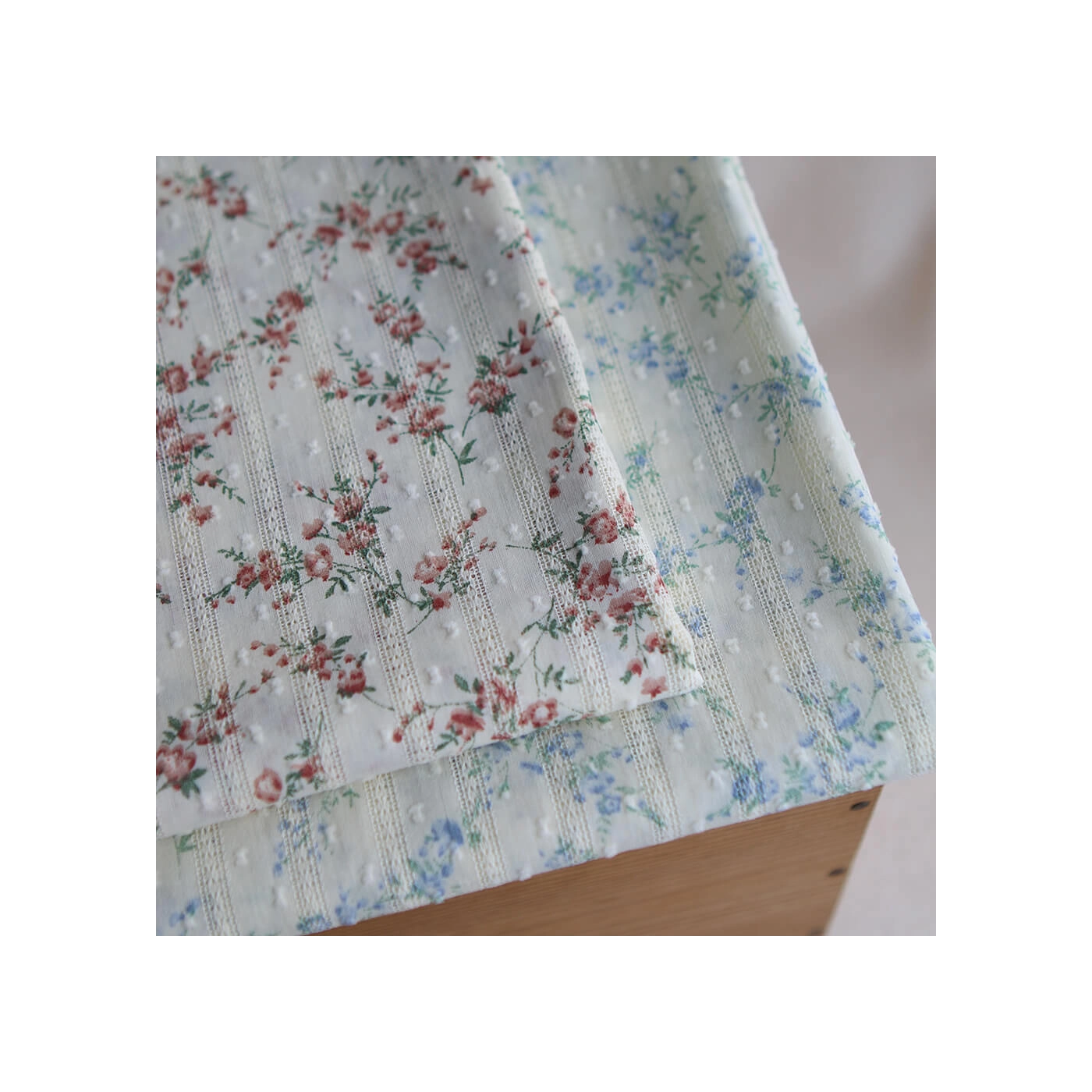 Ce tissu se distingue par son aspect travaillé et délicat, qui associe une base coton texturée, un effet plumetis en relief, de fines bandes ajourées verticales et un imprimé floral discret. L’ensemble crée une étoffe légère visuellement, raffinée et pleine de relief, tout en gardant une belle douceur. Le motif, composé de petites fleurs bleues et de feuillages fins sur fond clair, donne au tissu un style romantique, frais et intemporel.