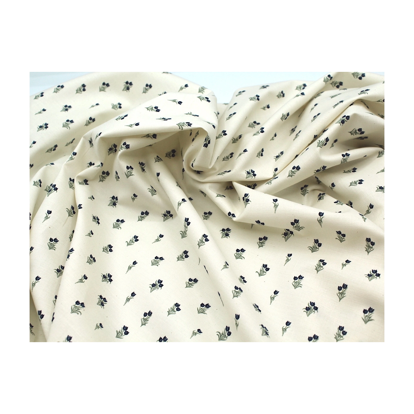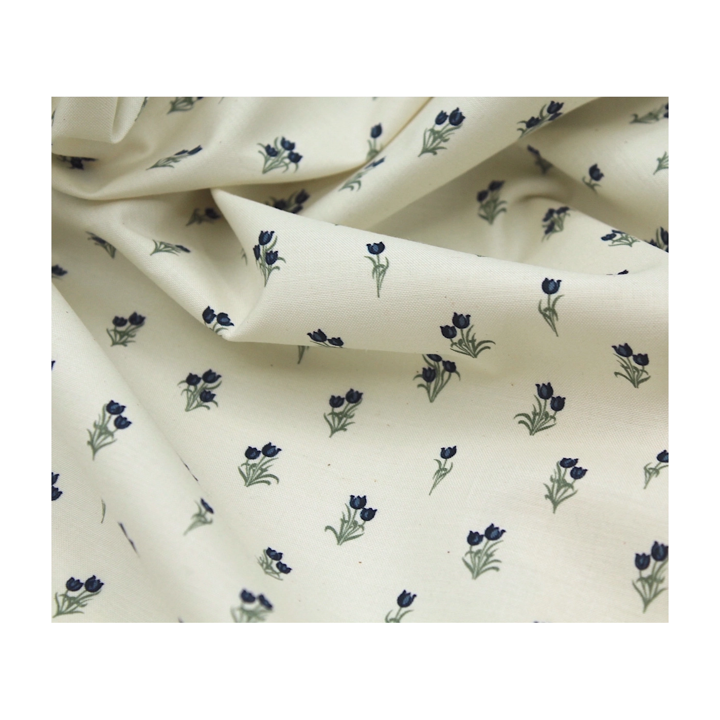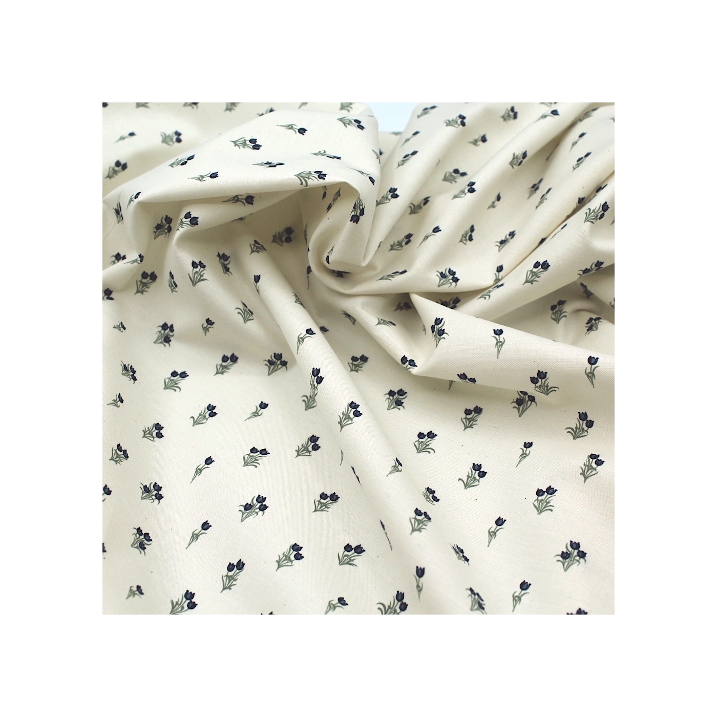 Popeline fine et douce coton organique fond ivoire imprimé tulipes marine