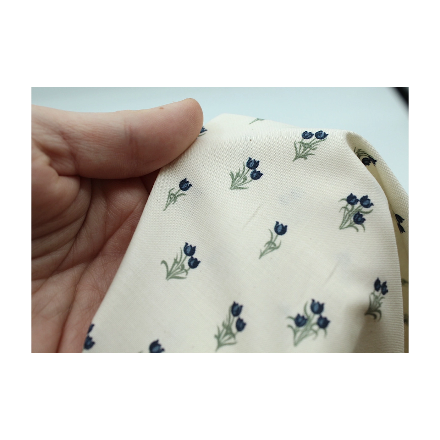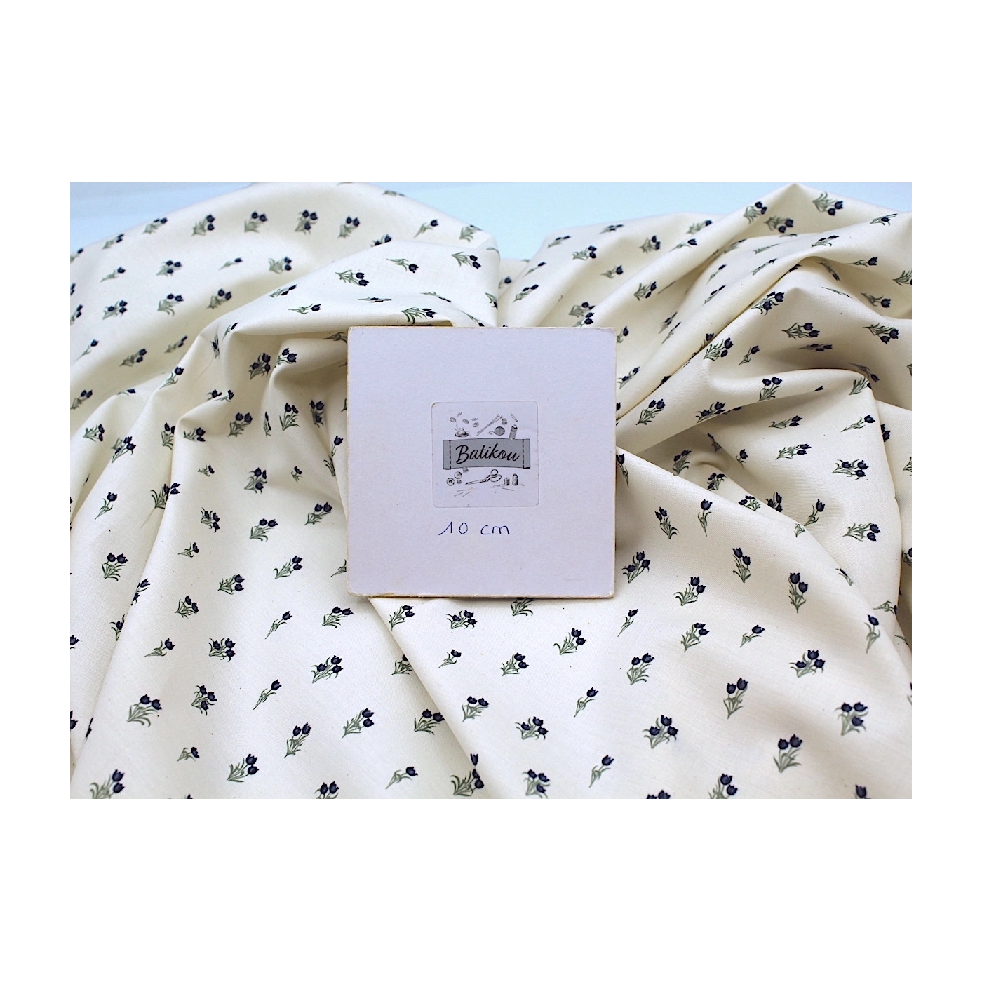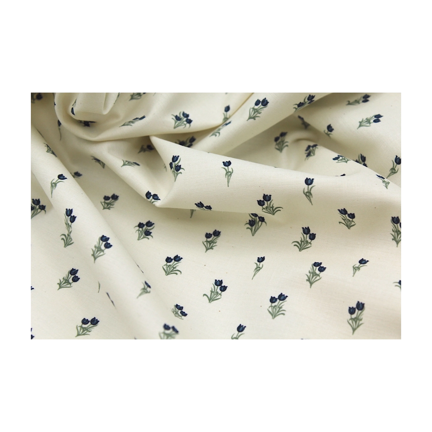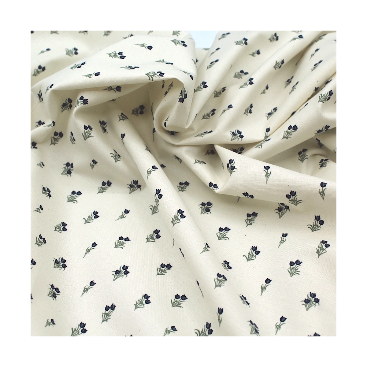 Popeline fine et douce coton organique fond ivoire imprimé tulipes marine