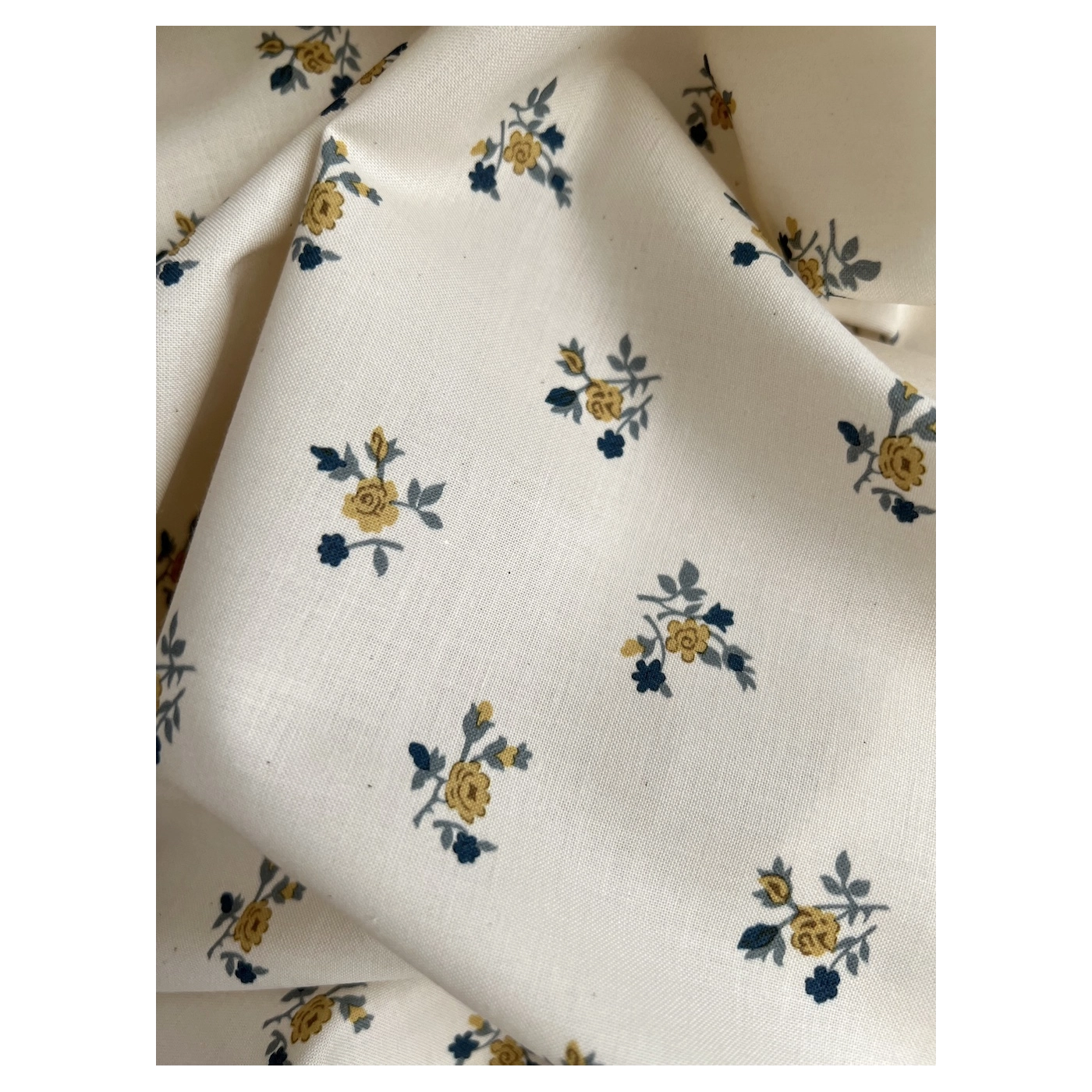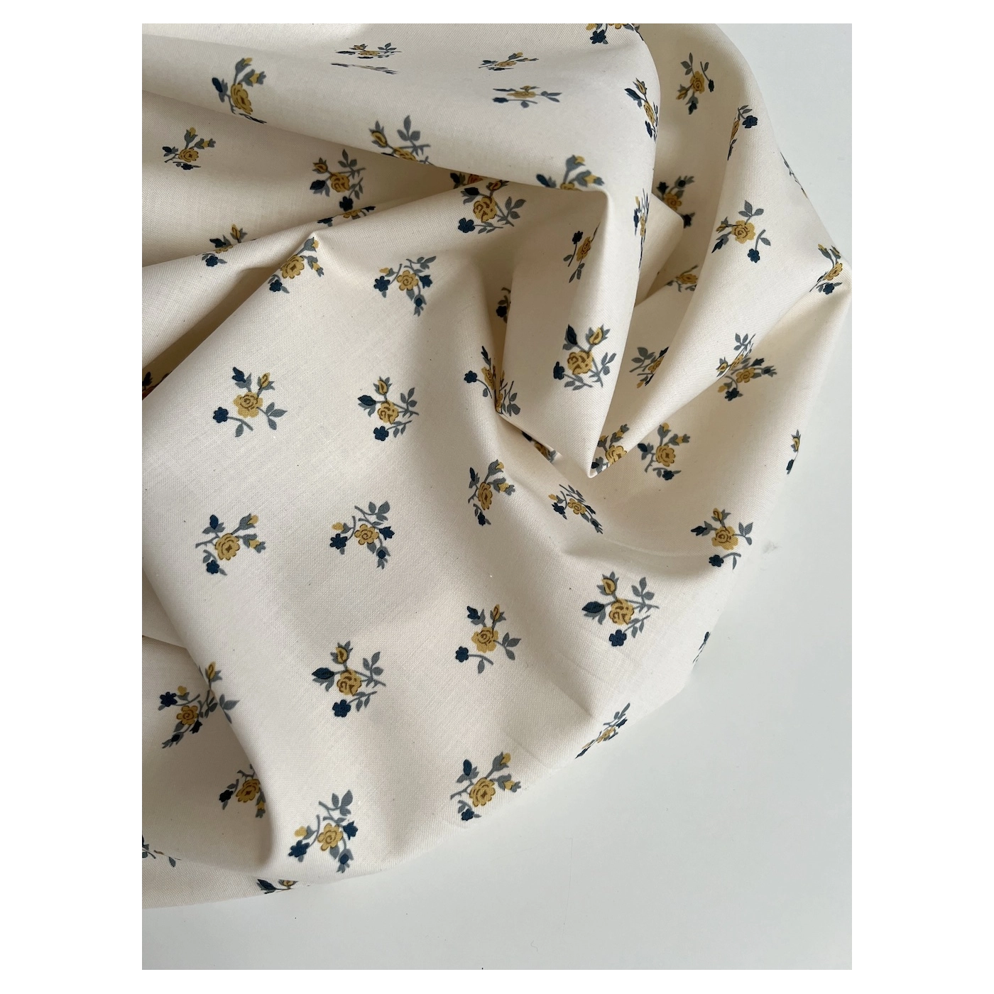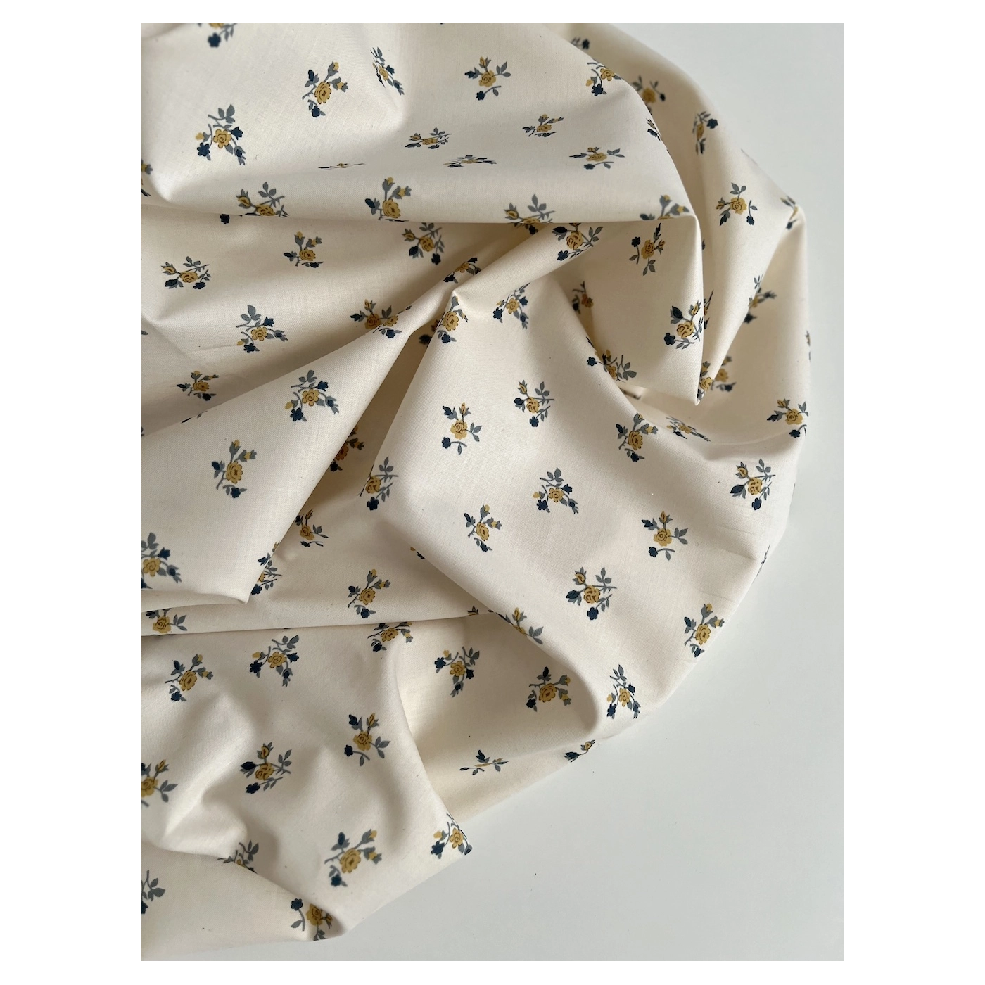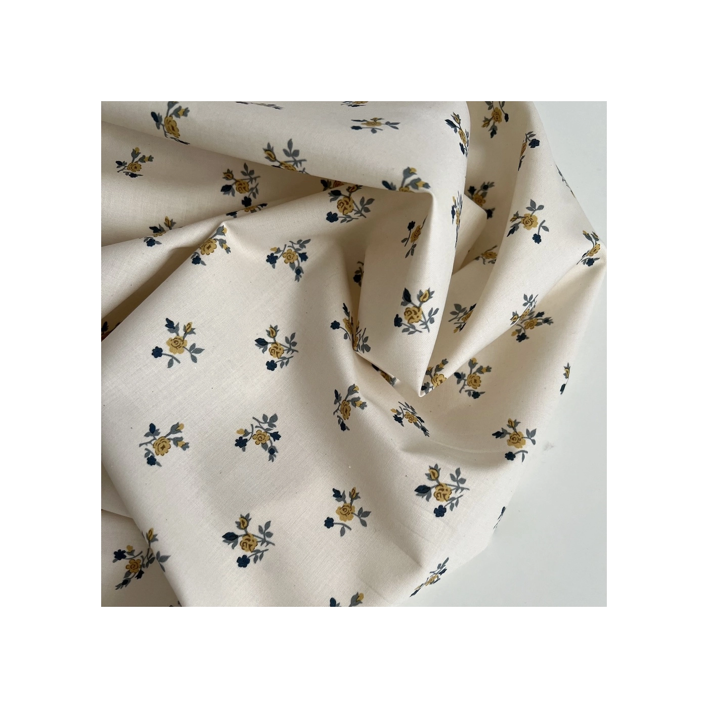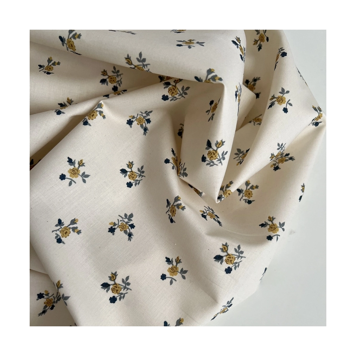 Celine - Popeline douce coton organique fond ivoire imprimé fleuri marine / moutarde