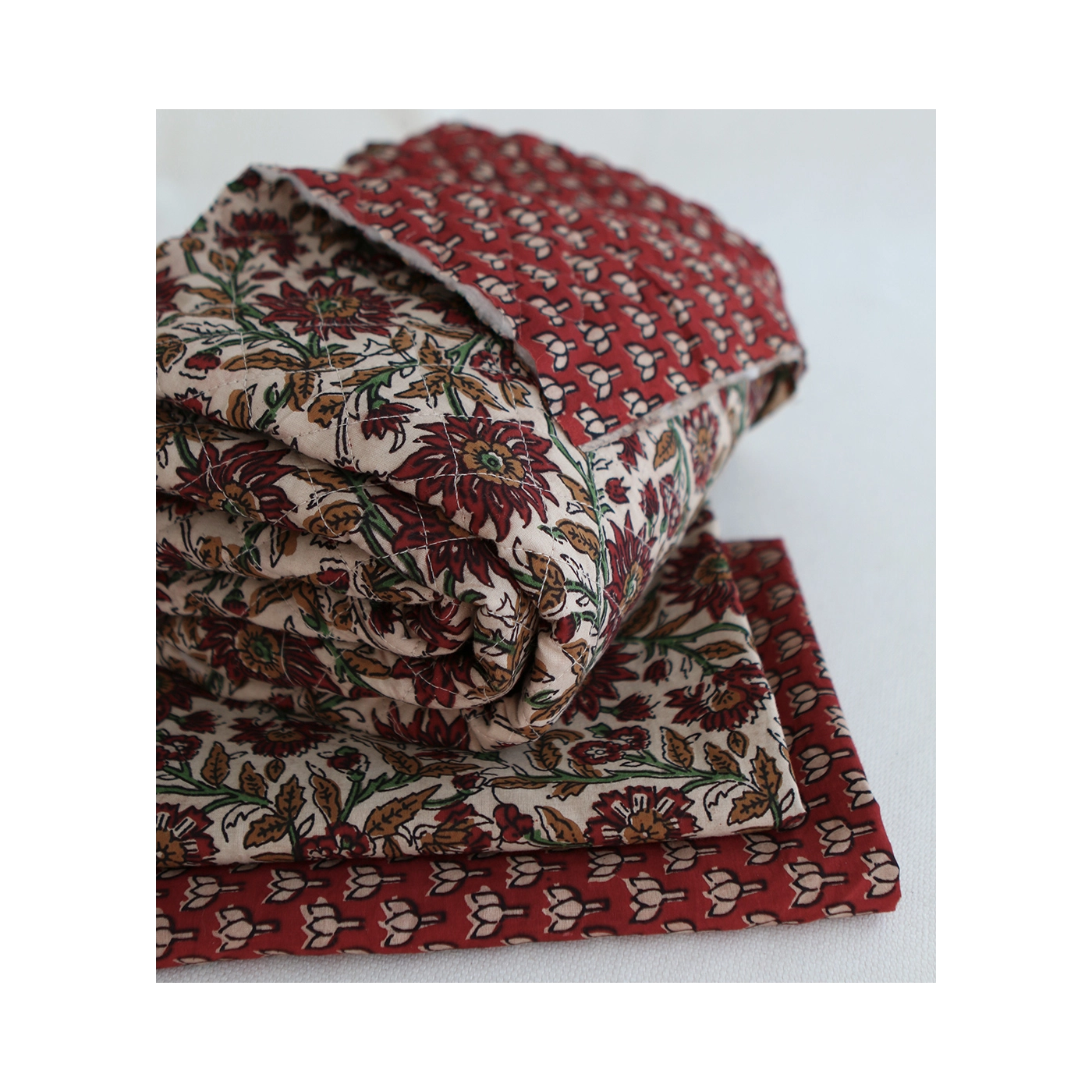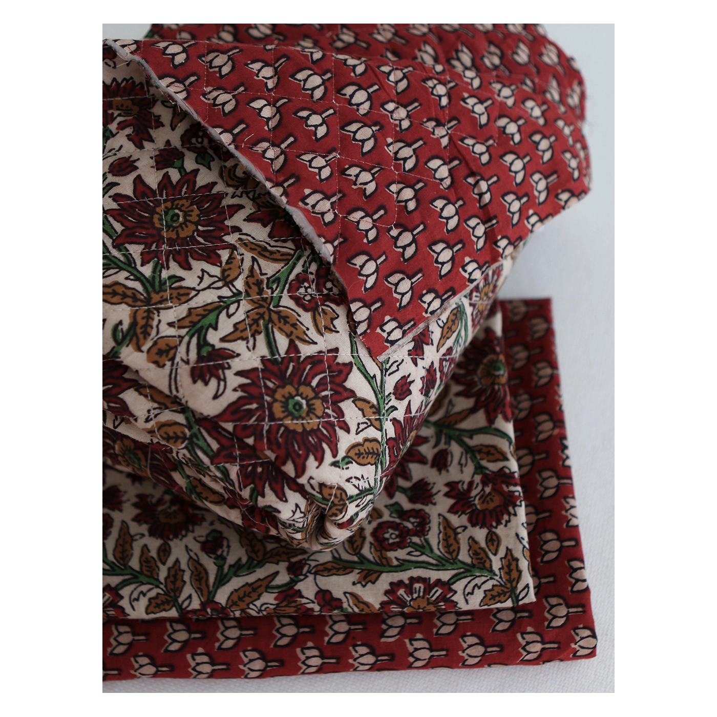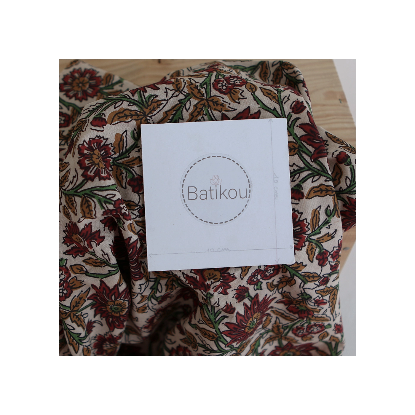 A noter que le processus artisanal (impression à la main, au tampon en bois) de ce tissu fait que chaque pièce est unique et que l'impression n'est pas aussi parfaite qu'un processus industriel.