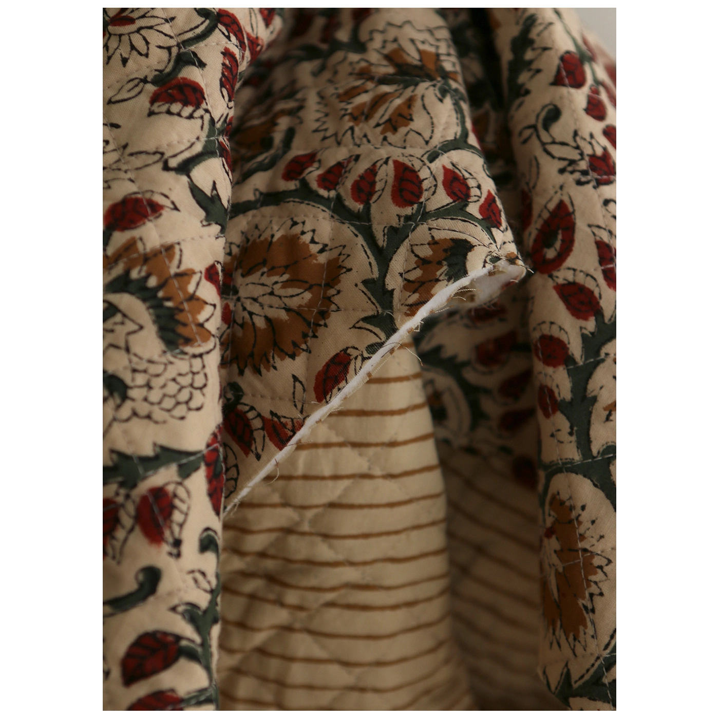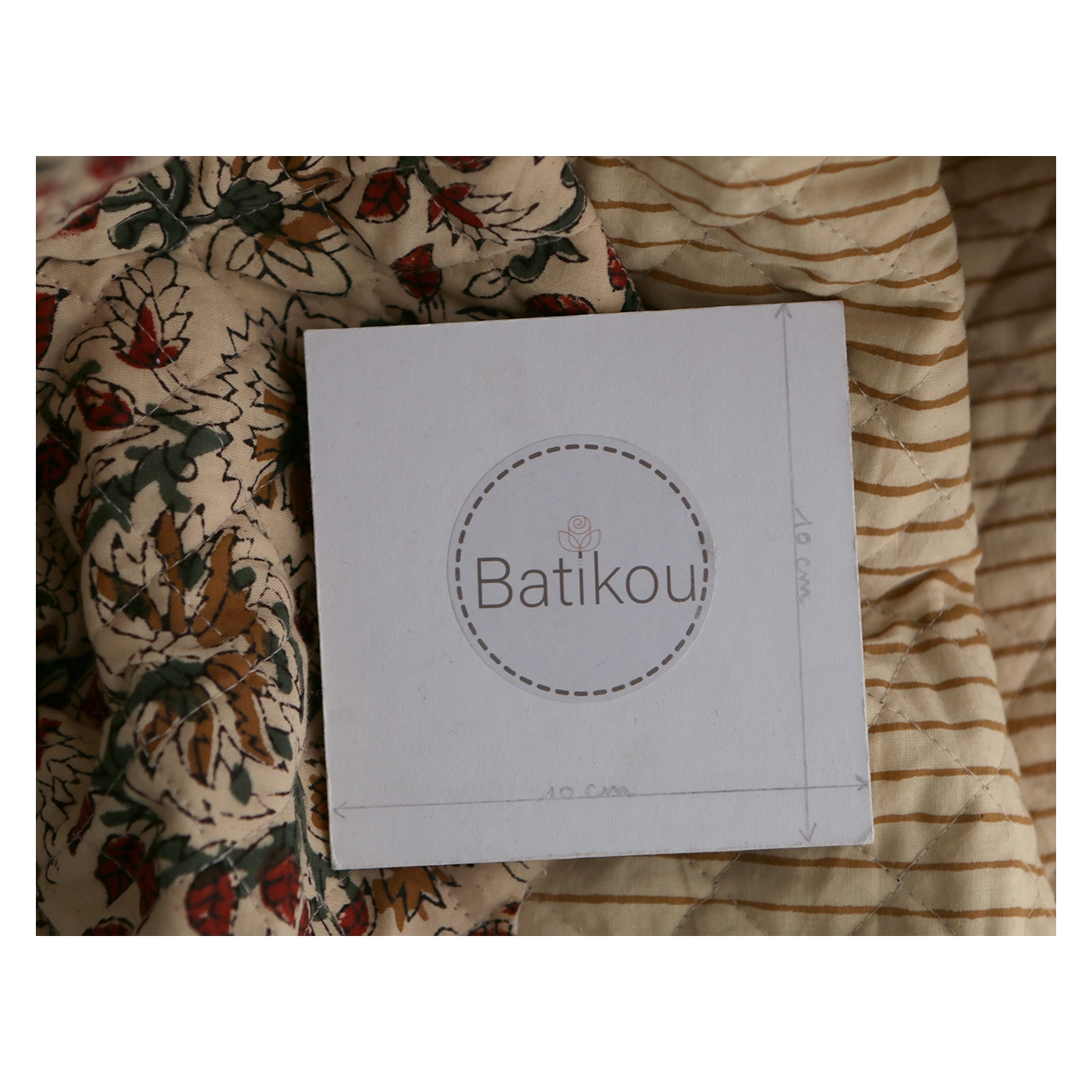 - A noter que le processus artisanal (impression à la main, au tampon en bois) de ce tissu fait que chaque pièce est unique et que l'impression et le matelassage ne sont pas aussi parfaits qu'un processus industriel.