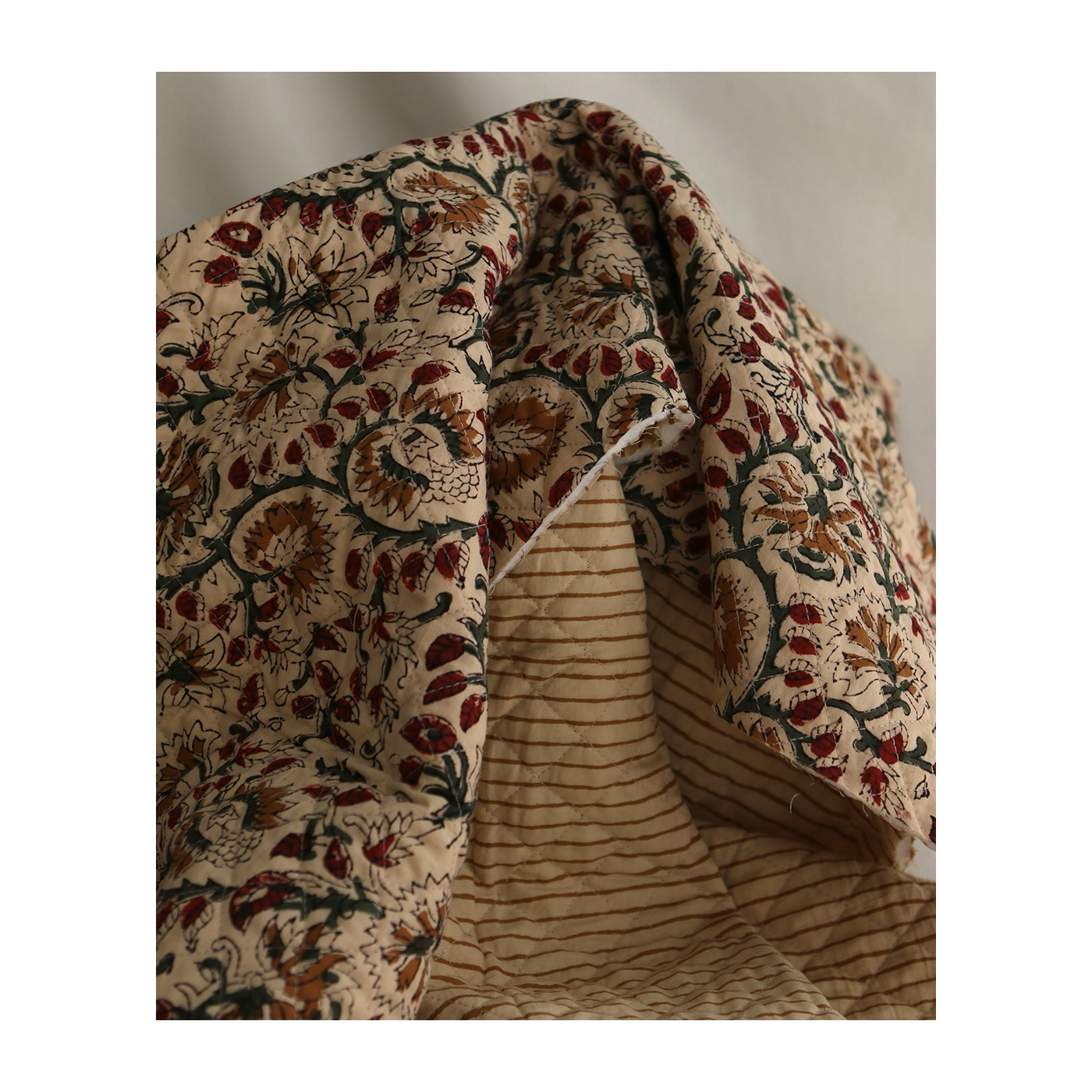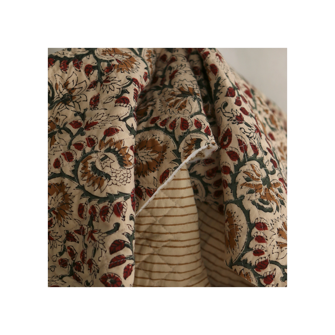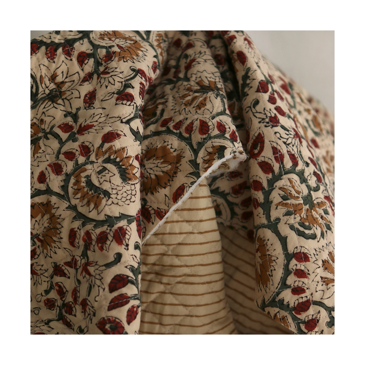 Nous avons décliné cette collection avec nos partenaires en Inde, afin de vous proposer pour le même motif le tissu en coton, et la version double face matelassée.