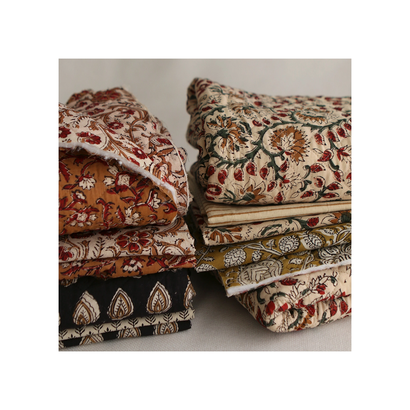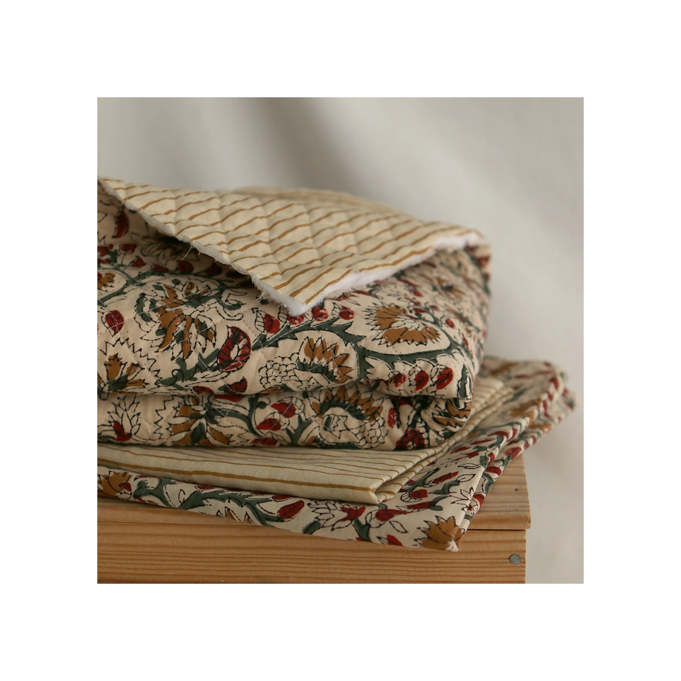 A noter que le processus artisanal (impression à la main, au tampon en bois) de ce tissu fait que chaque pièce est unique et que l'impression n'est pas aussi parfaite qu'un processus industriel.