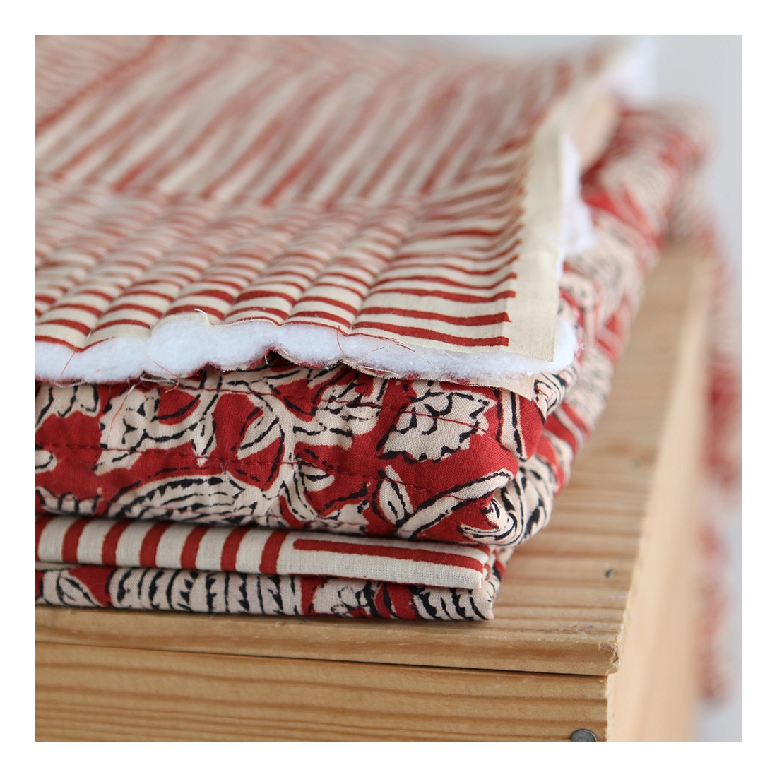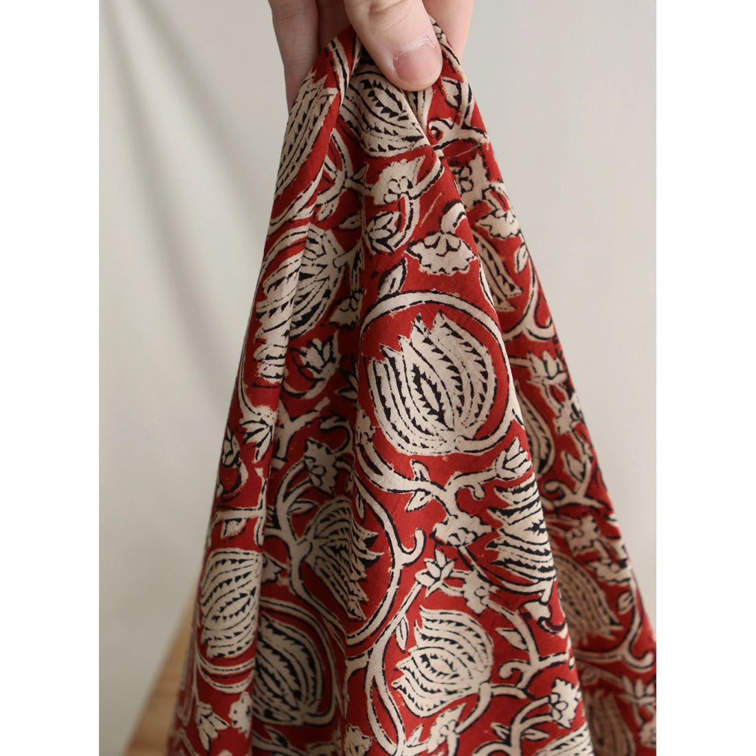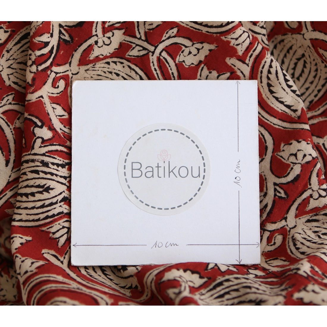 A noter que le processus artisanal (impression à la main, au tampon en bois) de ce tissu fait que chaque pièce est unique et que l'impression n'est pas aussi parfaite qu'un processus industriel.