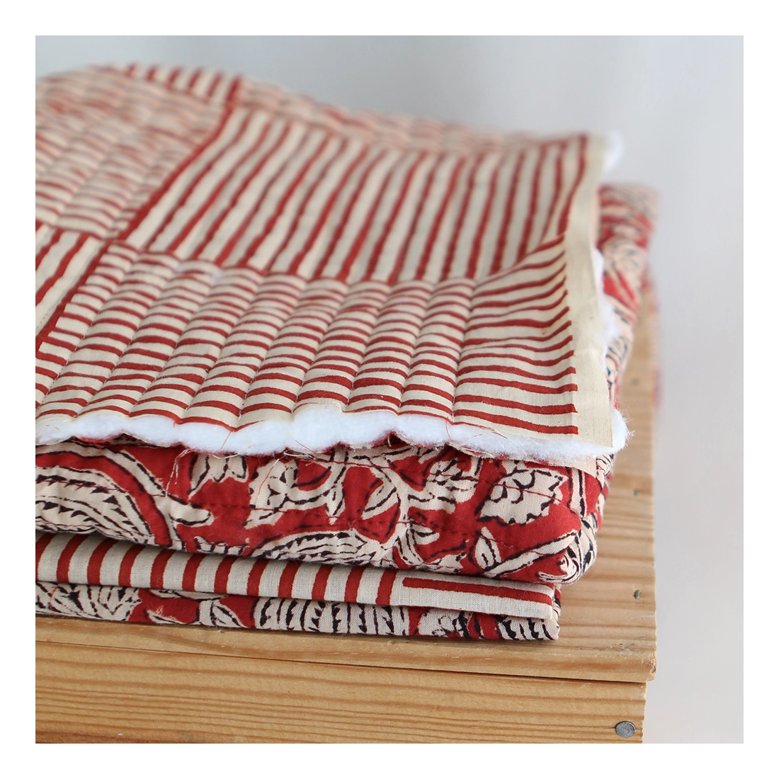 A noter que le processus artisanal (impression à la main, au tampon en bois) de ce tissu fait que chaque pièce est unique et que l'impression n'est pas aussi parfaite qu'un processus industriel.