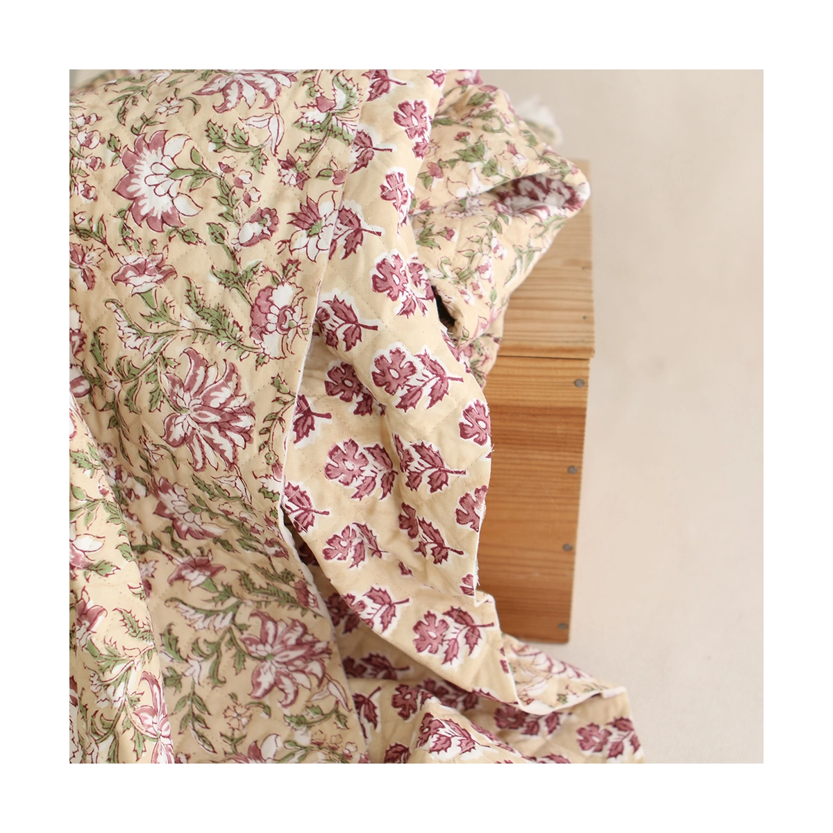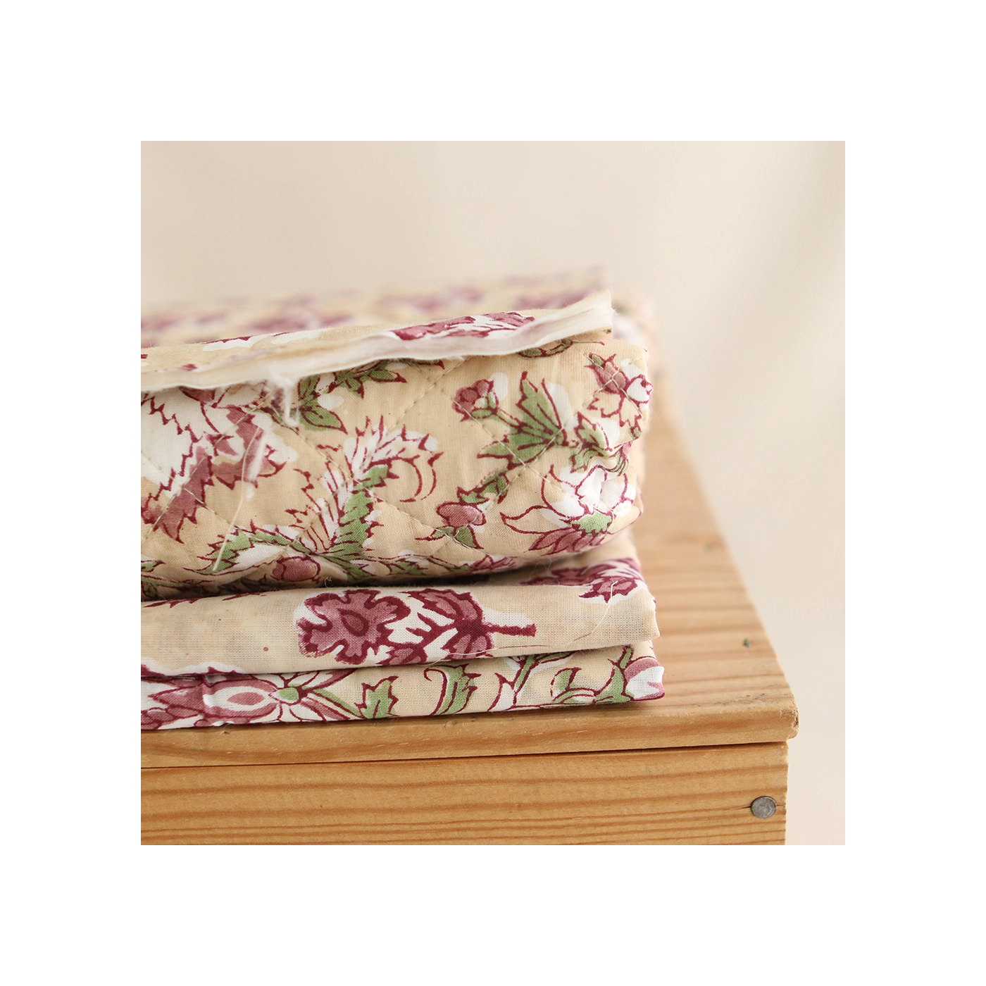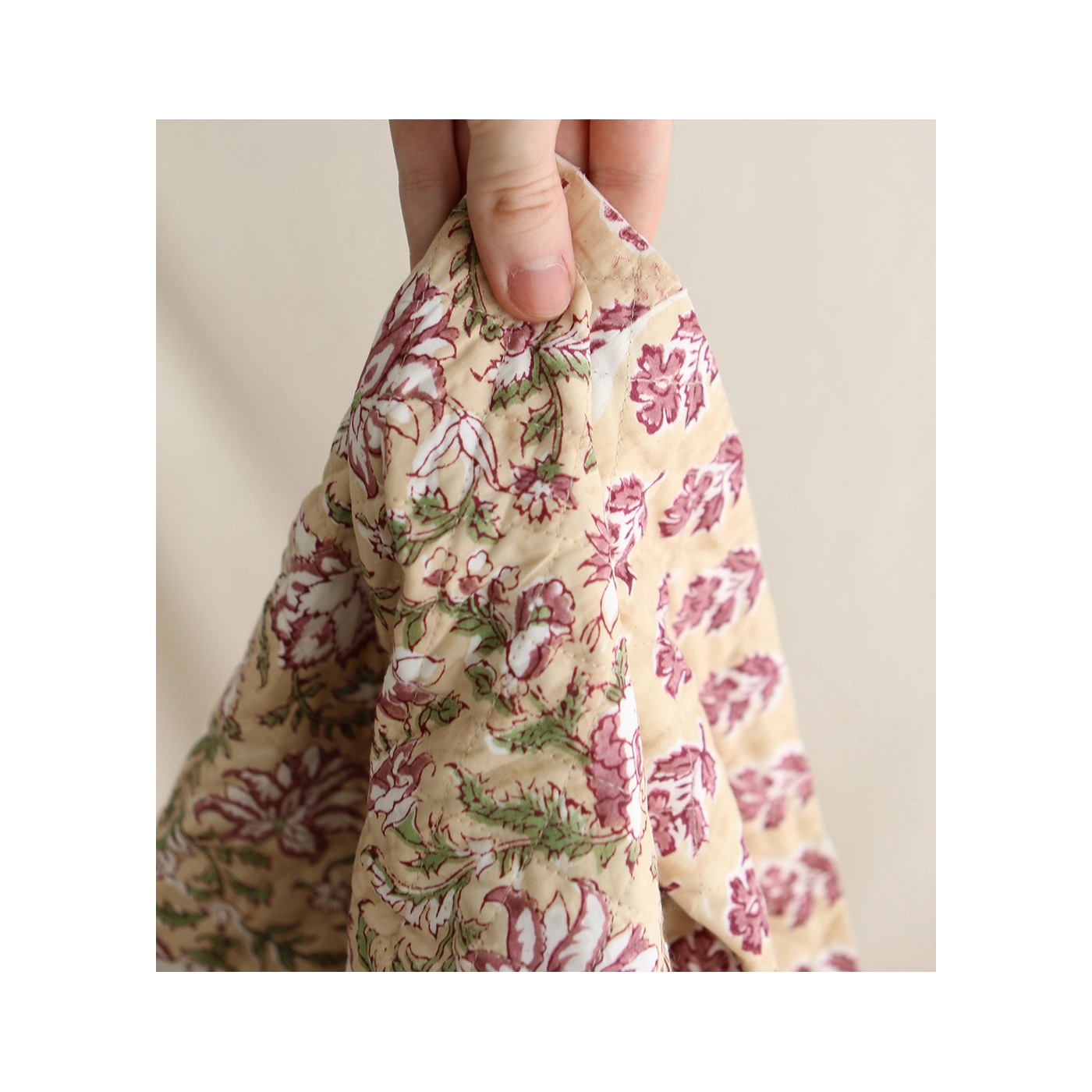 - A noter que le processus artisanal (impression à la main, au tampon en bois) de ce tissu fait que chaque pièce est unique et que l'impression et le matelassage ne sont pas aussi parfaits qu'un processus industriel.