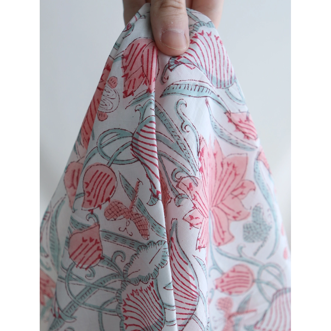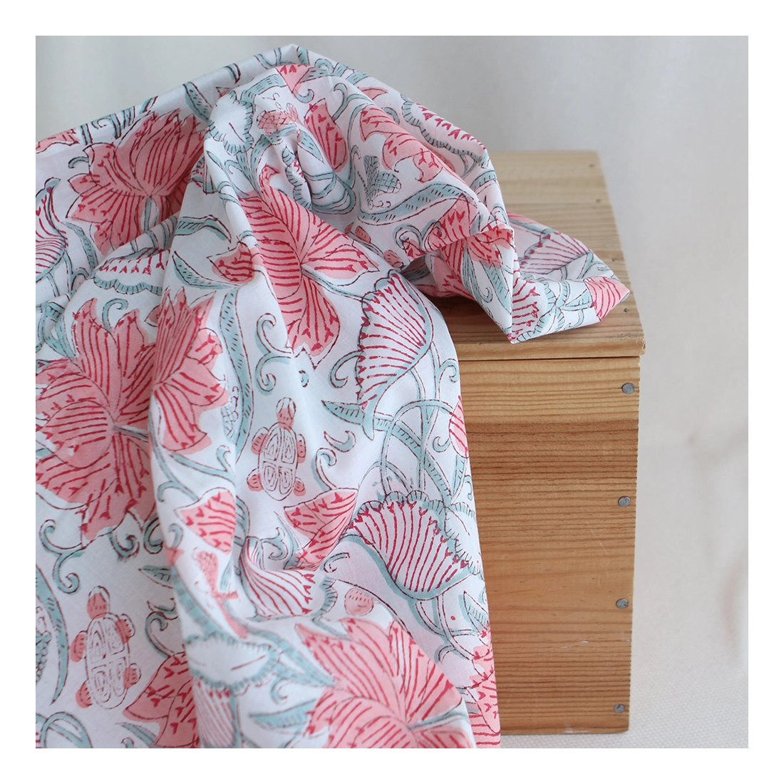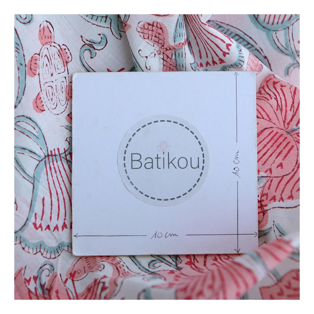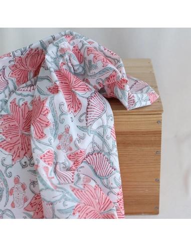 A noter que le processus artisanal (impression à la main, au tampon en bois) de ce tissu fait que chaque pièce est unique et que l'impression n'est pas aussi parfaite qu'un processus industriel.