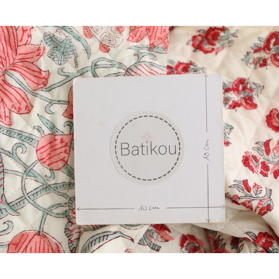 - A noter que le processus artisanal (impression à la main, au tampon en bois) de ce tissu fait que chaque pièce est unique et que l'impression et le matelassage ne sont pas aussi parfaits qu'un processus industriel.