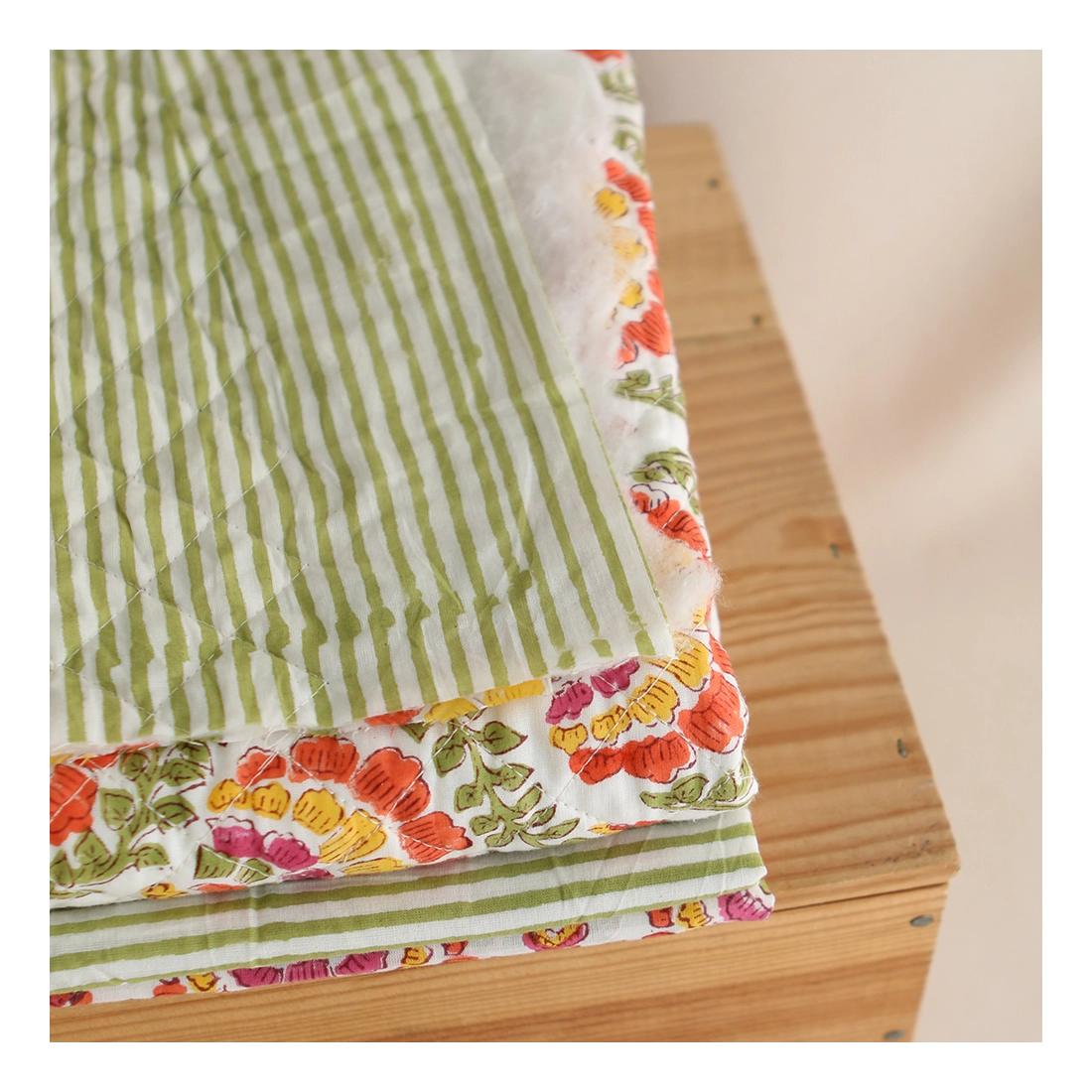 A noter que le processus artisanal (impression à la main, au tampon en bois) de ce tissu fait que chaque pièce est unique et que l'impression n'est pas aussi parfaite qu'un processus industriel.