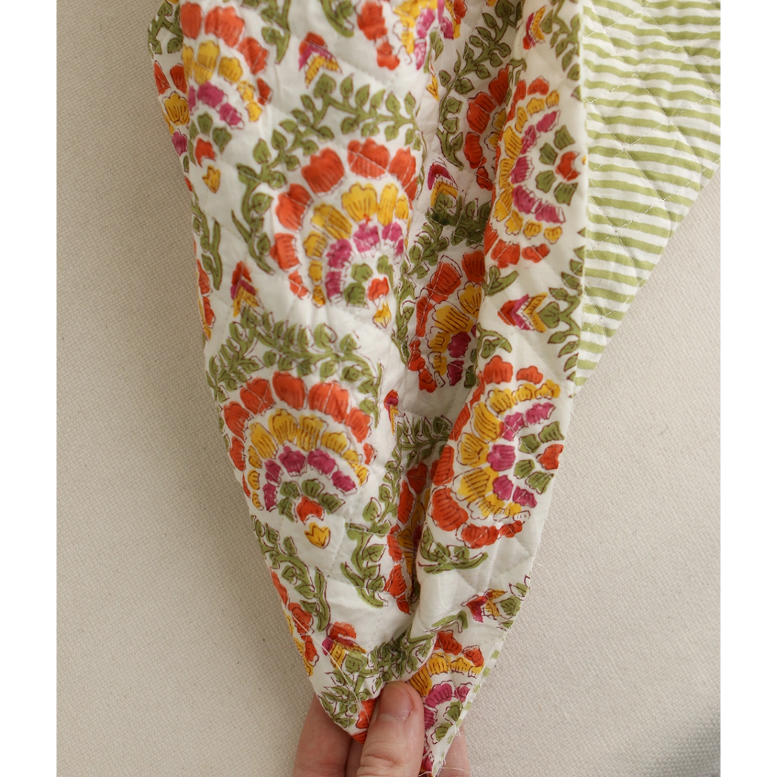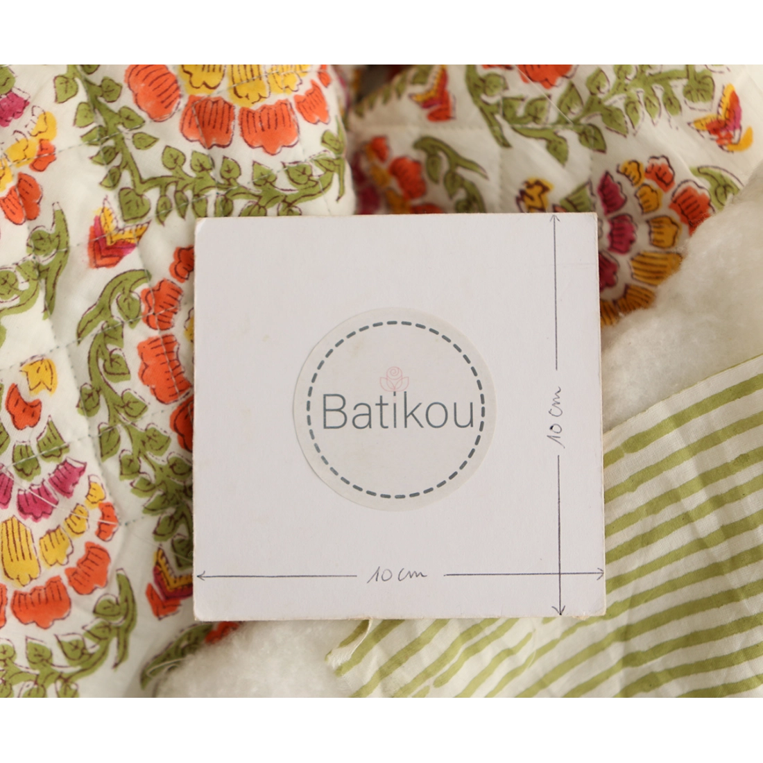 - A noter que le processus artisanal (impression à la main, au tampon en bois) de ce tissu fait que chaque pièce est unique et que l'impression et le matelassage ne sont pas aussi parfaits qu'un processus industriel.