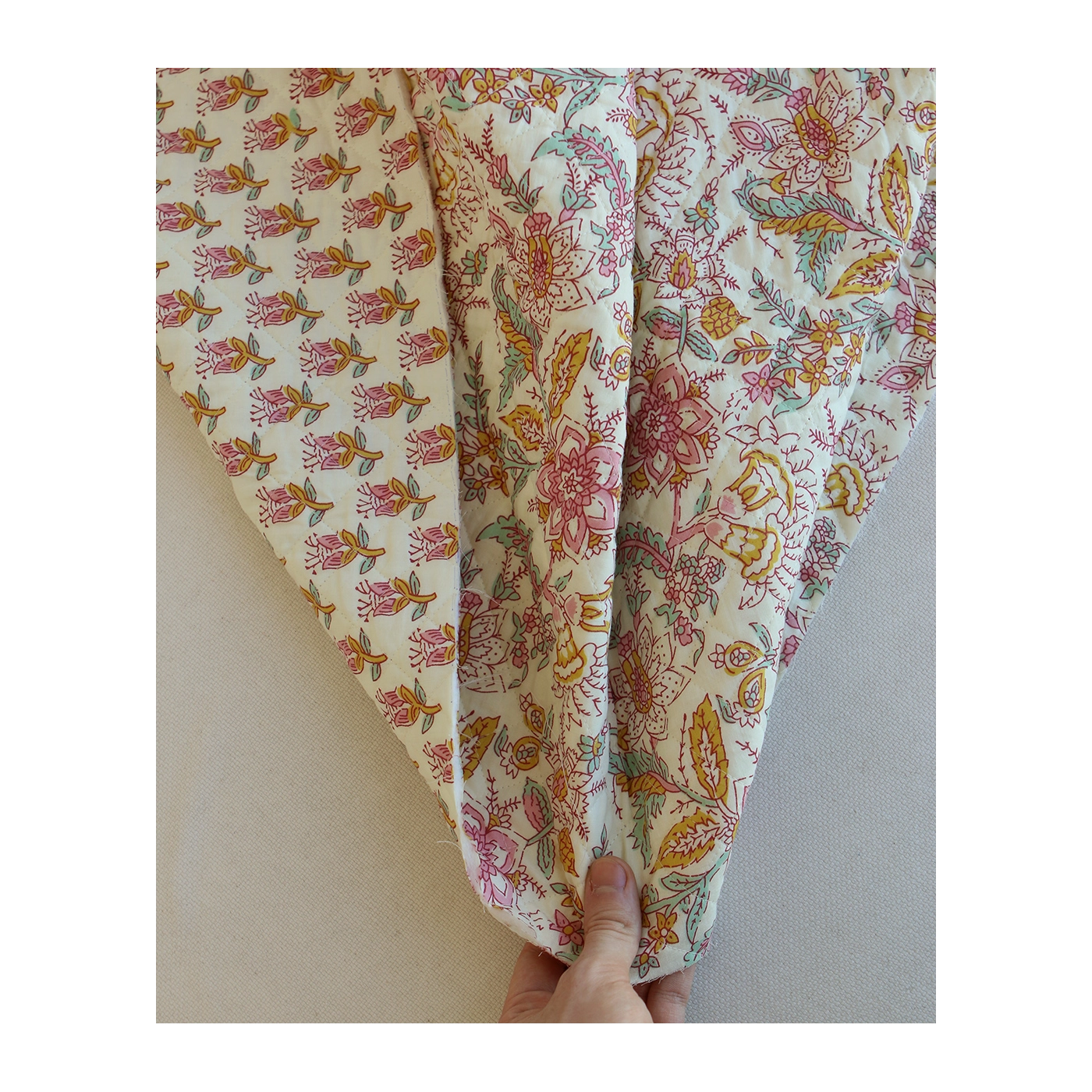 Nous avons décliné cette collection avec nos partenaires en Inde, afin de vous proposer pour le même motif le tissu en coton, et la version double face matelassée.