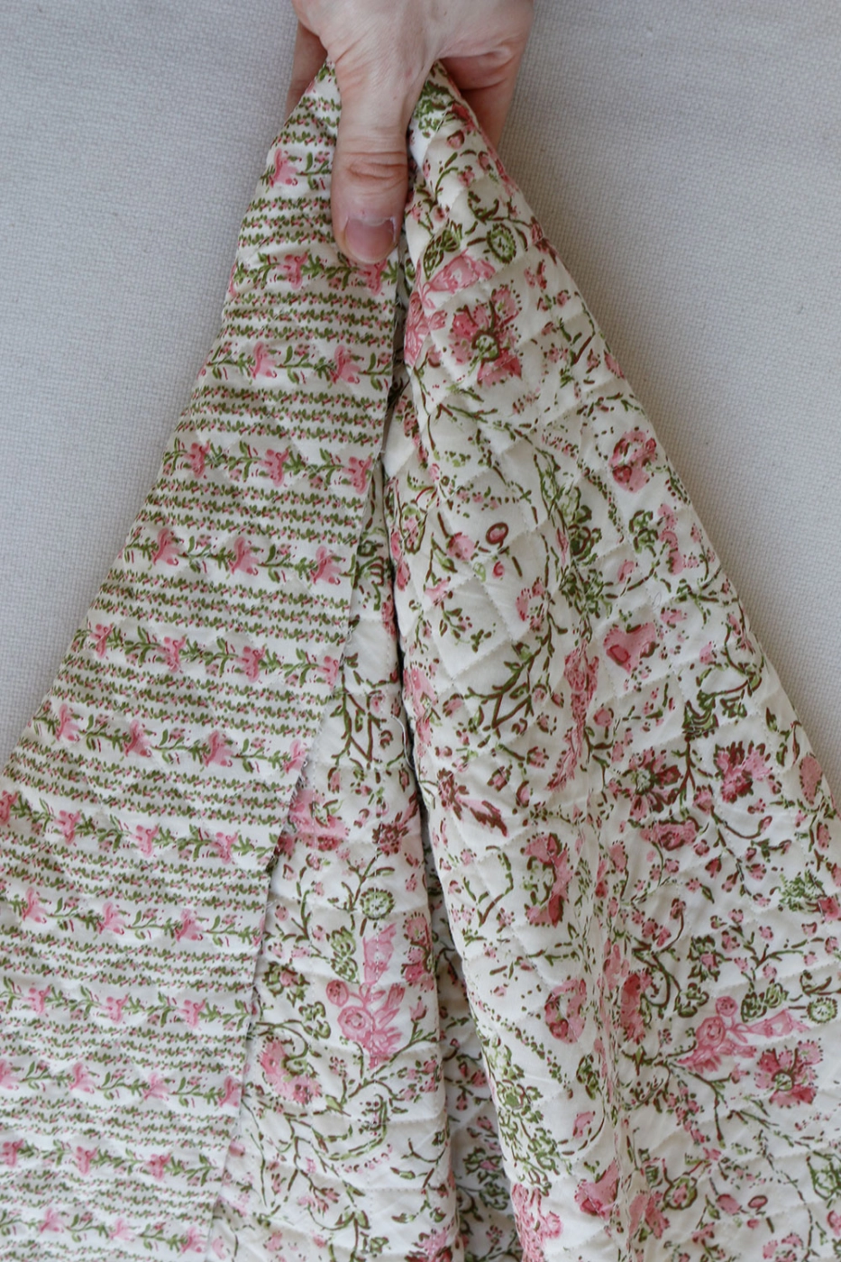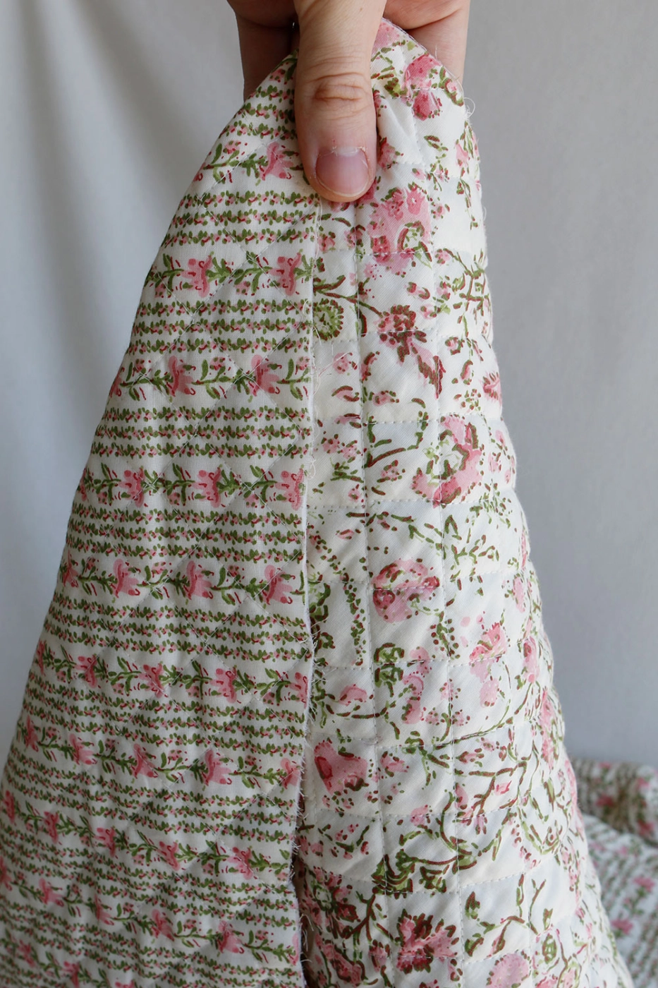 - A noter que le processus artisanal (impression à la main, au tampon en bois) de ce tissu fait que chaque pièce est unique et que l'impression ET le matelassage ne sont pas aussi parfaits qu'un processus industriel.