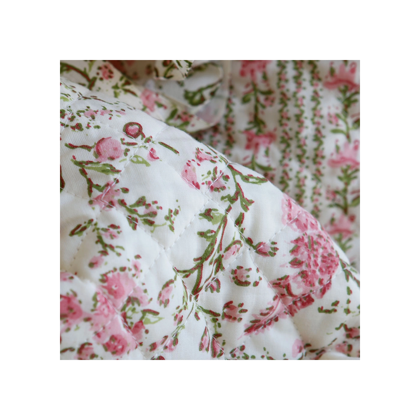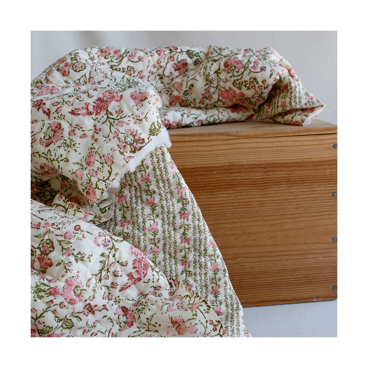 Nous avons décliné cette collection avec nos partenaires en Inde, afin de vous proposer pour le même motif le tissu en coton, et la version double face matelassée.